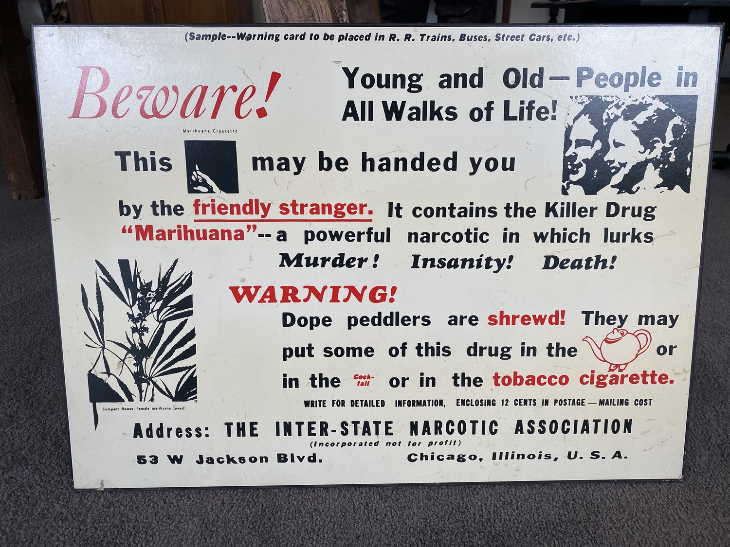 Designed for public display in trains, buses etc, this poster smacks of the early fears of marijuana in the USA.