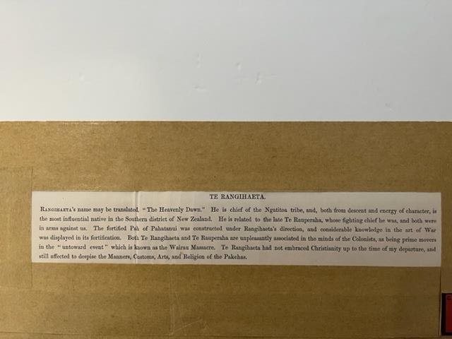 RANGIHAETA'S name may be translated, "The Heavenly Dawn." He is chief of the Ngatitoa tribe, and, both from descent and energy of character, is the most influential native in the Southern District of New Zealand. He is related to the late Te Rauperaha, whose fighting chief he was, and both were in arms against us. The fortified Pah of Pahatanui was constructed under Rangihaeta's direction, and considerable knowledge in the art of War was displayed in its fortification. Both Te Rangihaeta and Te Rauperaha are unpleasantly associated in the minds of the Colonists, as being prime movers in the "untoward event" which is known as the Wairau Massacre. Te Rangihaeta had not embraced Christianity up to the time of my departure and still affected to despise the Manners, Customs, Arts, and Religion of the Pakehas.
