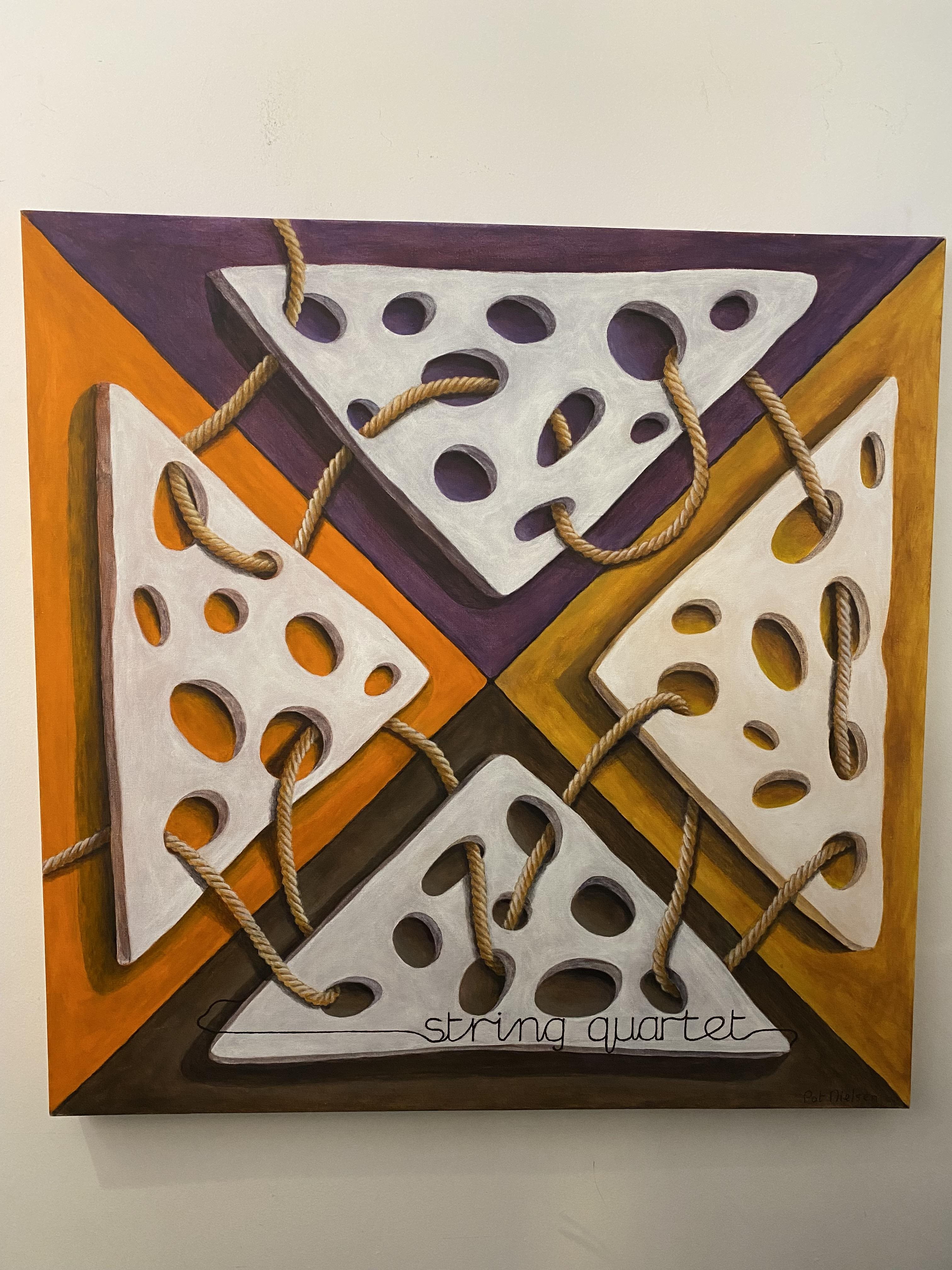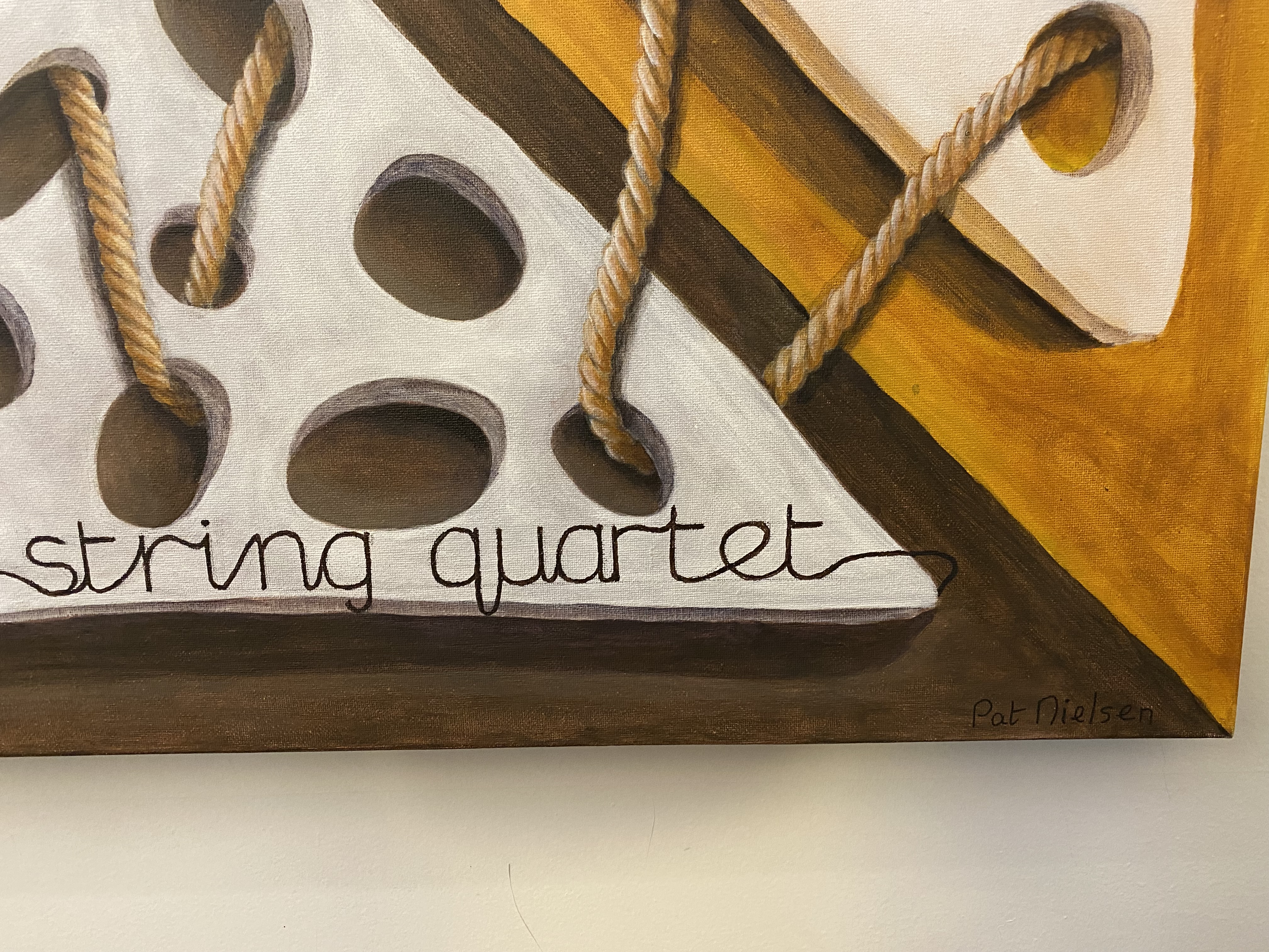 Four perforated triangular shapes intricately linked by rope on colourful quadrants.