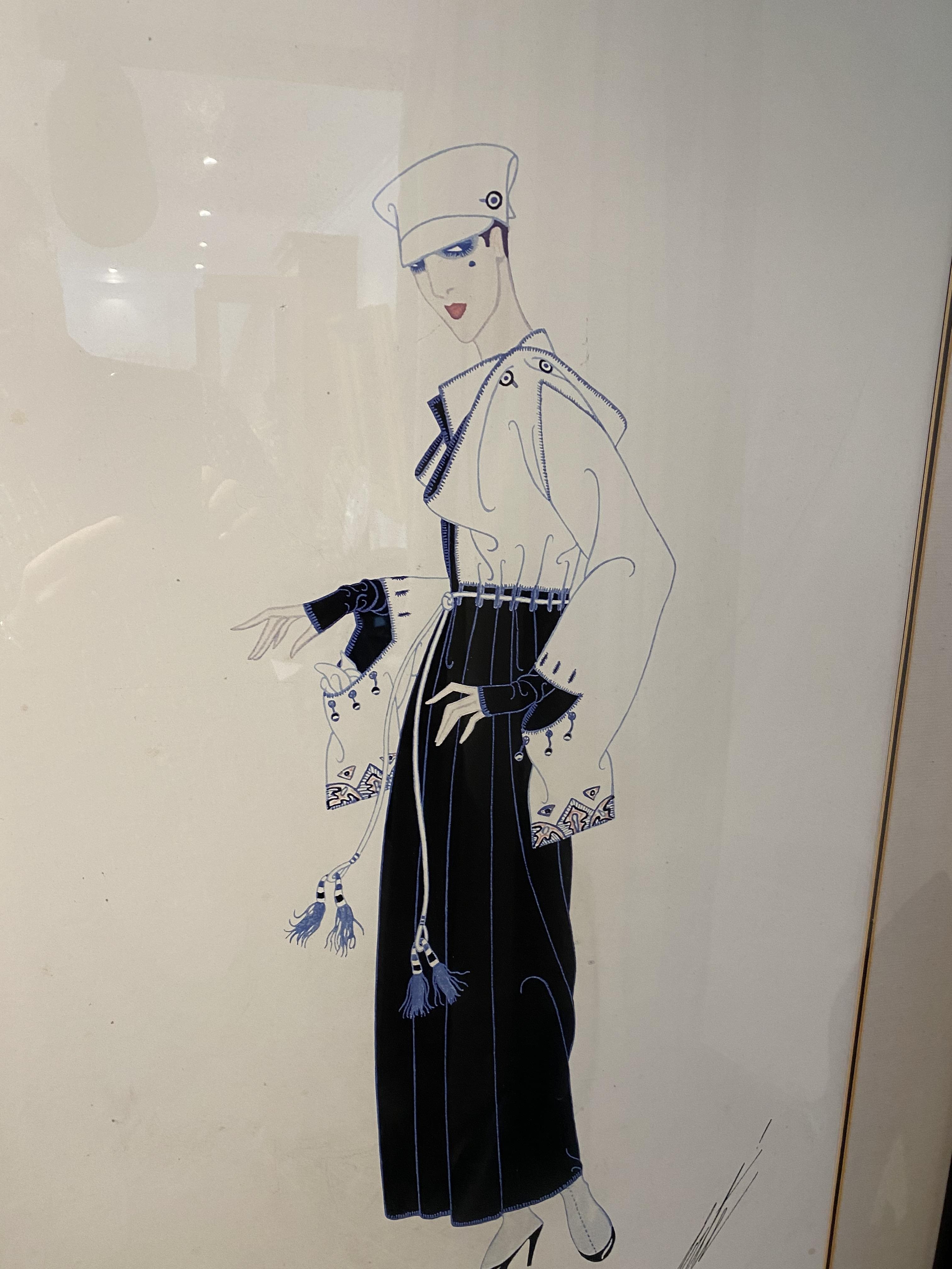 Erté is perhaps most famous for his elegant fashion designs which capture the art deco period in which he worked. One of his earliest successes was designing apparel for the French dancer Gaby Deslys who died in 1920. His delicate figures and sophisticated, glamorous designs are instantly recognisable, and his ideas and art still influence fashion into the 21st century. His costumes, programme designs, and sets were featured in the Ziegfeld Follies of 1923, many productions of the Folies Bergère, Bal Tabarin, Théâtre Fémina, Le Lido and George White's Scandals.On Broadway, the celebrated French chanteuse Irène Bordoni wore Erté's designs.