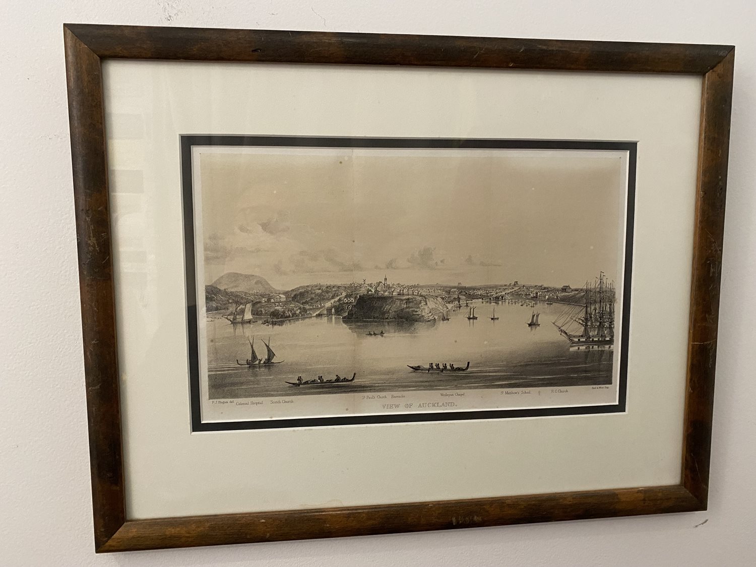 Professionally framed, (in New York of all places!), 19th century view of Auckland showing the Colonial Hospital, Scotch Church, St Paul's Church, Barraks, Wesleyan Chapel, St Matthew's School, R.C Church