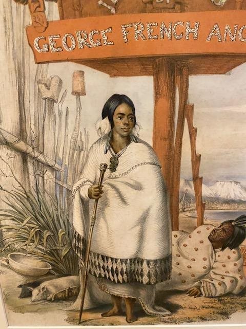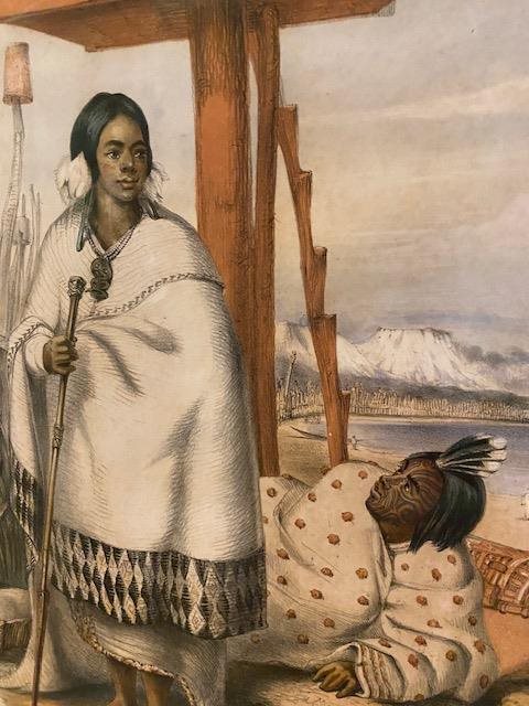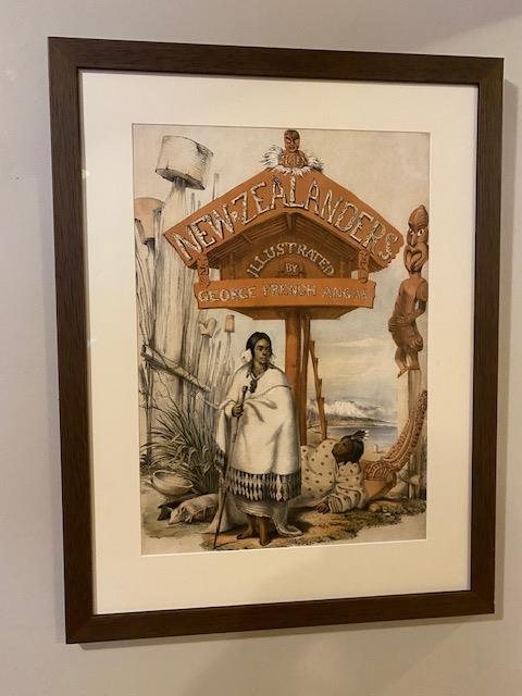 The publication contained a number of hand coloured tinted lithographs however this front cover had additional hand colouring .Professionally framed and in excellent condition for its age. A copy of the entire book is in the National Rare Book Collection in Te Papa.