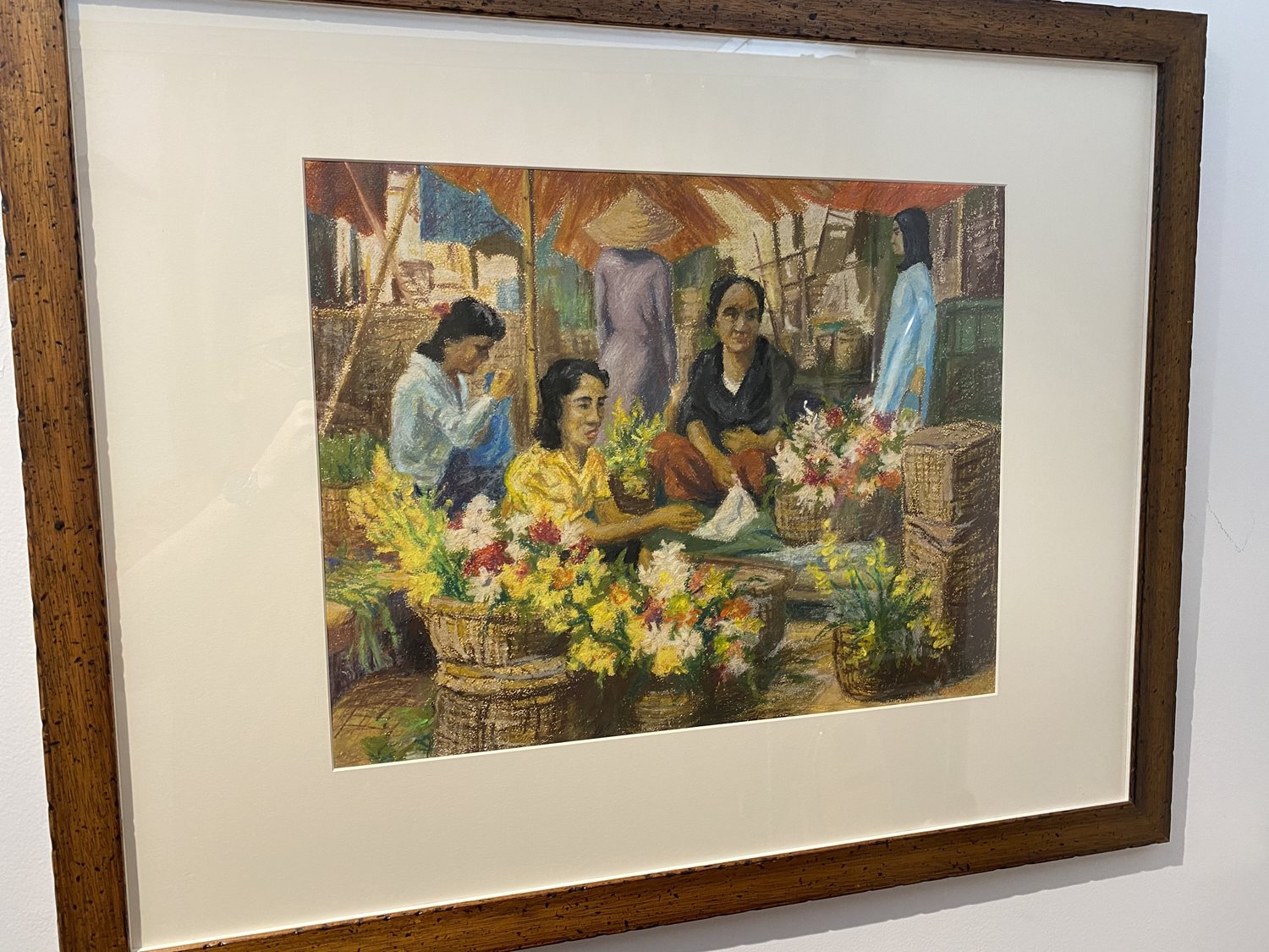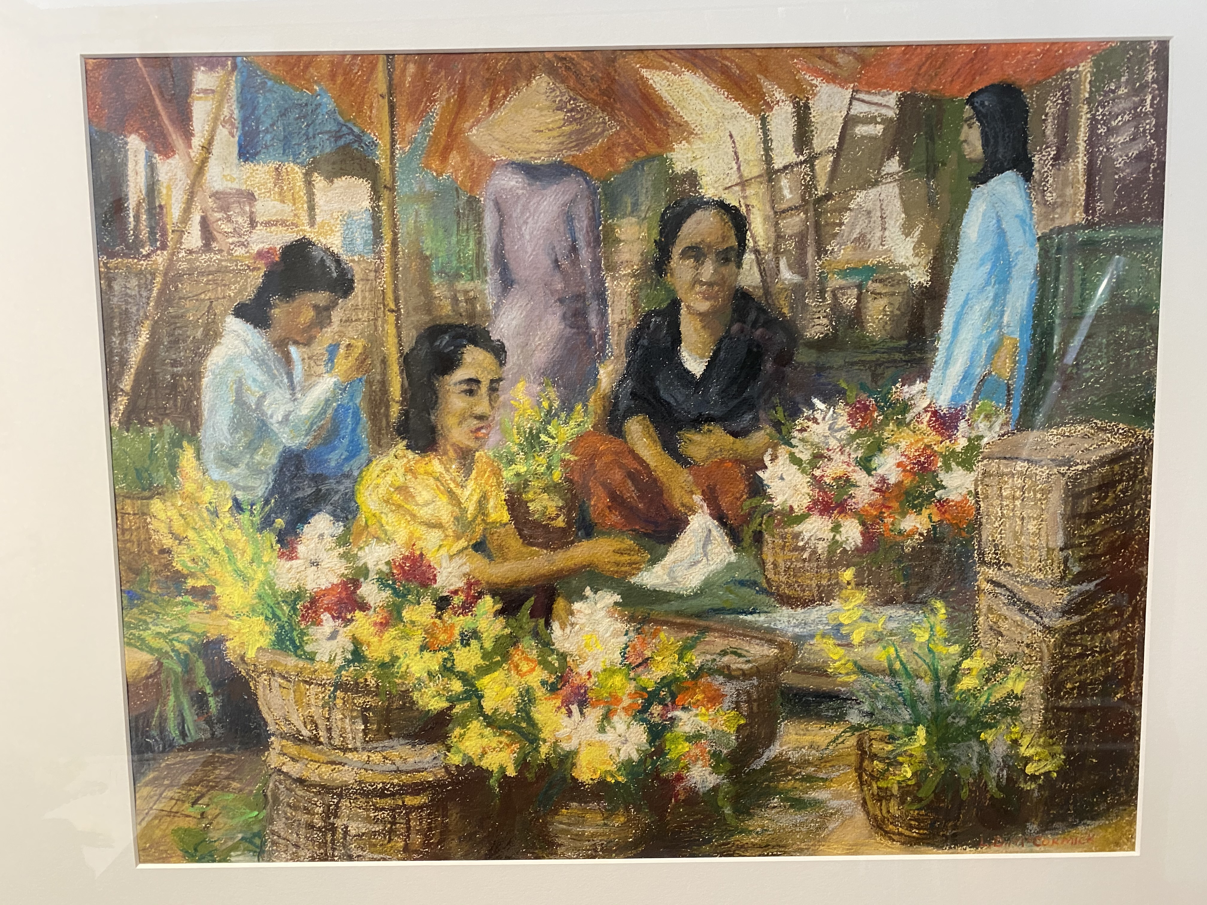 Contemporary and colourful pastel of an Asian Flower Market Scene by L.D.McCormick. Dated 2010