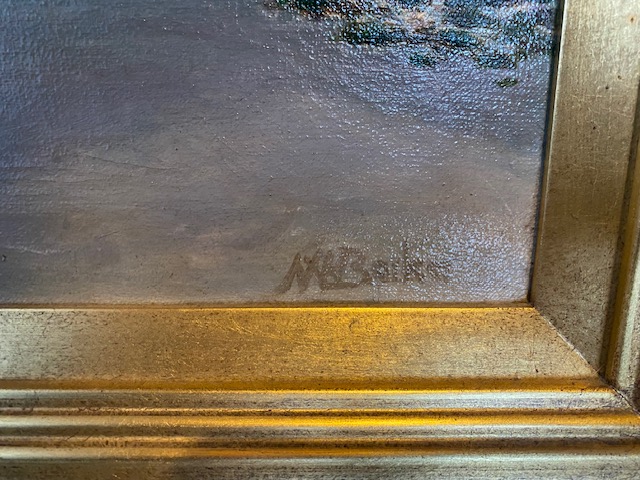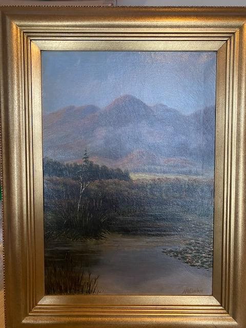 Neville W Barker was an active artist from 1887 to 1913. This a a lovely landscape oil on canvas, of a New Zealand river and mountains. It is in lovely condition given it is up to 130 years old. Reframed in a lovely gold wooden frame.
