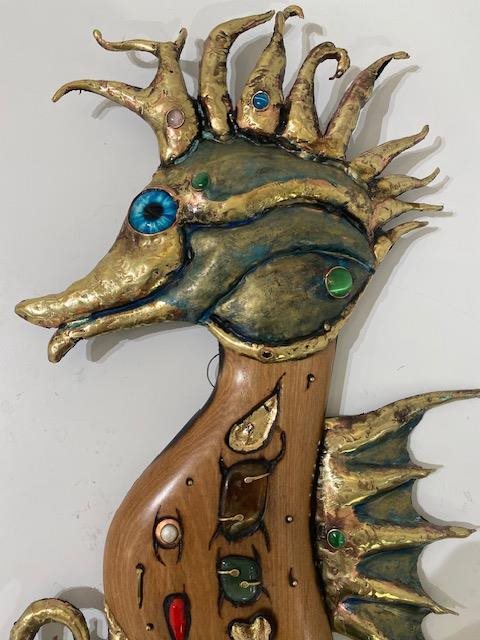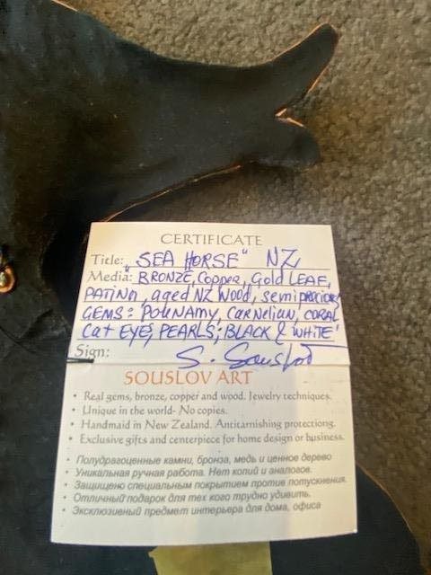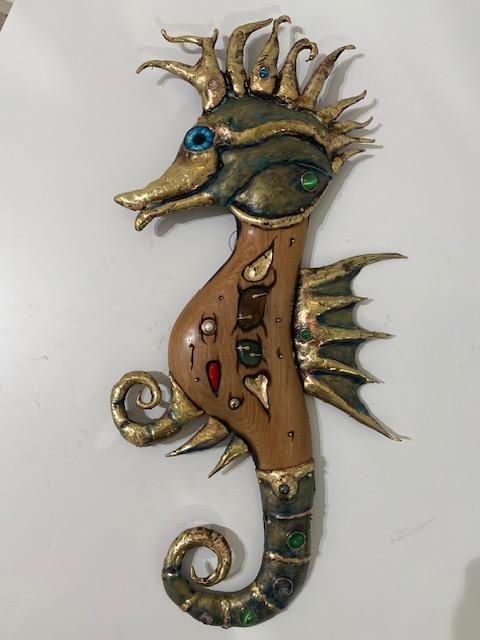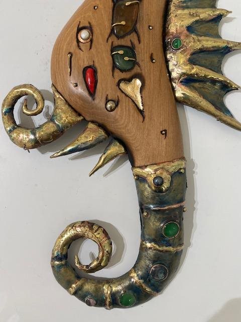 This is a unique and decorative wall hanging constructed using jewellrey techniques.. A "one-off" and hand made in New Zealand by Souslov Art. Comprises Bronze, Copper, Gold Leaf, Semi-precious gems, Pounmay, Carnelian coral, Pearls and Aged New Zealand Wood.