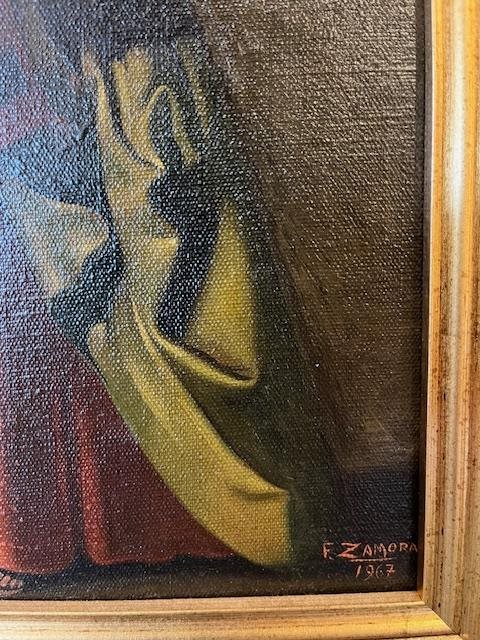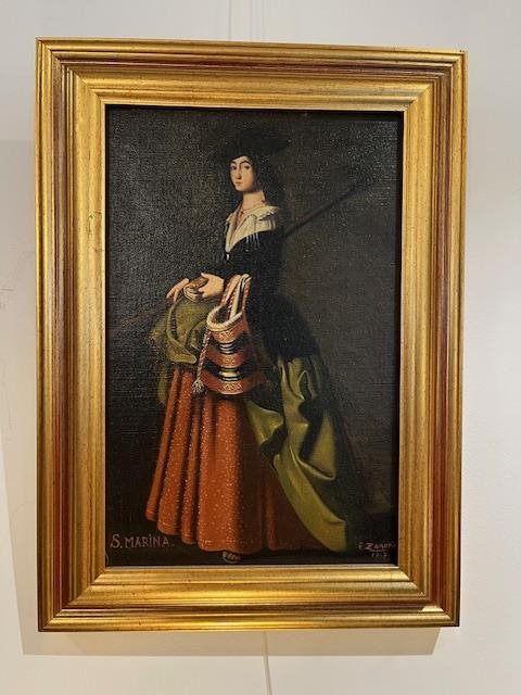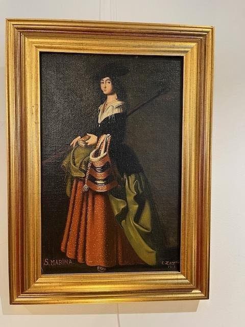 Saint Marina of Aguas Santas as a Shepherdess, depicted with shepherd's crook and saddle bag, after the original by Francisco de Zurbaran (Spain, 1598-1664), signed by Frank Zamora.