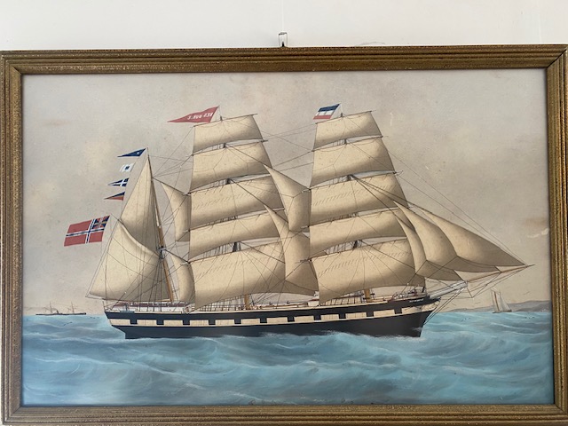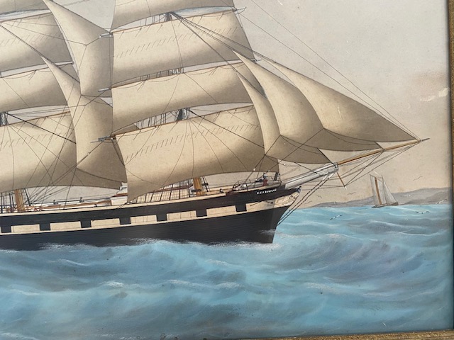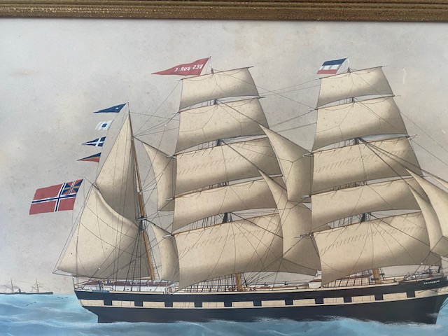 This is a masterful original watercolour of the clipper ship "Resource", under full sail and flying the Norwegian and Dutch Tall ships flag.