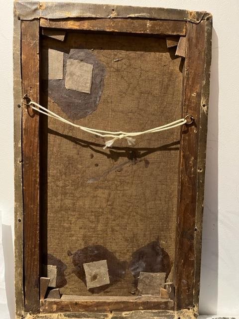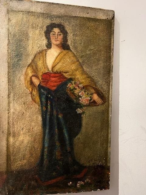 A very old oil painting on canvas of a woman with a basket of flowers. A unique decorative piece.