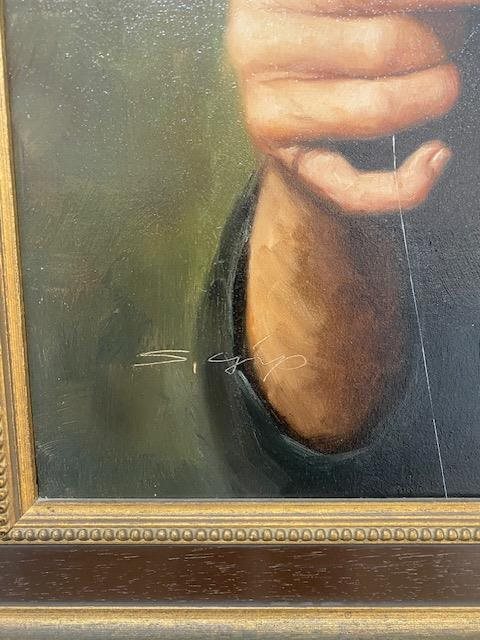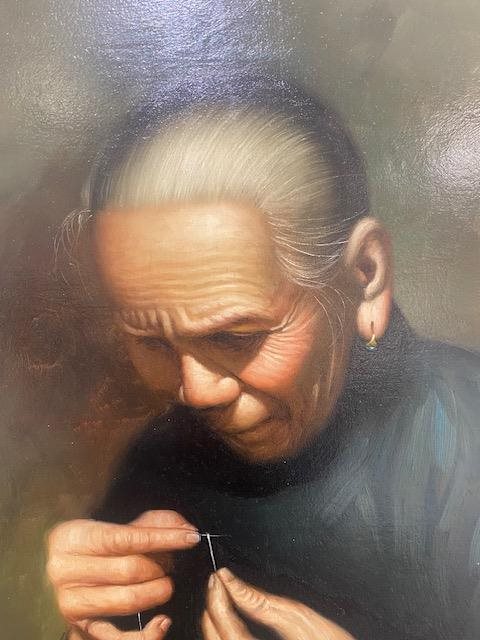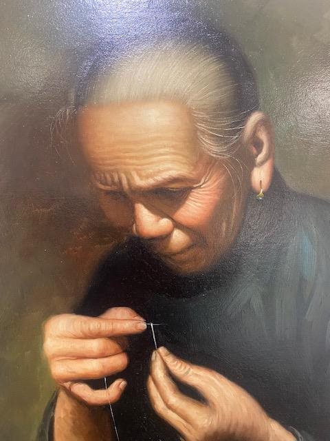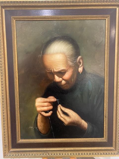 The detail in this original, signed, oil painting is masterful. The concentration of this lady threading a needle, is beautifully reproduced on the canvas.
