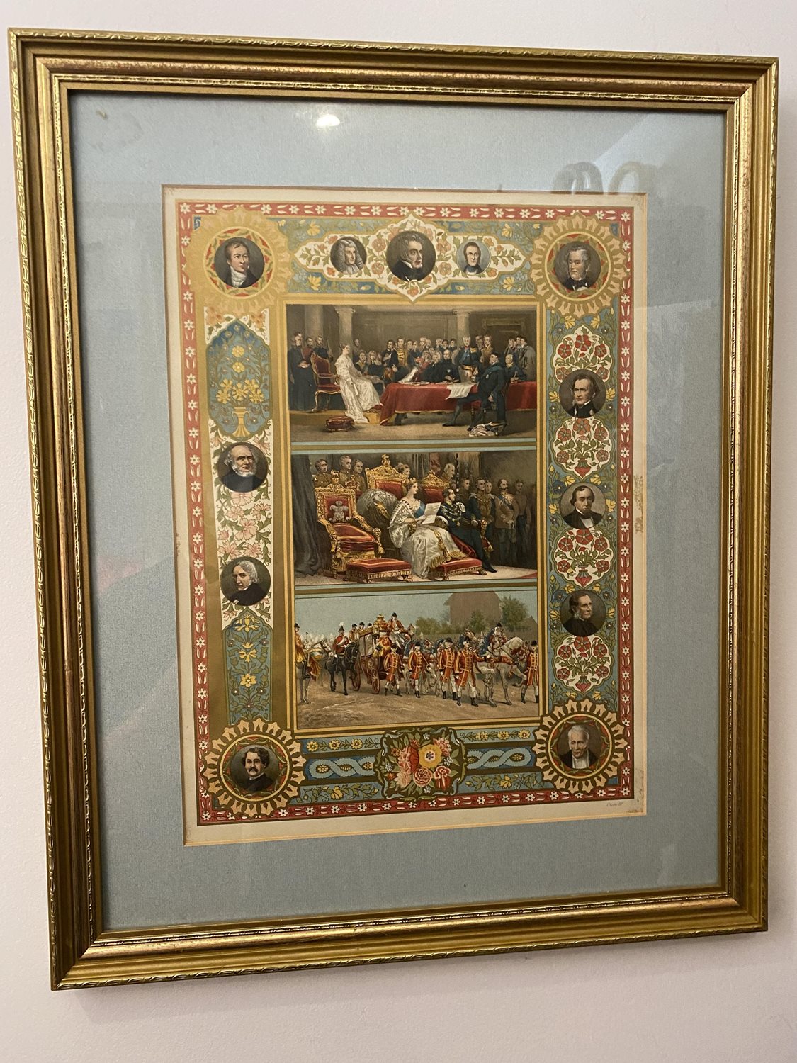 Original poster showing a triptych of paintings of Queen Victoria including her opening Parliament. Surrounded by the 10 Prime Minsters of her reign being The Marquis of Sailsbury, The Earl of Sailsbury, The Earl of Beaconsfield, Mr Gladstone, The Earl of Aberdeen, Earl Russell, The Earl of Derby, Vicount Palmerston, Sir Robert Peel, Vicount Melbourne. Circa 1901.
