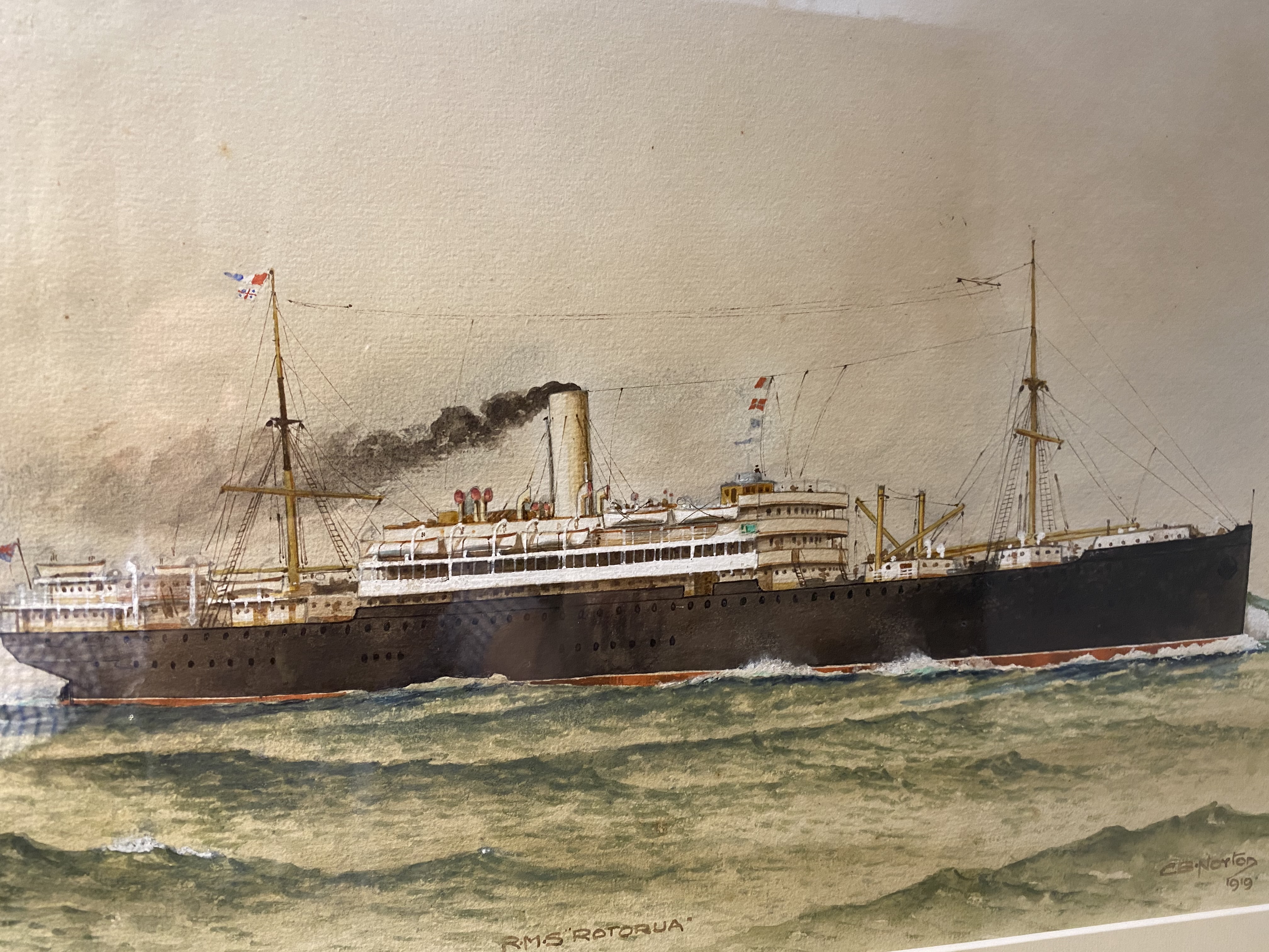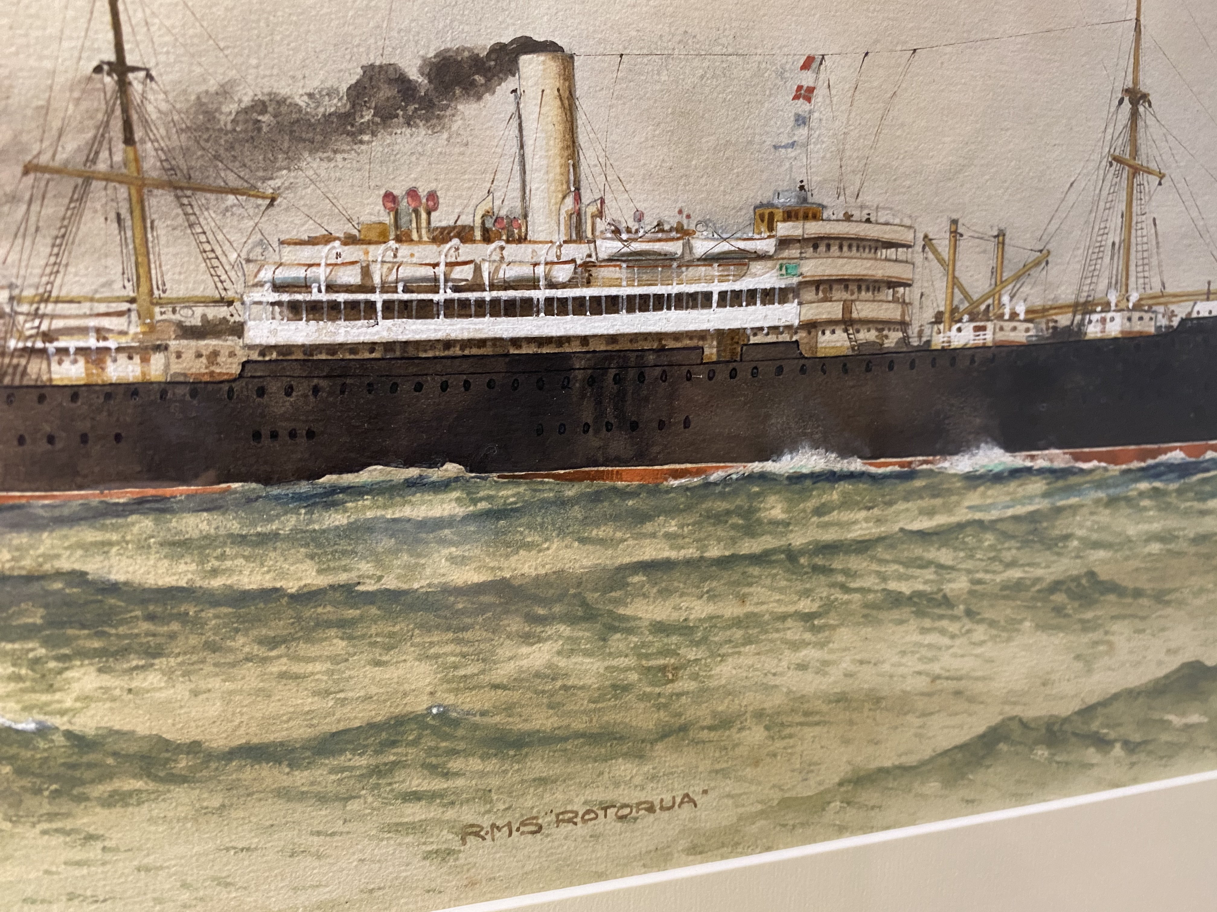 There were 2 ships of this name operated by the New Zealand Shipping Company. Both were sunk during the World Wars by German U boats; one in 1917 and the second in 1940. We believe this is of the first ship which was sunk 2 years before the date on this painting. The second RMS Rotorua was formerly named the Shropshire and had 4 masts as opposed to this one with 2. Both vessels were launched in 1910.