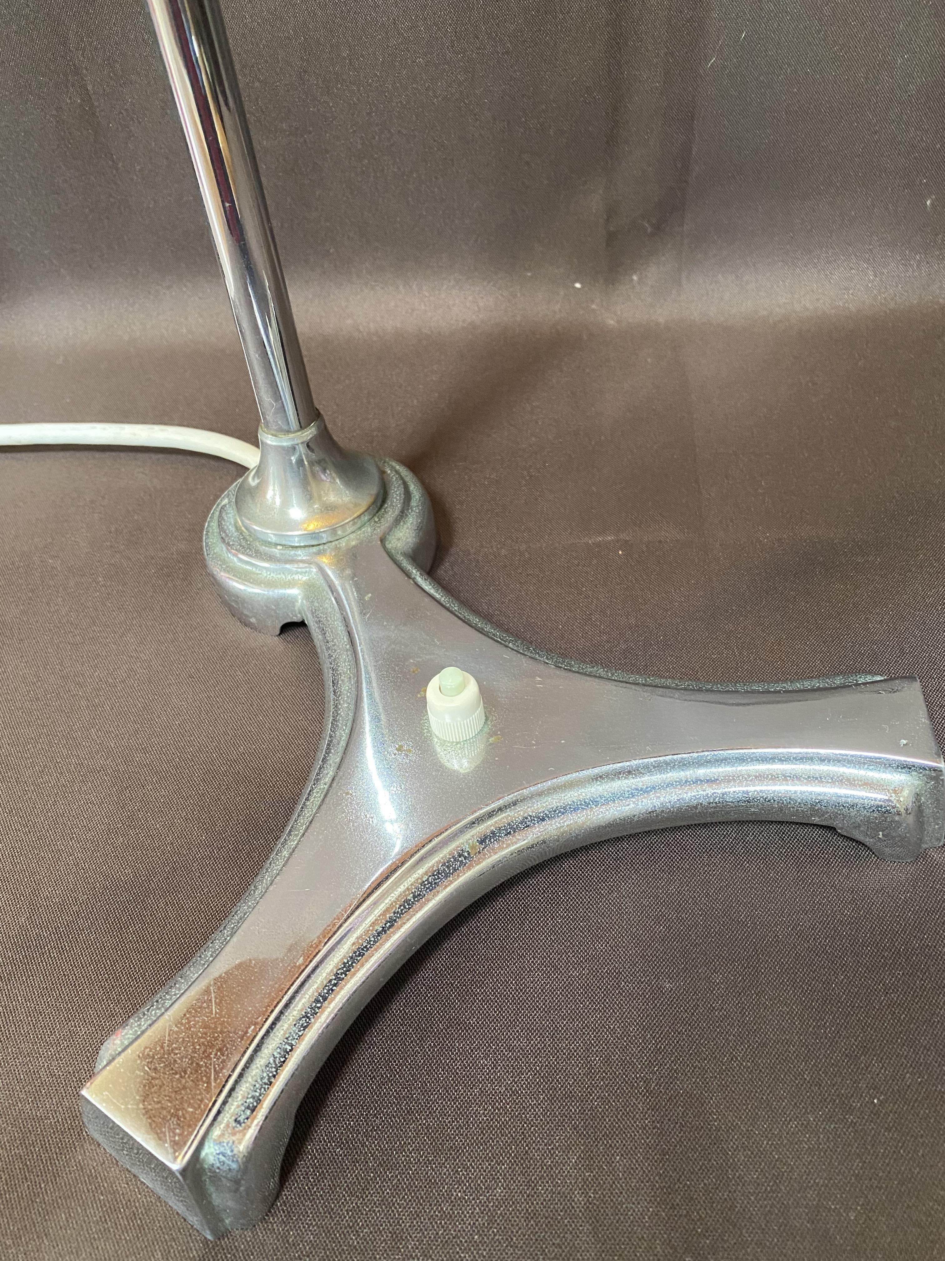 Well made from cast metal and chromed, the head swivels on the arm and the shade rotates as well.