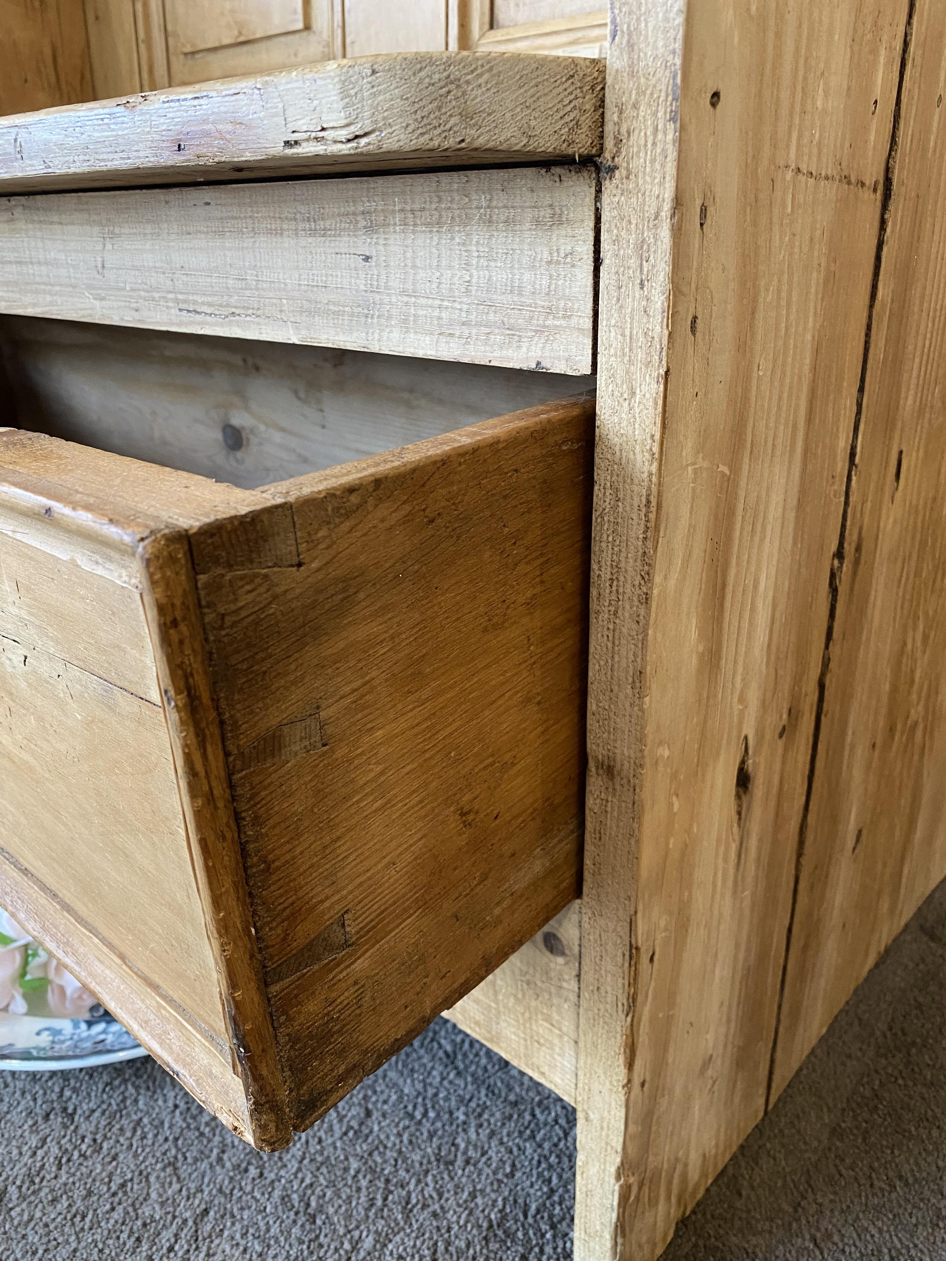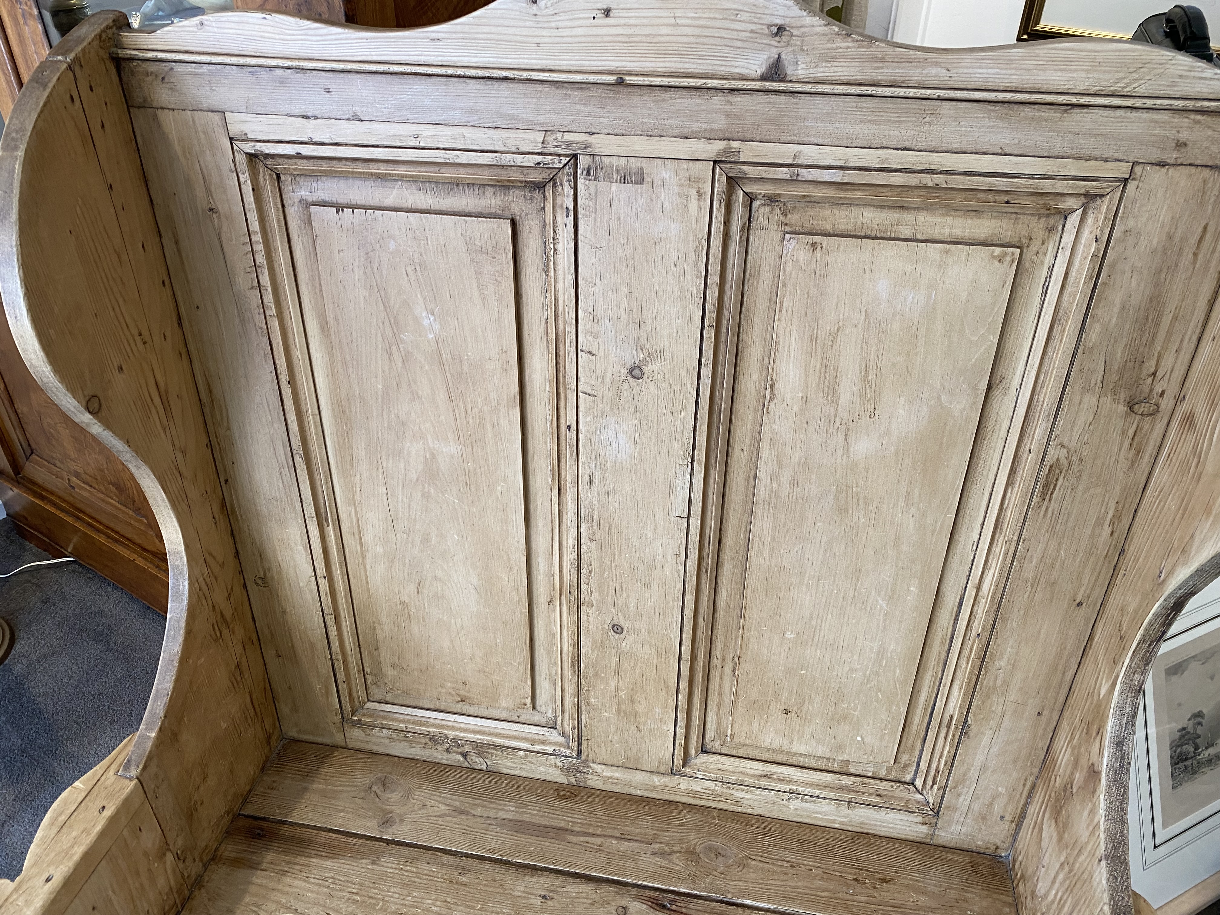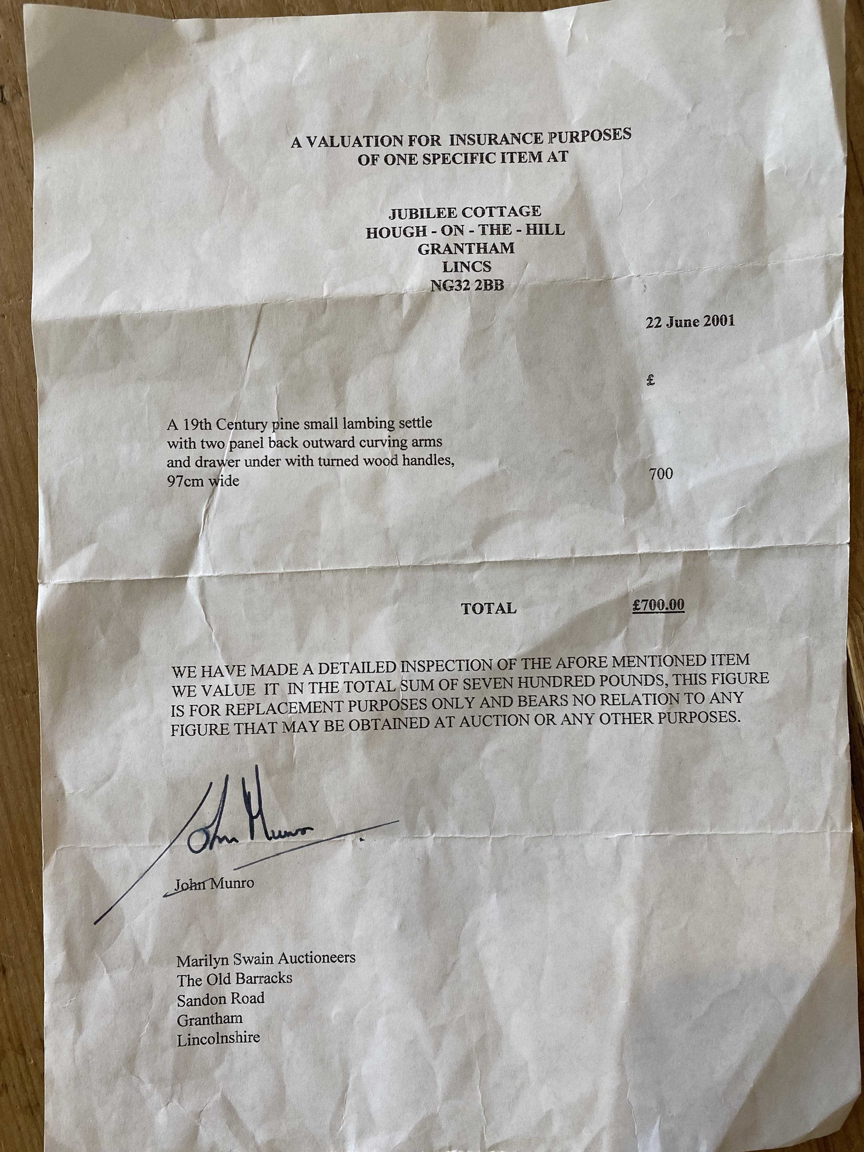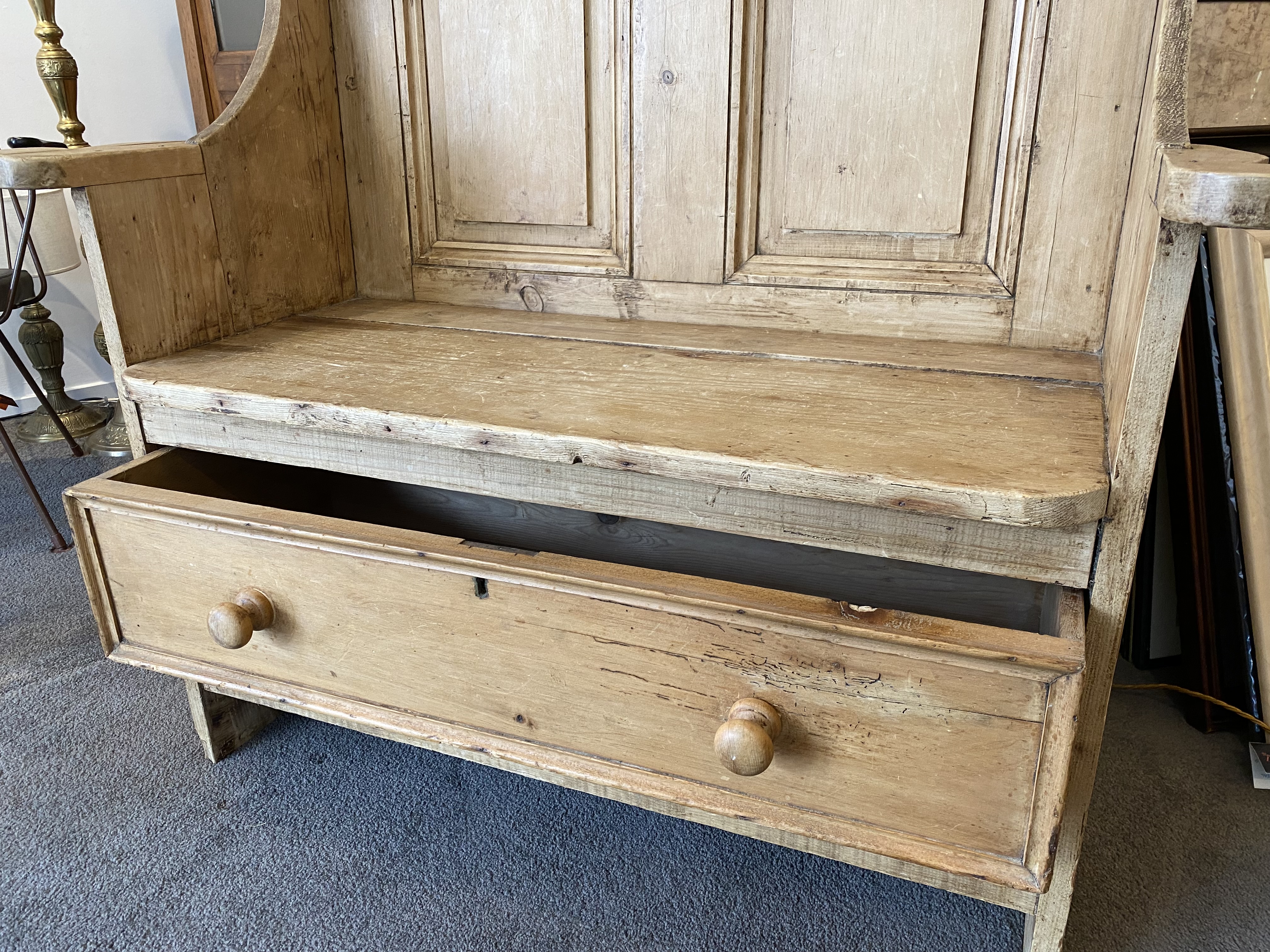Beautiful small English Lambing Settle with two panel back, outward curving arms and a drawer with turned wood handles.