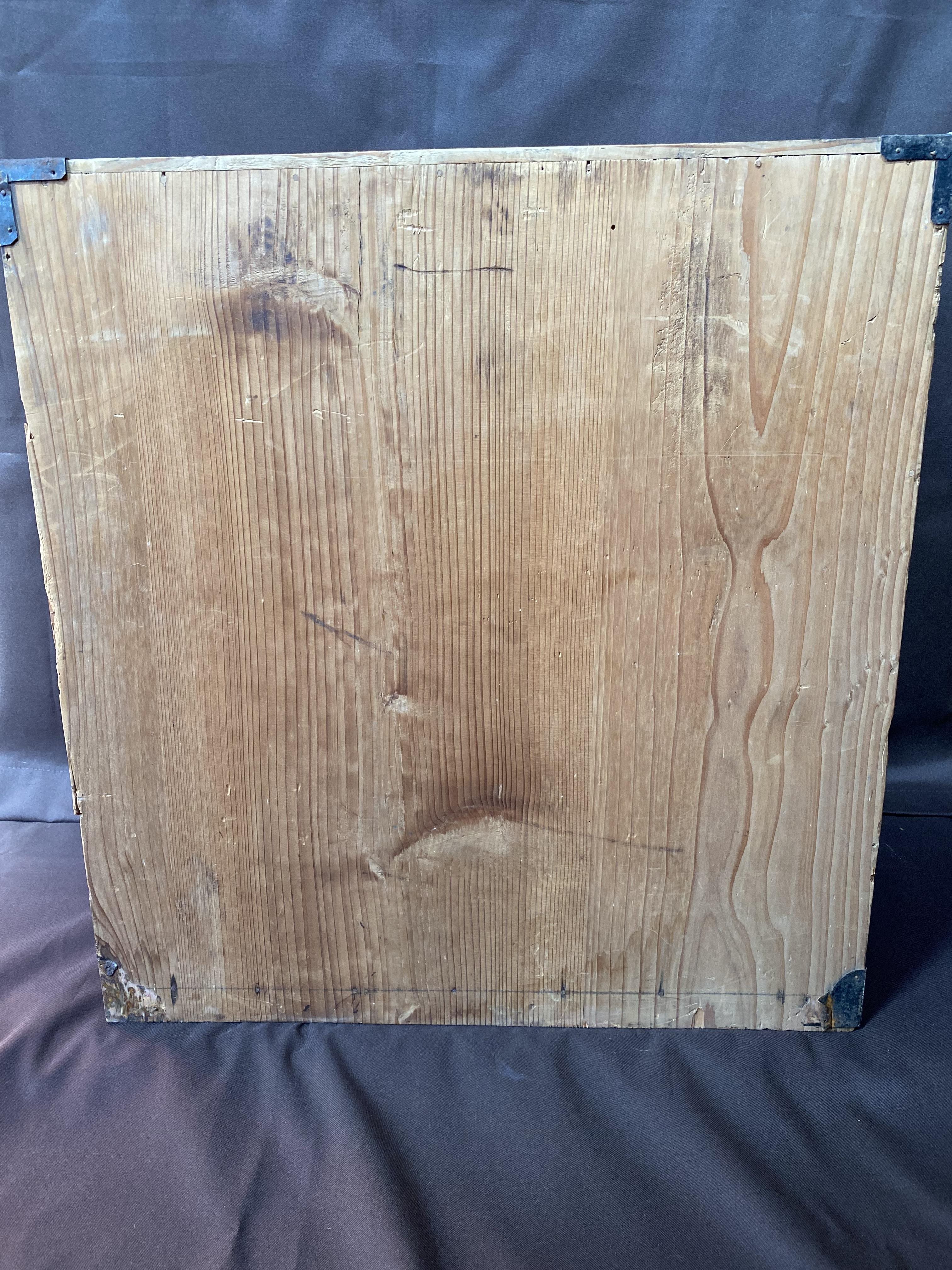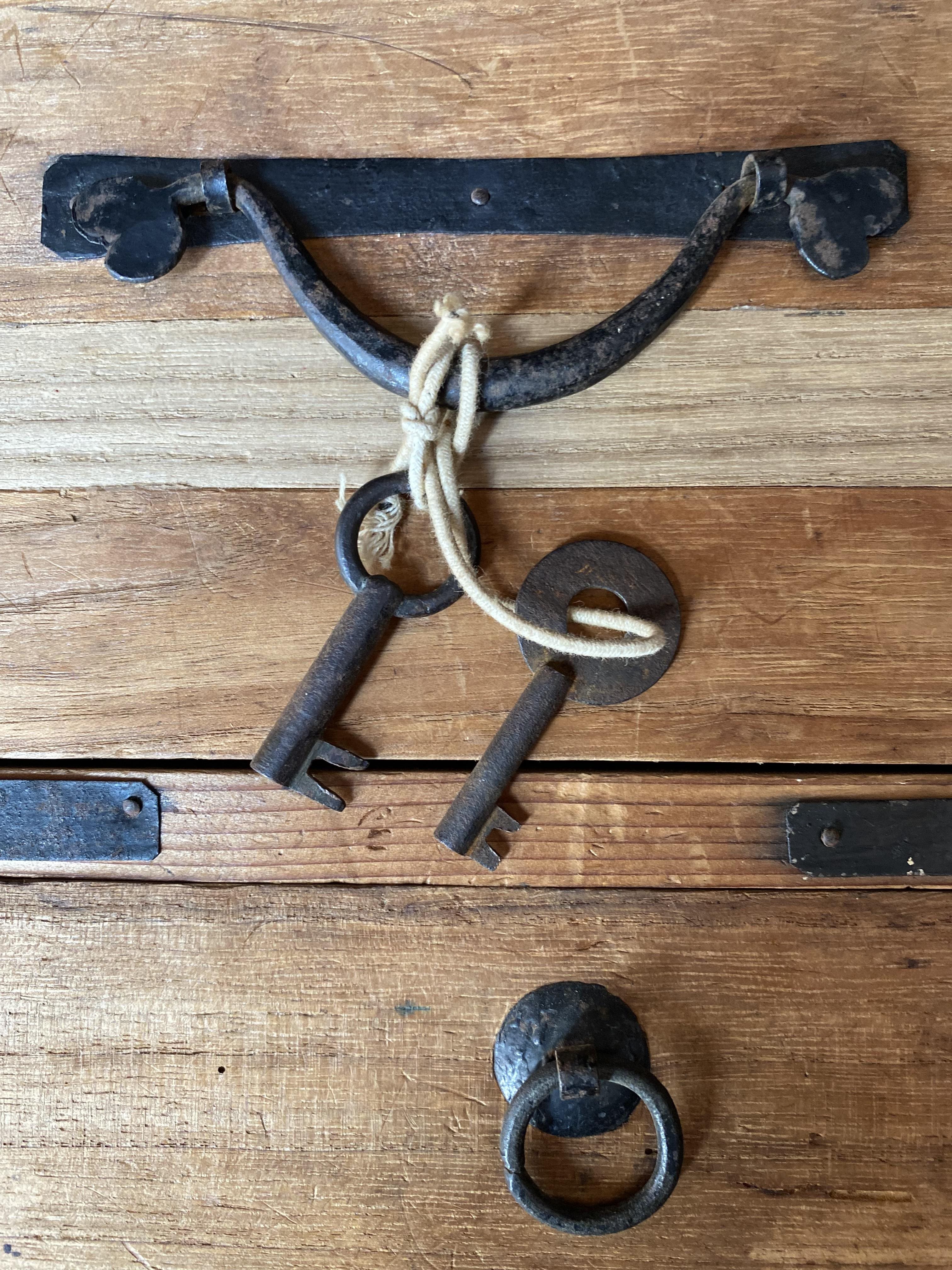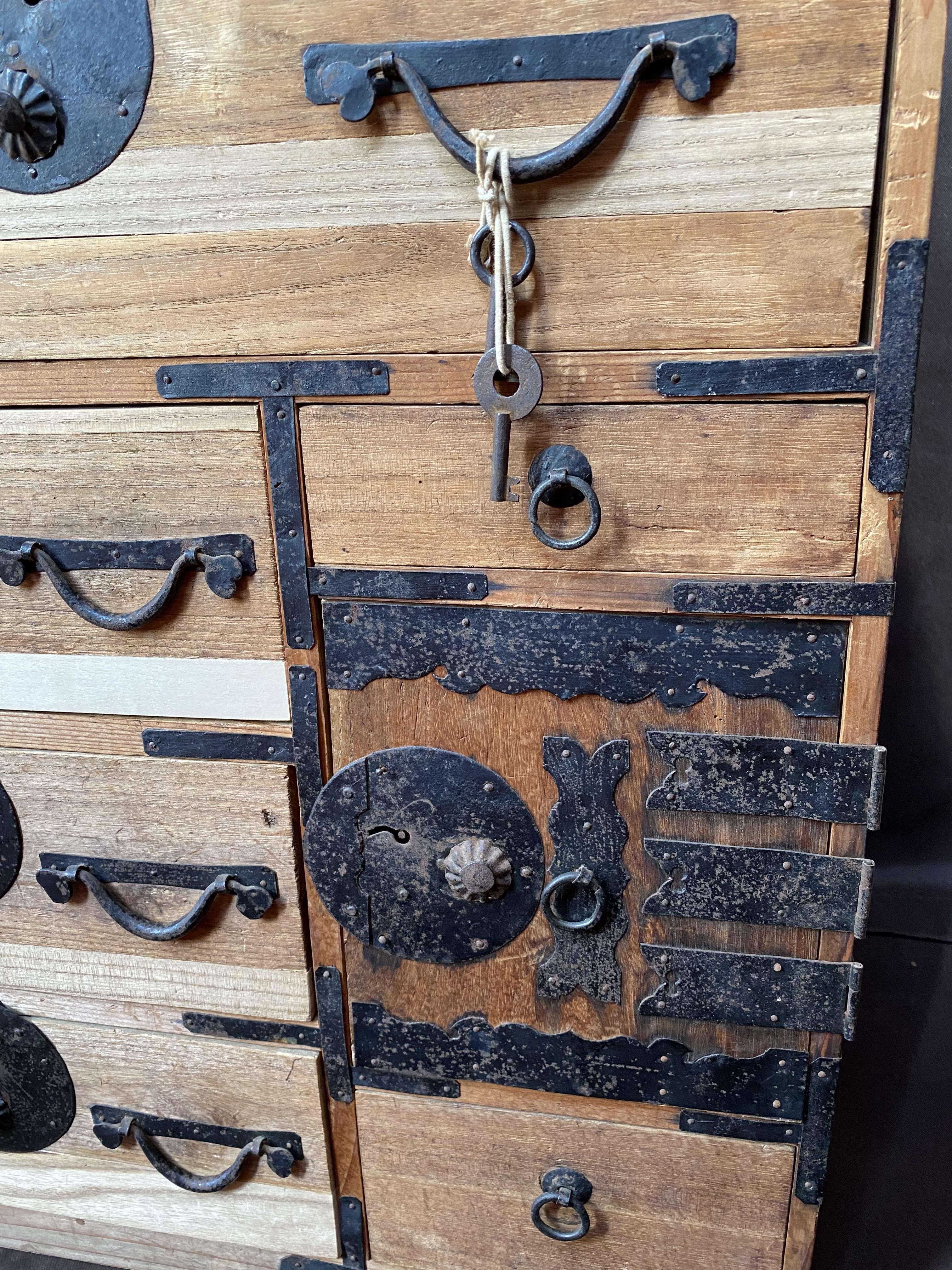 This chest has had some professional repair which has deliberately been left its the natural wood colour, (it could easily be blended into the original chests colour if desired). It is well proportioned with 6 external drawers and 2 more hidden benath a small hinged door. The extensive metal banding and corners gives a sense of its age. Includes two original keys for the 5 working locks.