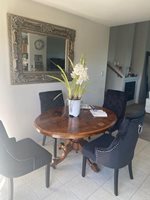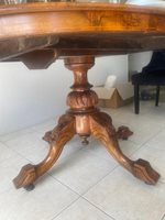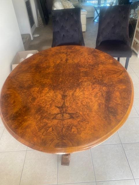 This is a magnificent Victorian Walnut table. A great size for today's modern living,such as a small dining area or apartment. It comfortably seats 4. The condition is immaculate and the highly polished Burr Walnut top is Book-Matched. Book-matching describes when a veneer has a mirror image by folding out each veneer leaf, resulting in two surfaces that have the same appearance but are mirrored. It has a beautifully carved central column that splays into 4 ornate feet on casters.