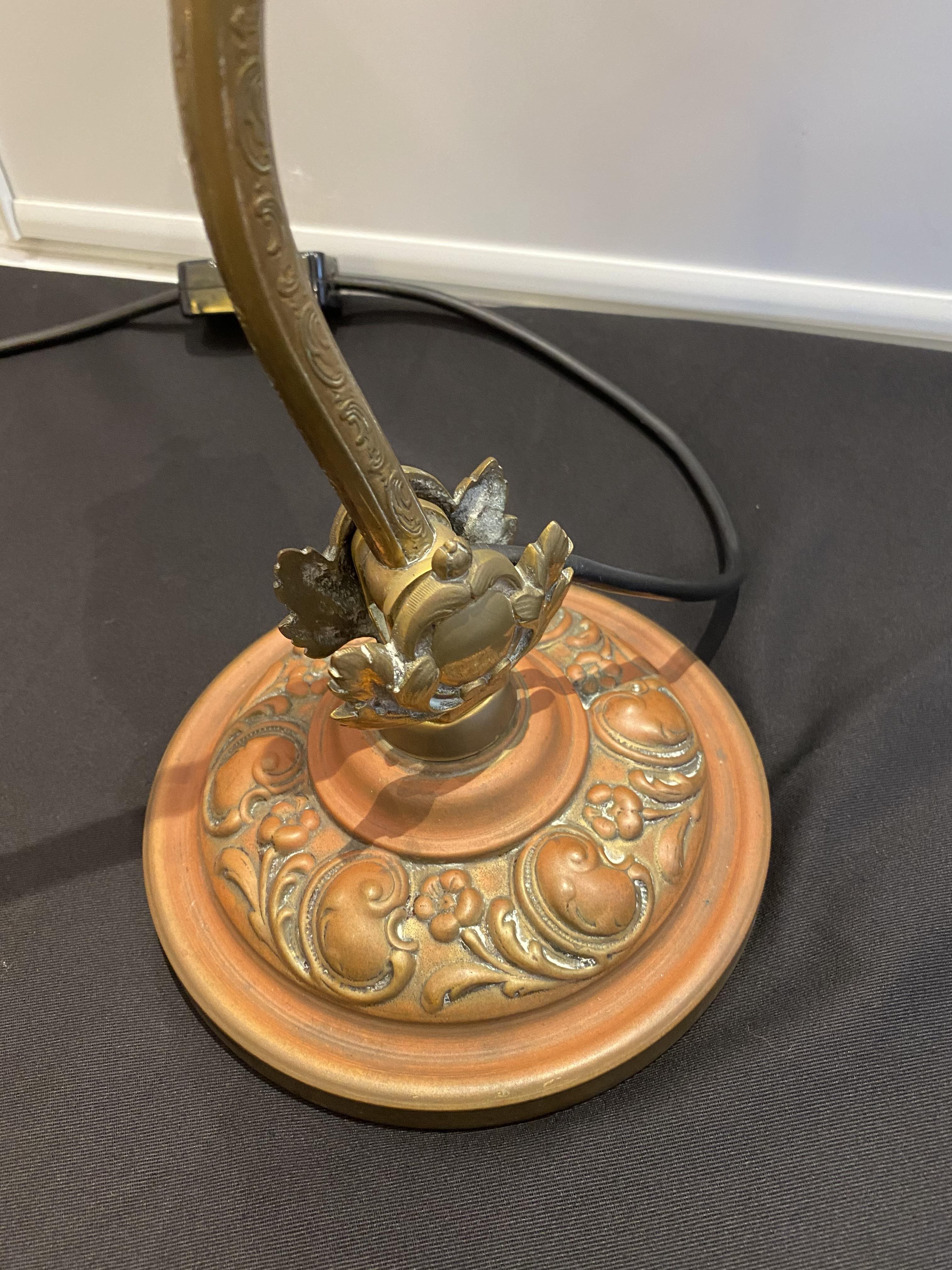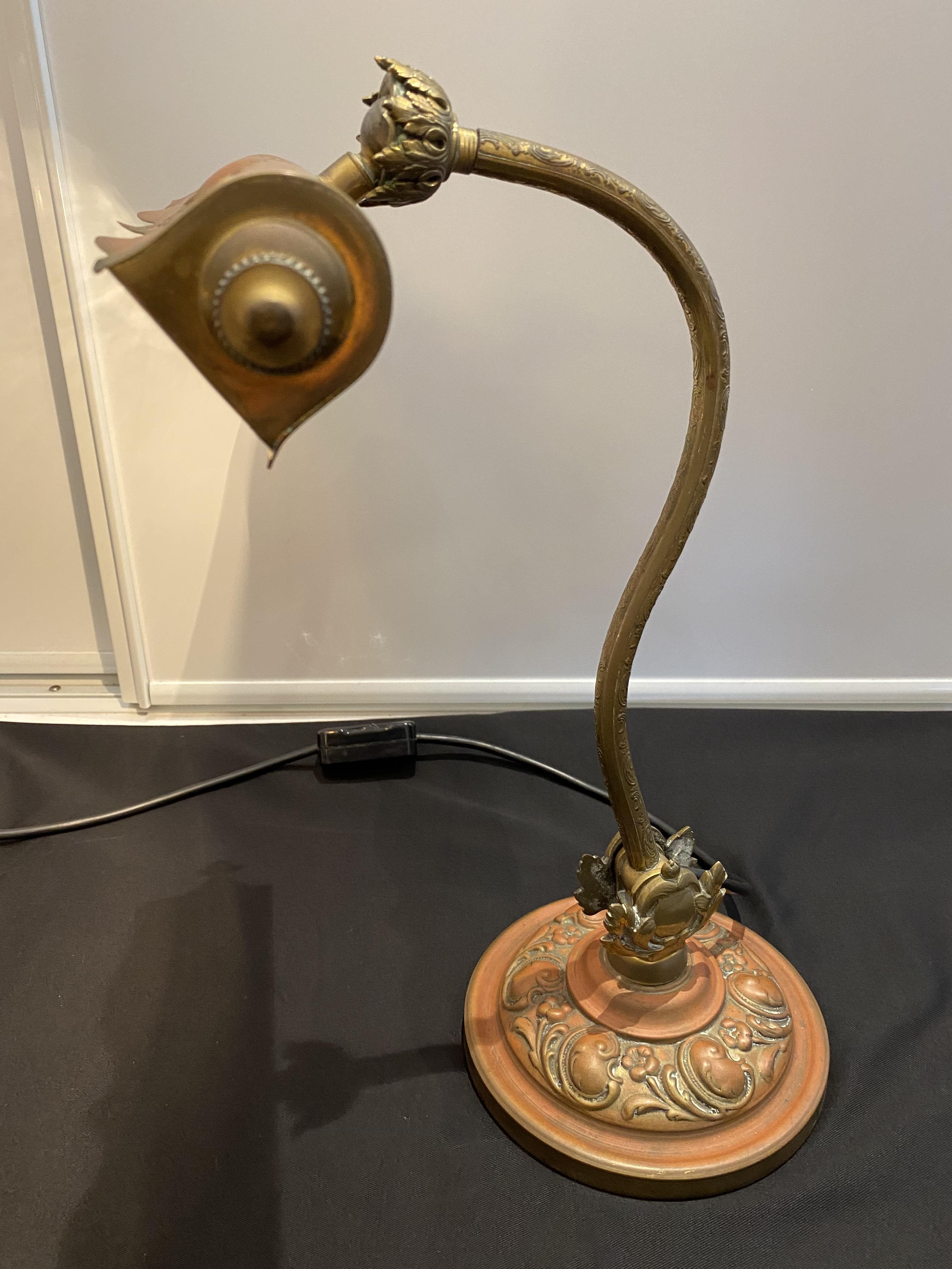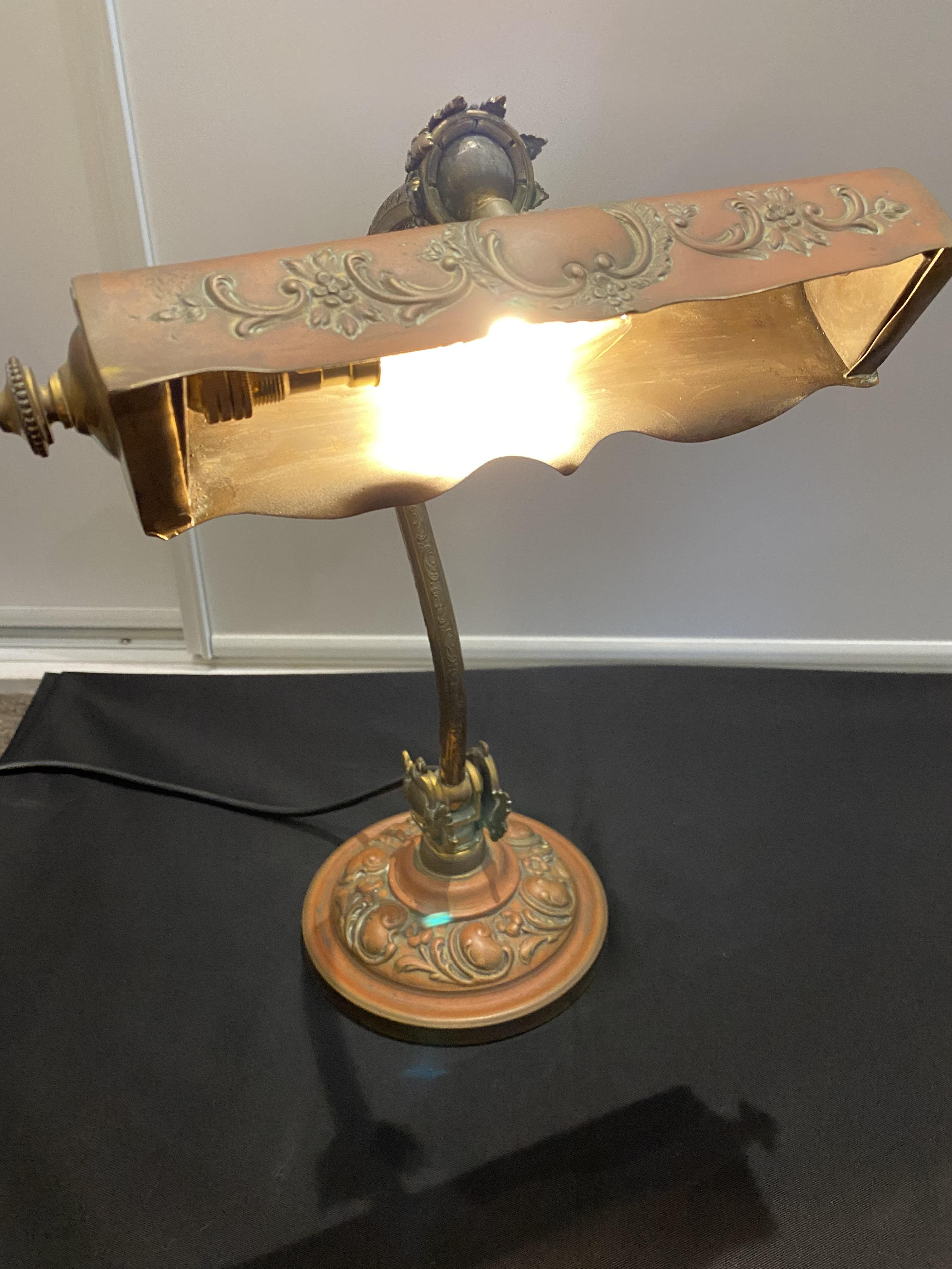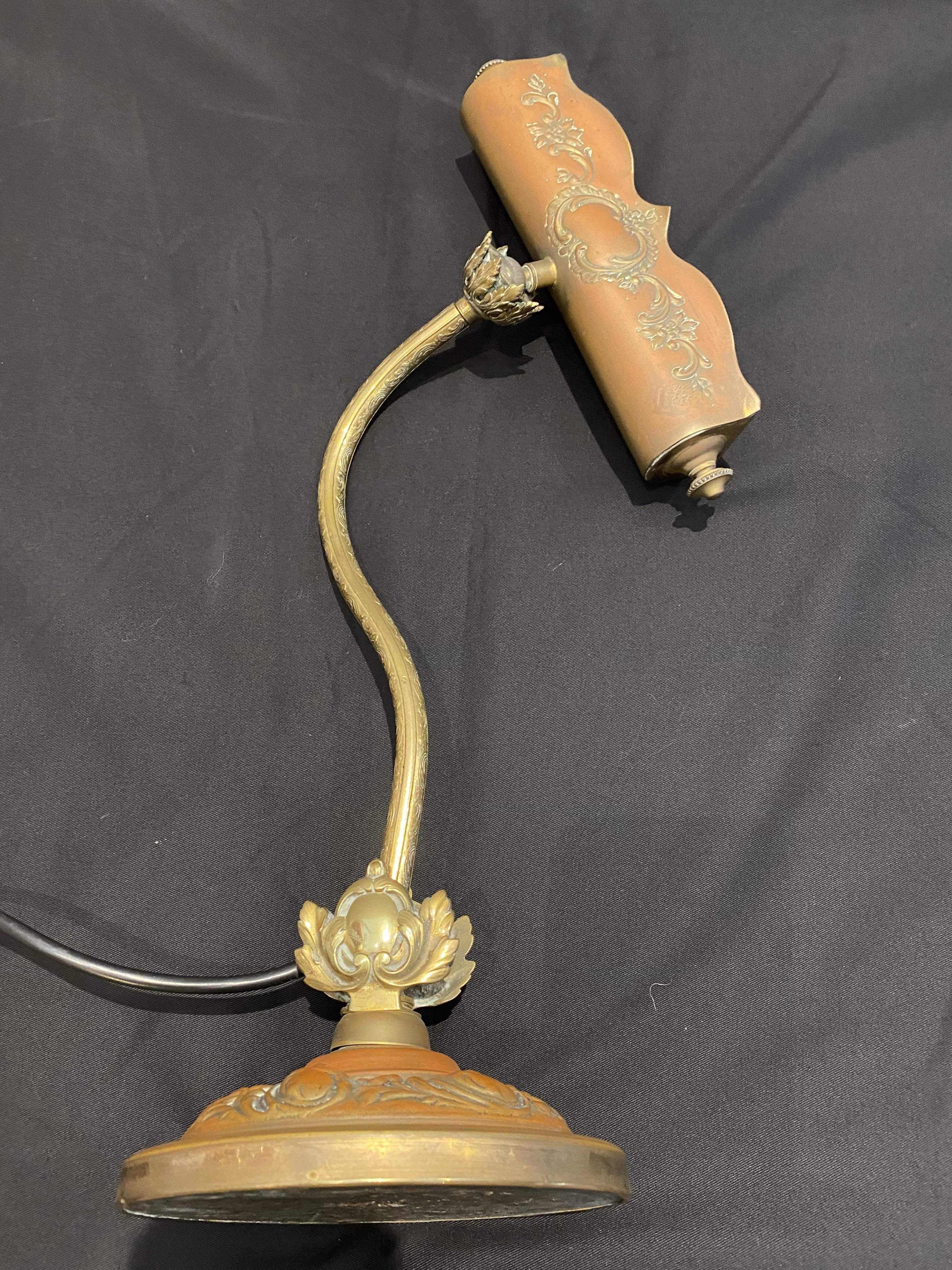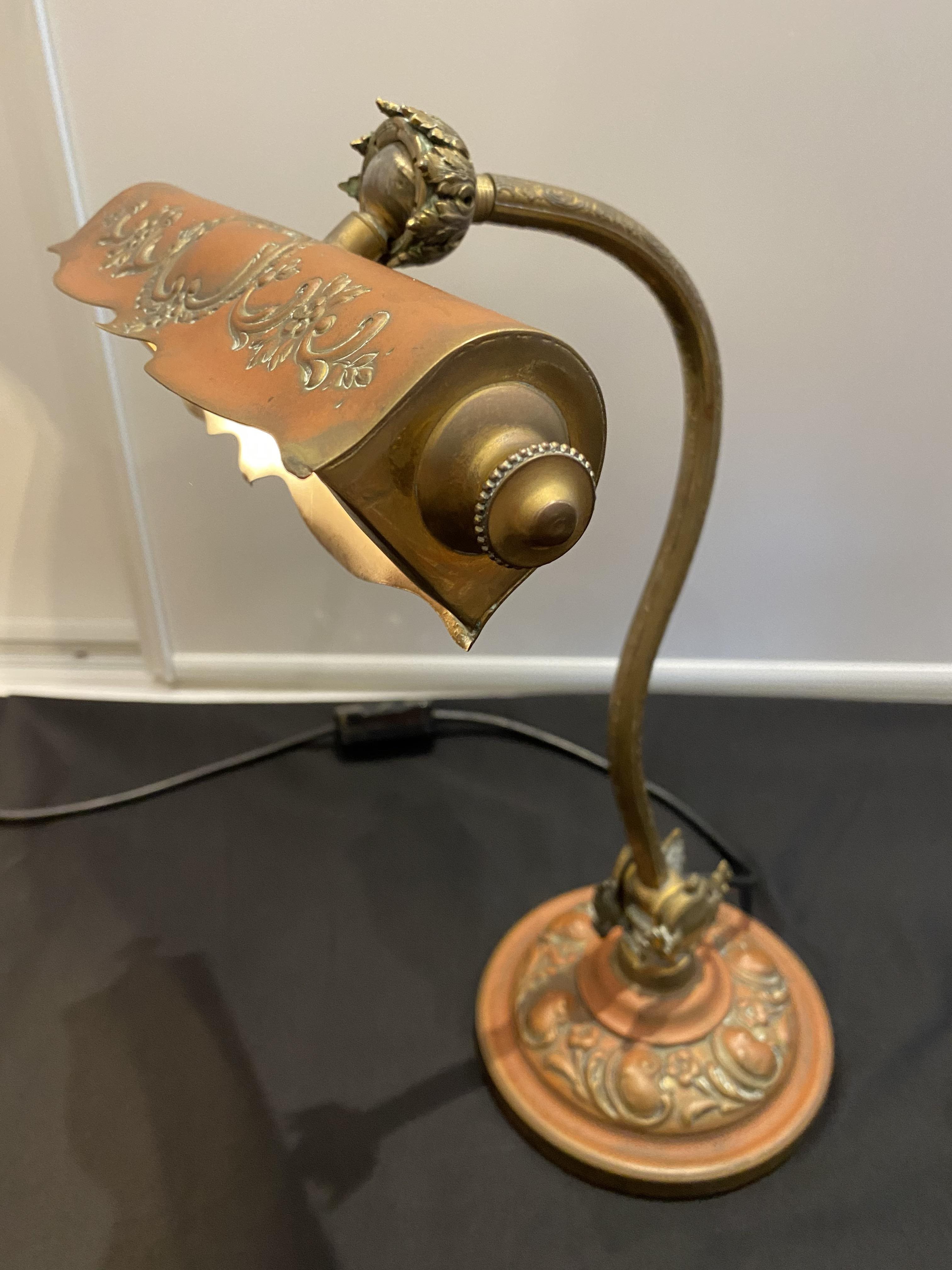 Ornate pressed metal desk lamp with beautiful aged pattination.