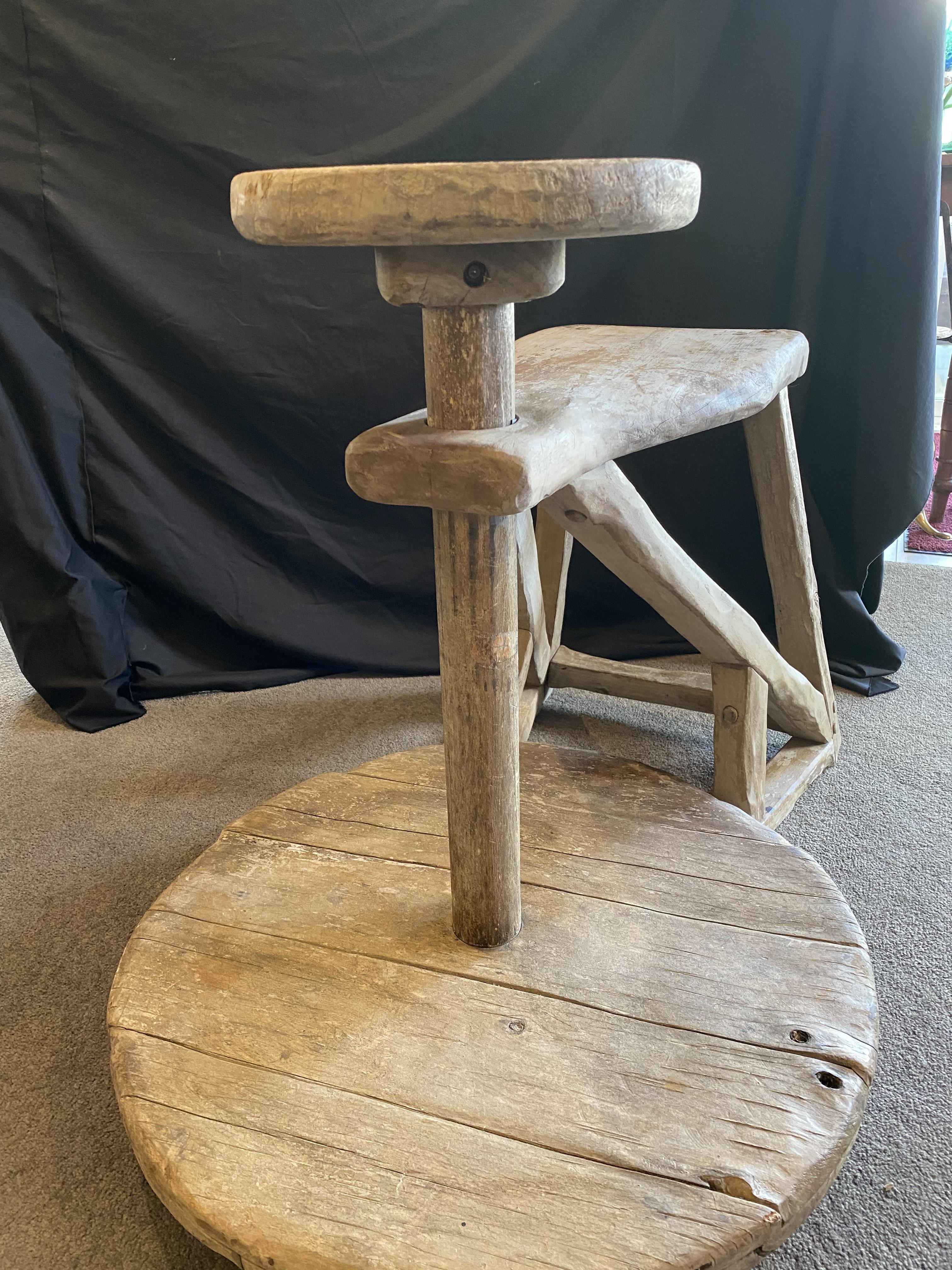 Unique! This is one of our all-time favorite pieces. An amazing wooden potters wheel. The handcrafting of the wood and wear from use makes it a beautiful object; tactile and beautifully decorative. It's a work of art and would be a great addition to any home or space. Would also make a great coffee or side table.