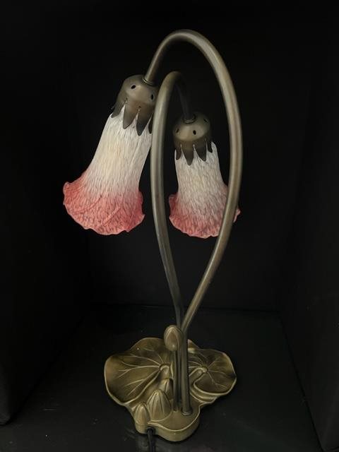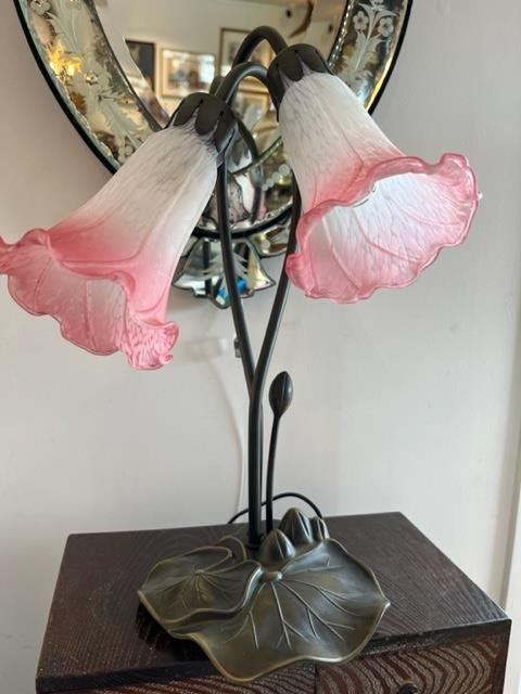 Lovely reproduction in the Art Nouveau Style. Pink and white shade and bronzed base and stem.