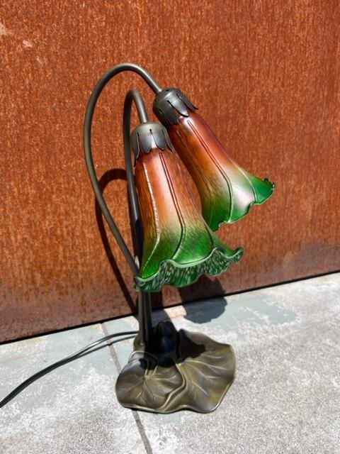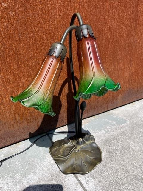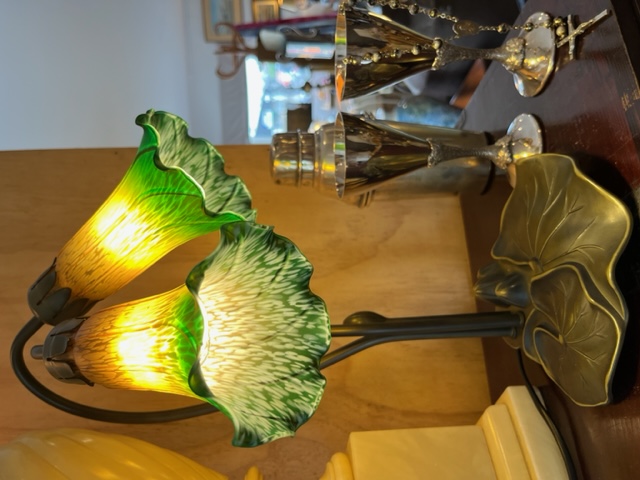Lovely reproduction in the Art Nouveau Style. Green and Amber shade and bronzed base and stem.