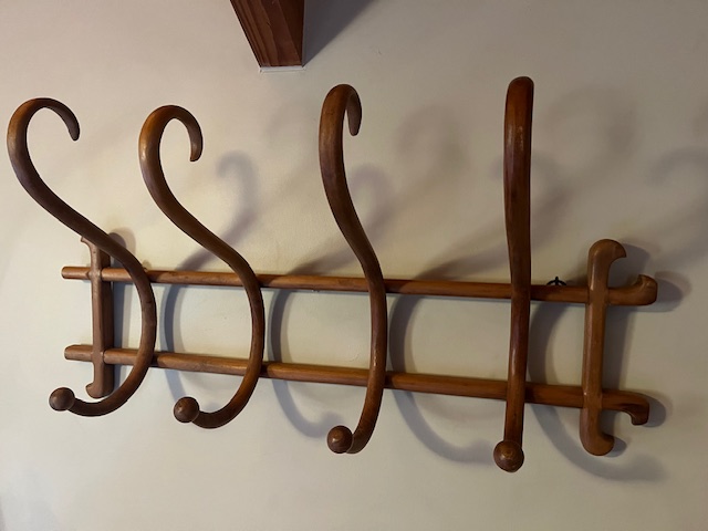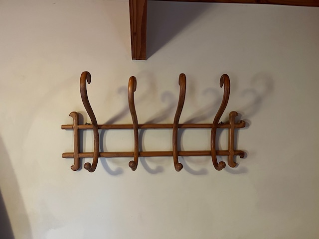 It would almost be a pity to hang a coat or hat here, and hide the lovely form of the scrolling wood. Likely made by French company Thonet, in the late 19th or early 20th century, it comprises 4 "hooks" and has two original metal eyes for easy attachment to a wall.