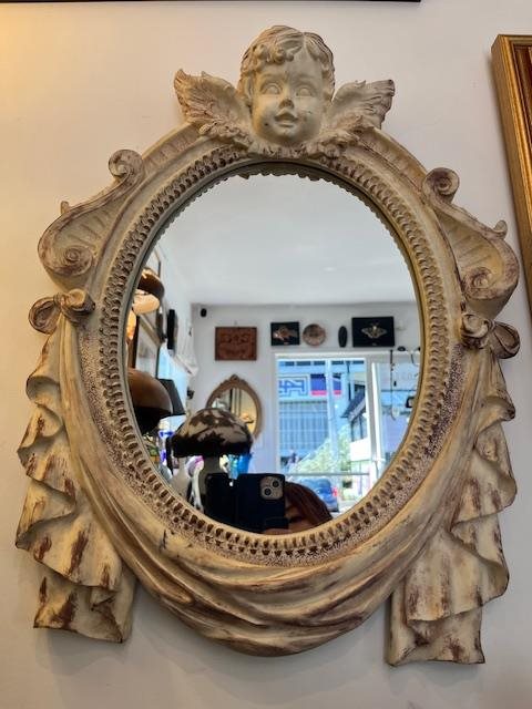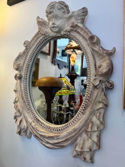 This is a lovely wall mirror of 510 mm in height. It's a reproduction but has been crafted very well, surmounted with a pretty cherub head and wings, and swags either side.