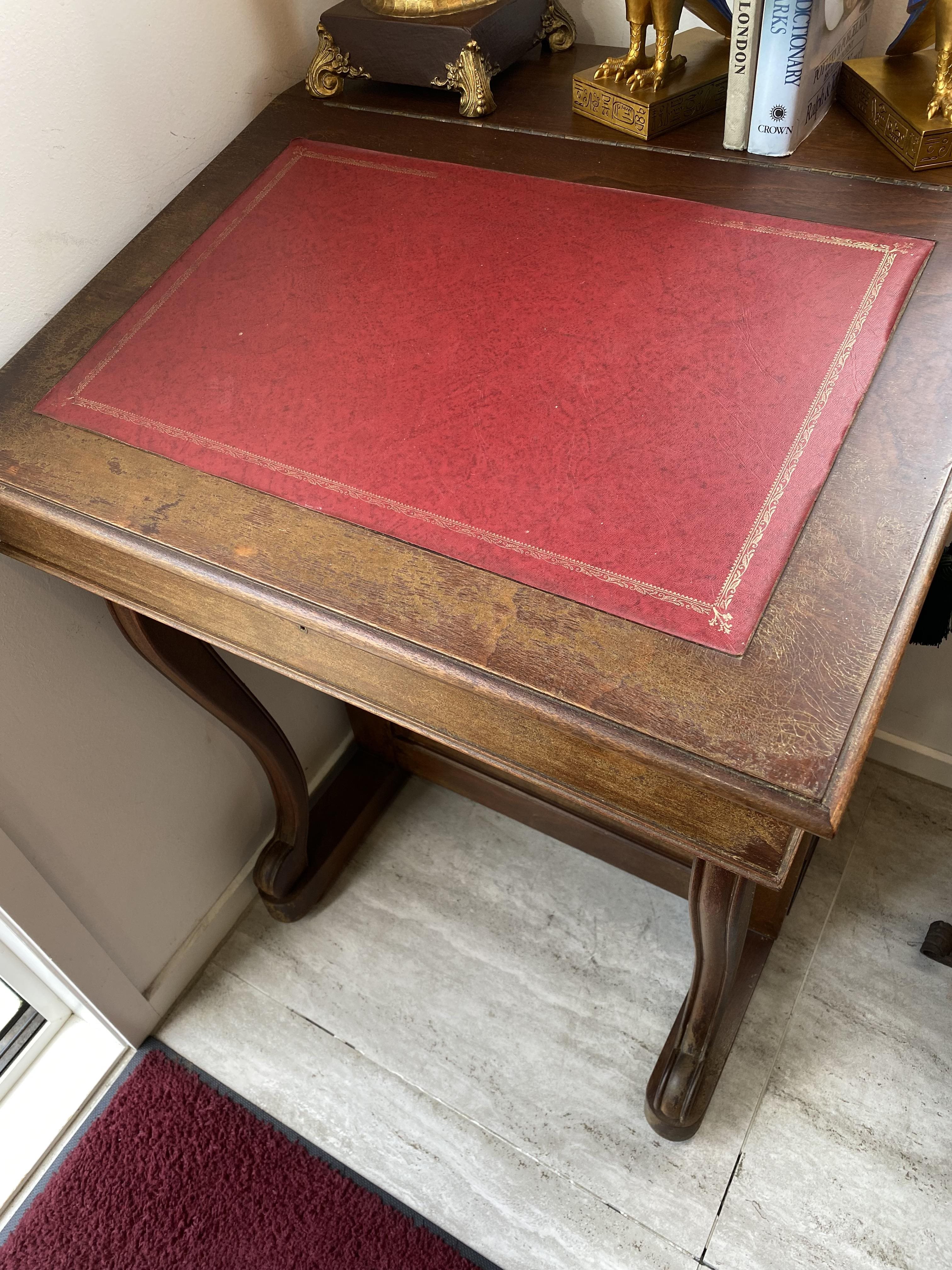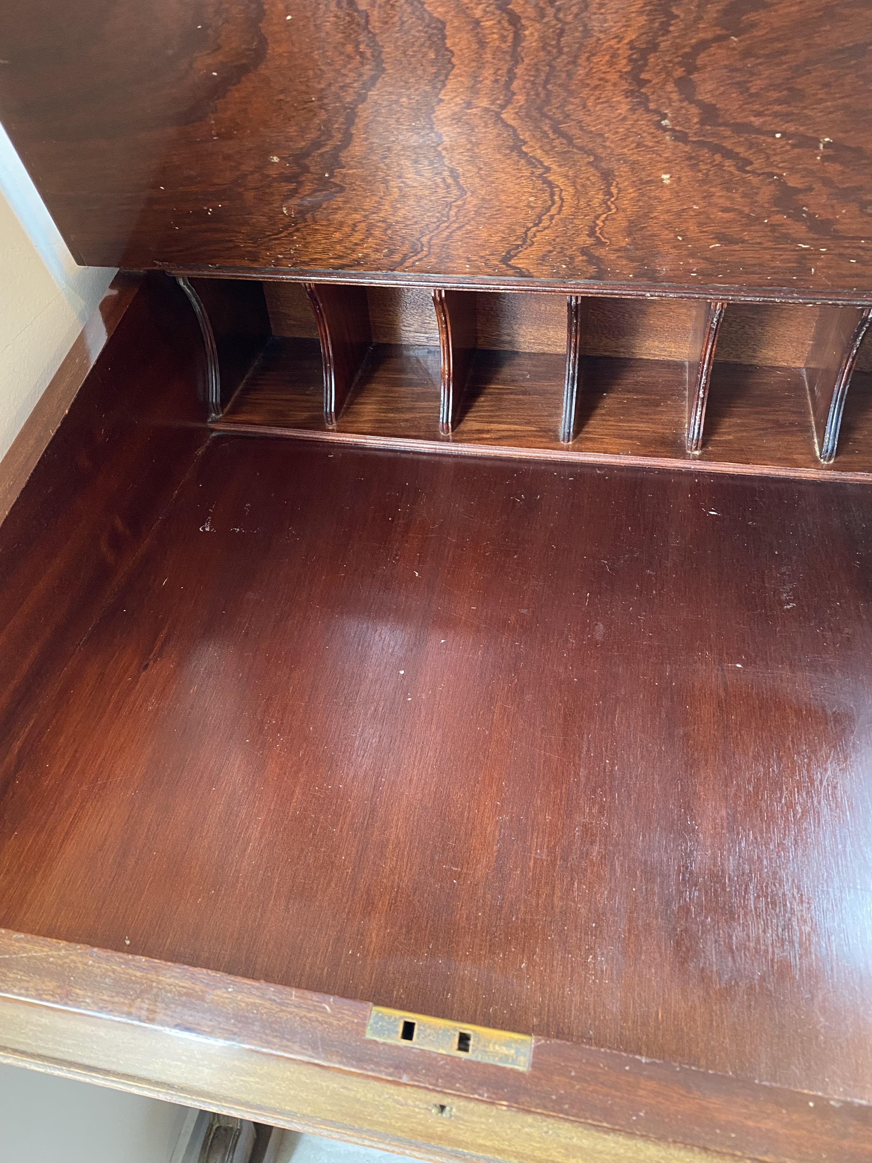 The Davenport shape is distinctive; its top part resembles an antique school desk while the bottom is like one of the two drawer-pedestals of a pedestal desk turned sideways. The addition of the two legs in front completes the odd effect. This example has queen anne style legs.