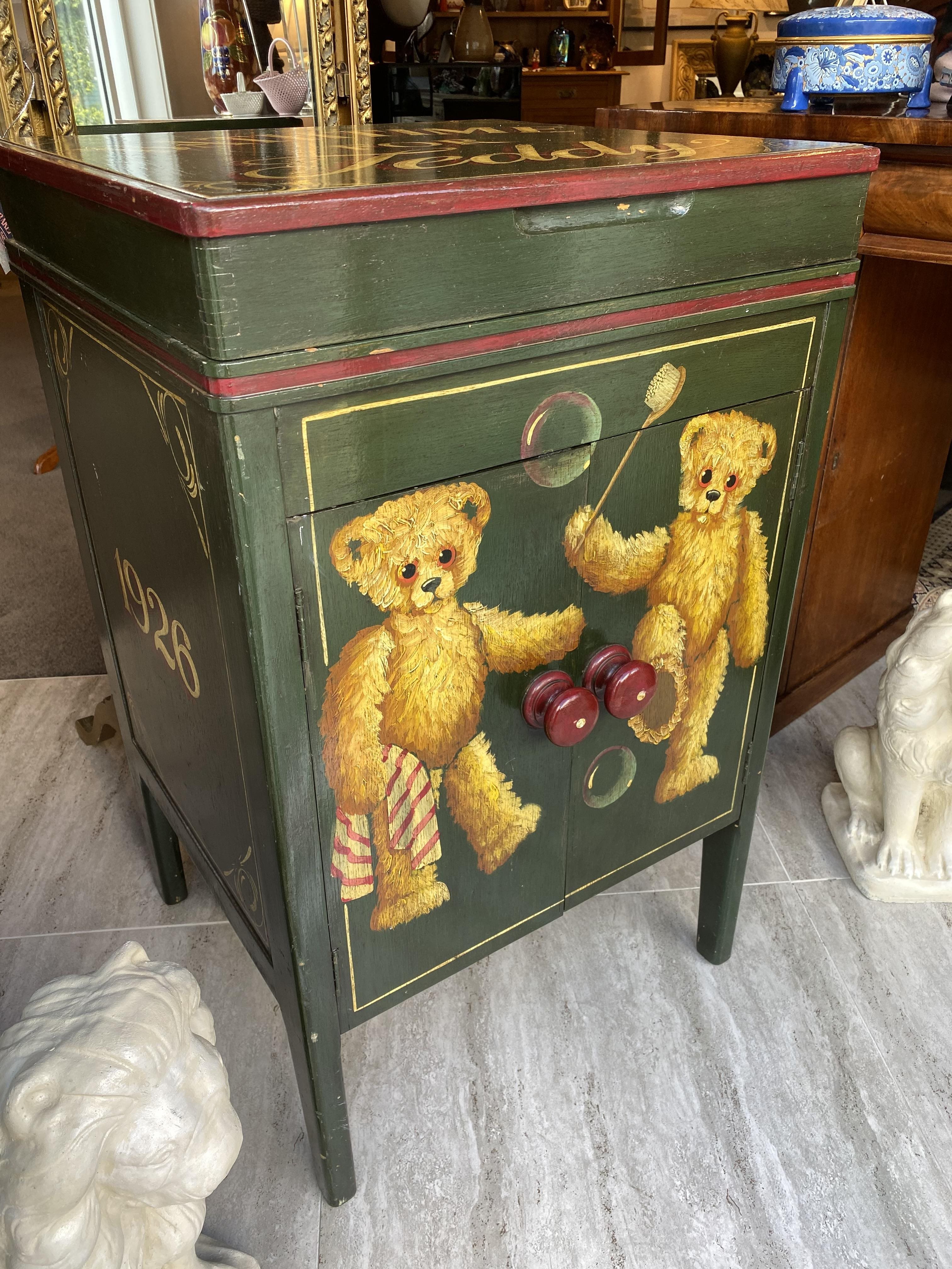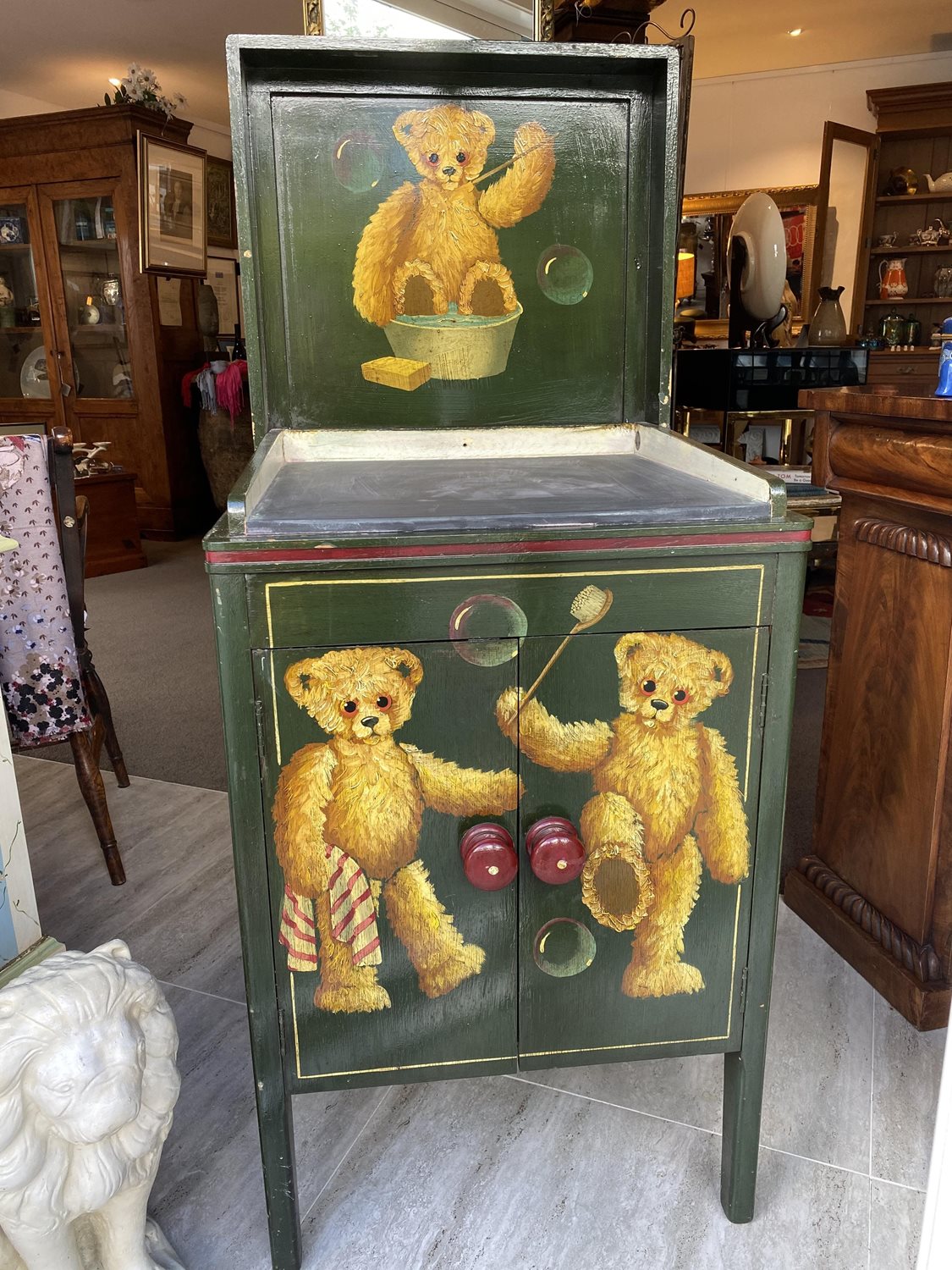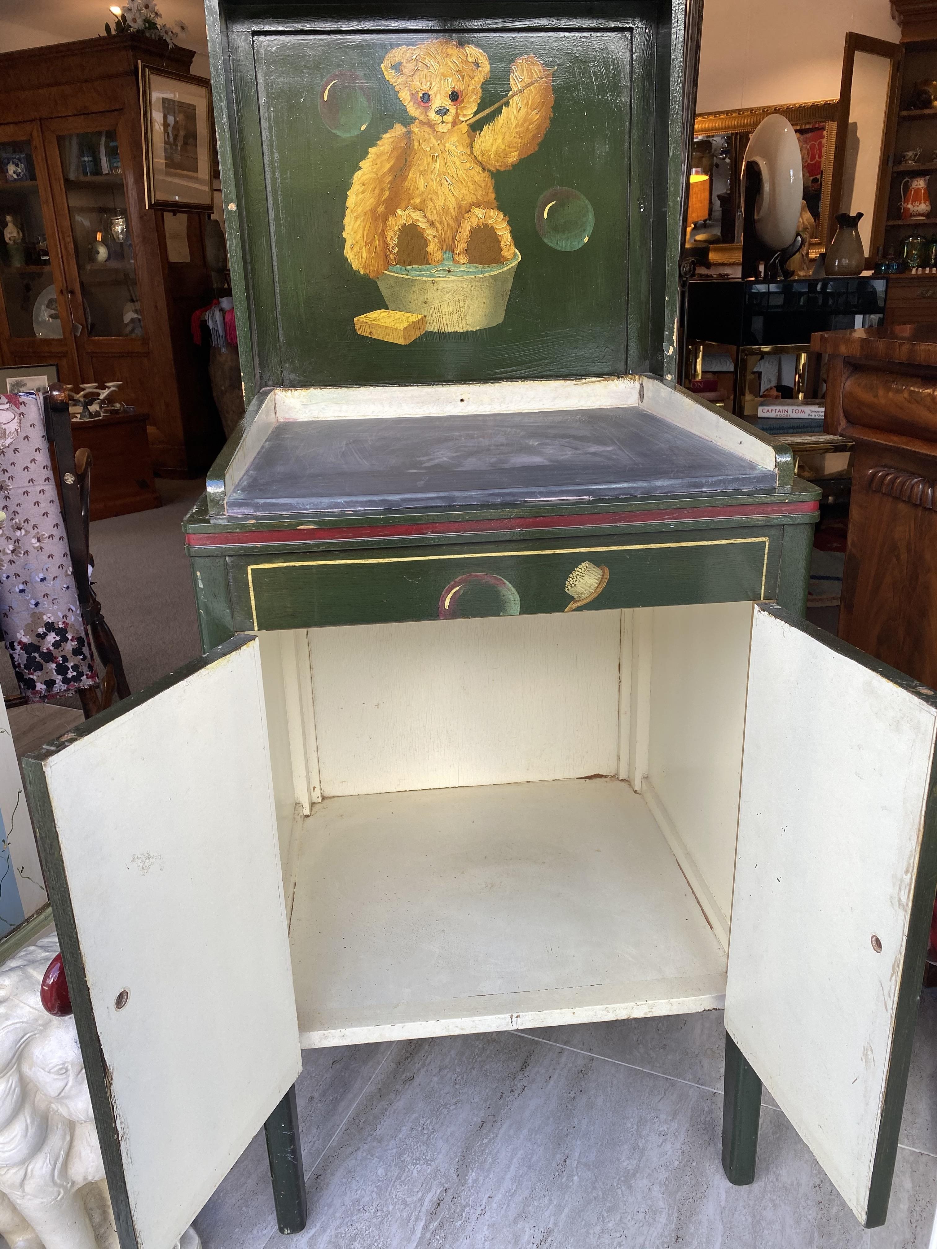 Wonderful small oak cupboard that has been lovingly decorated with Teddy bears and on the top the words." Bathtime for Teddy"