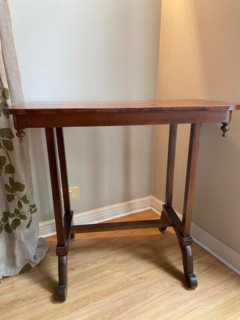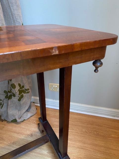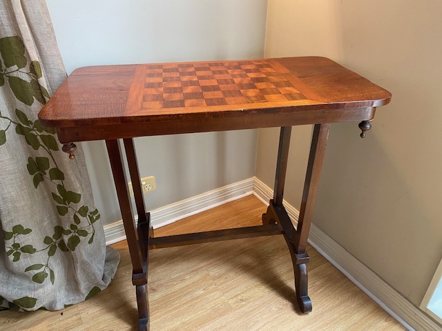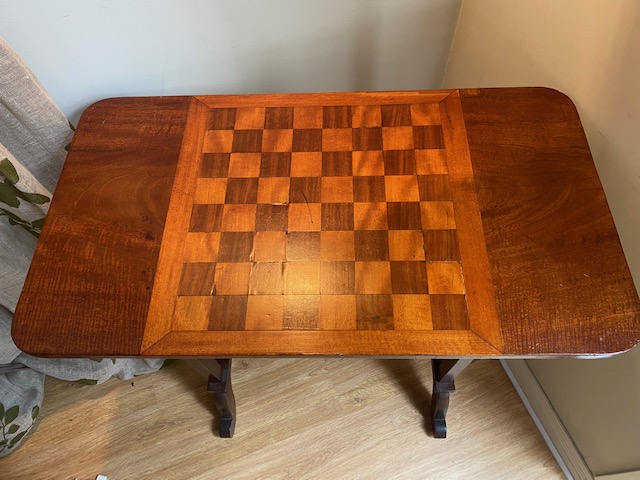 Lovely side-table with an inlaid parquetry chess/games board. Features decorative turned finials.