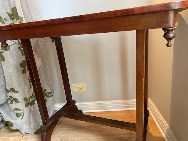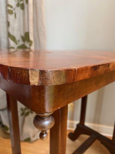 Two small sections on one edge are missing the veneer however this could be easily repaired or simply turned to the wall. Some minor lifting to a small section of veneer on the table top but otherwise in very nice condition.