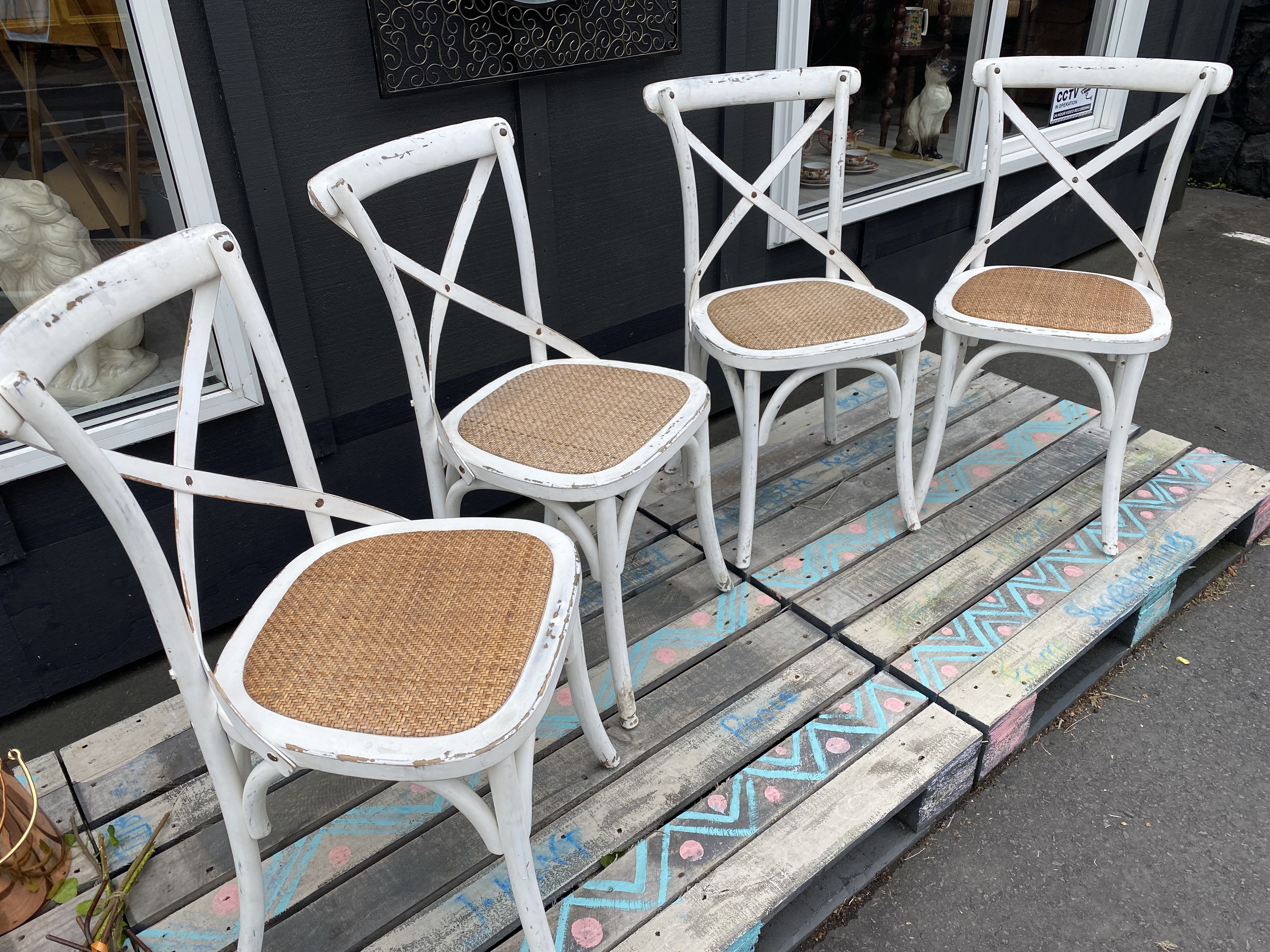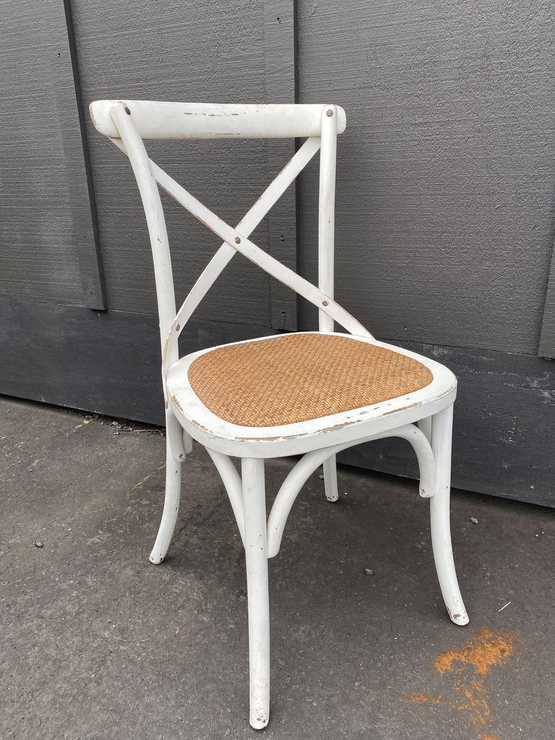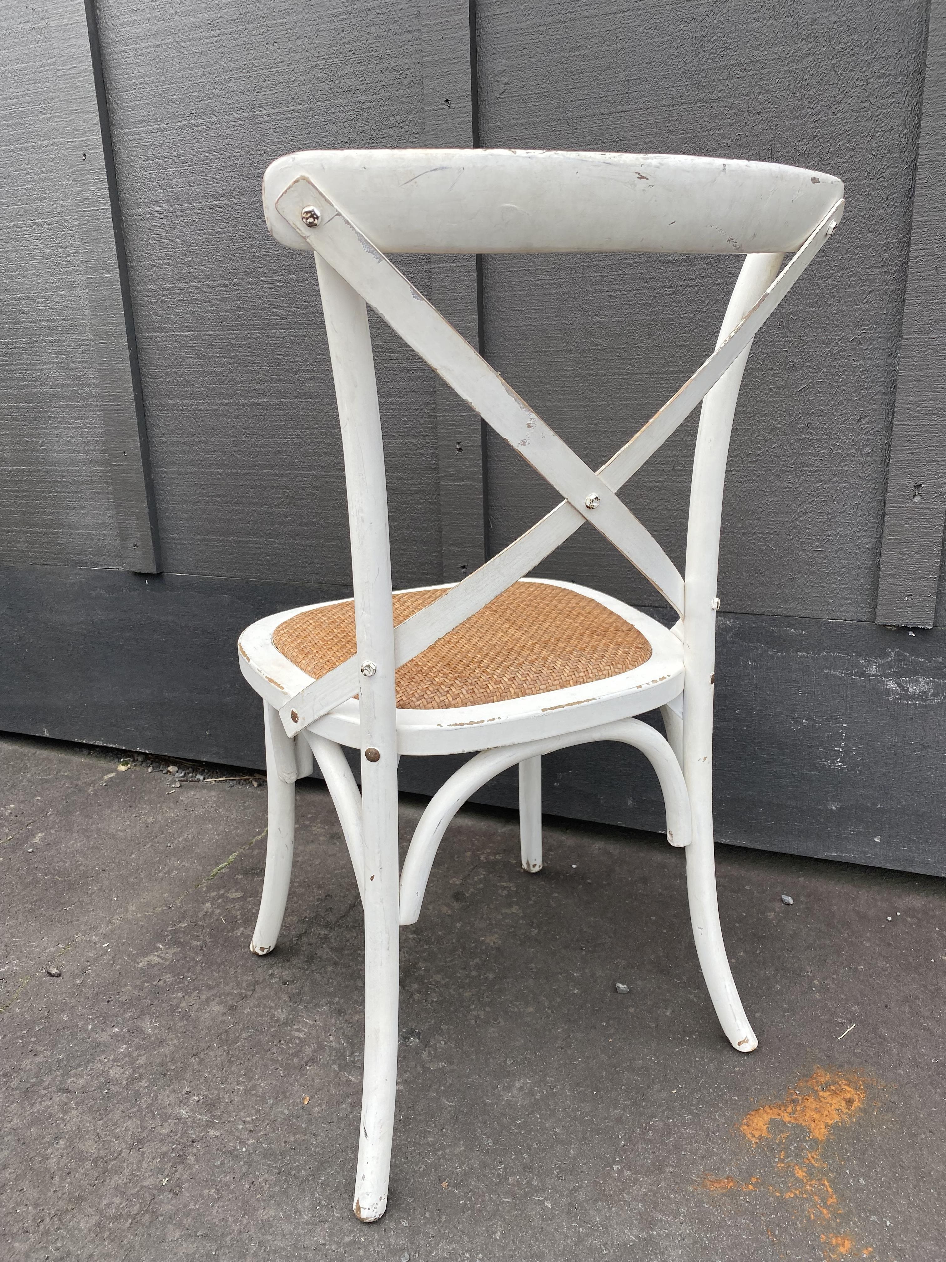 Light yet solid chairs with just the right amount of wear to add to the style. Wooden and metal strapping back-rest and reinforce rattan seats. Very good condition.