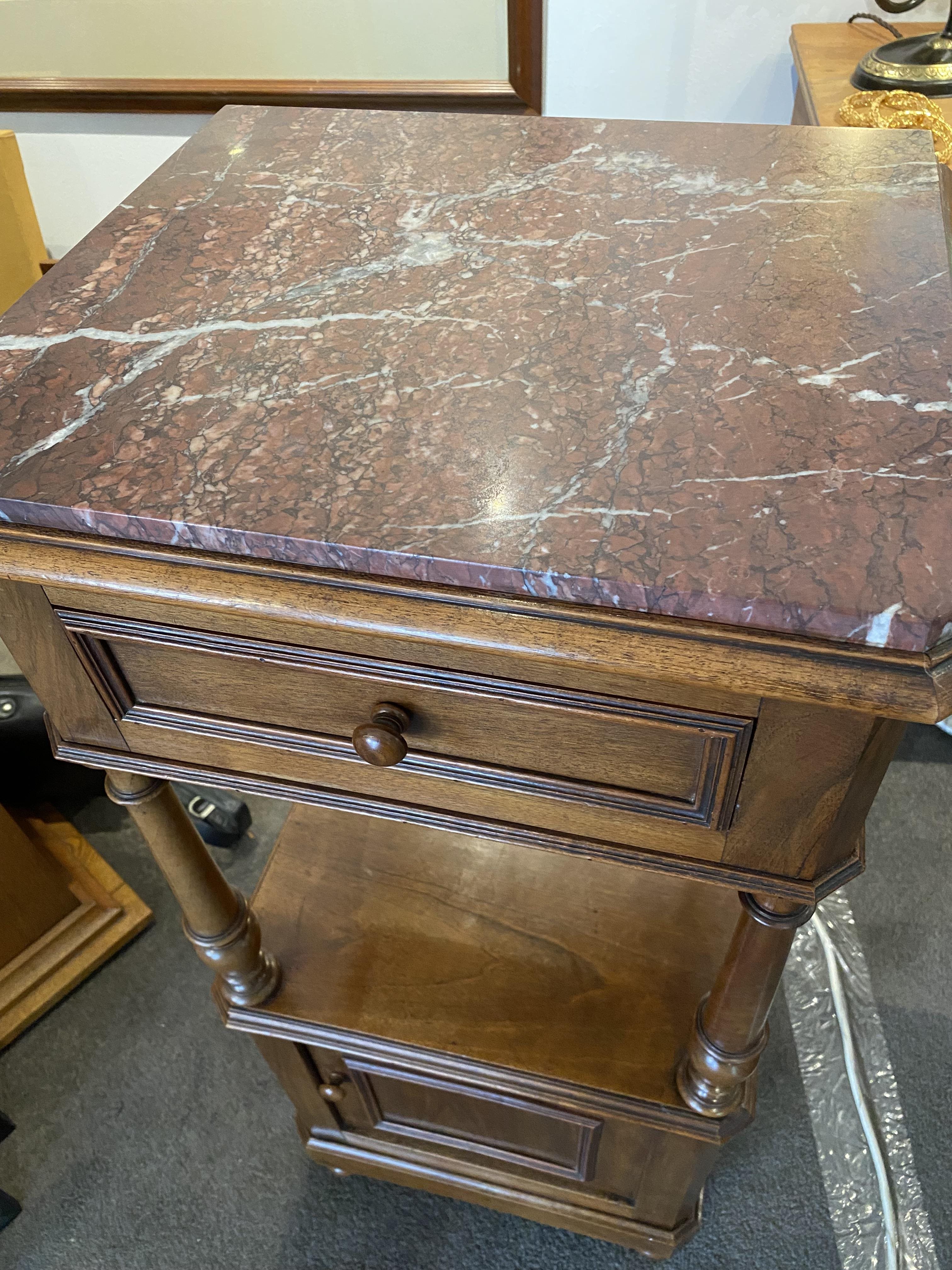 Circa 1850. This is a lovely Provincial French Sidetable with a glorious marble top. The marble is pink/red with white and black veins. The white marble shelf inside the botton cupboard shows that this piece was originally made for the bedroom and was called a "table de nuit" because it stored a chamber pot. French Bedside Tables are also known as "Chevet" This table has recently been sourced from a French Provincial Chateau and will now be a marvellous addition to a hallway or living area.
