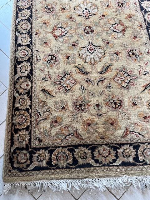 This is a beautiful runner with floral designs, a black border and subtle olive hues. Handmade and in nice condition with a thick pile.