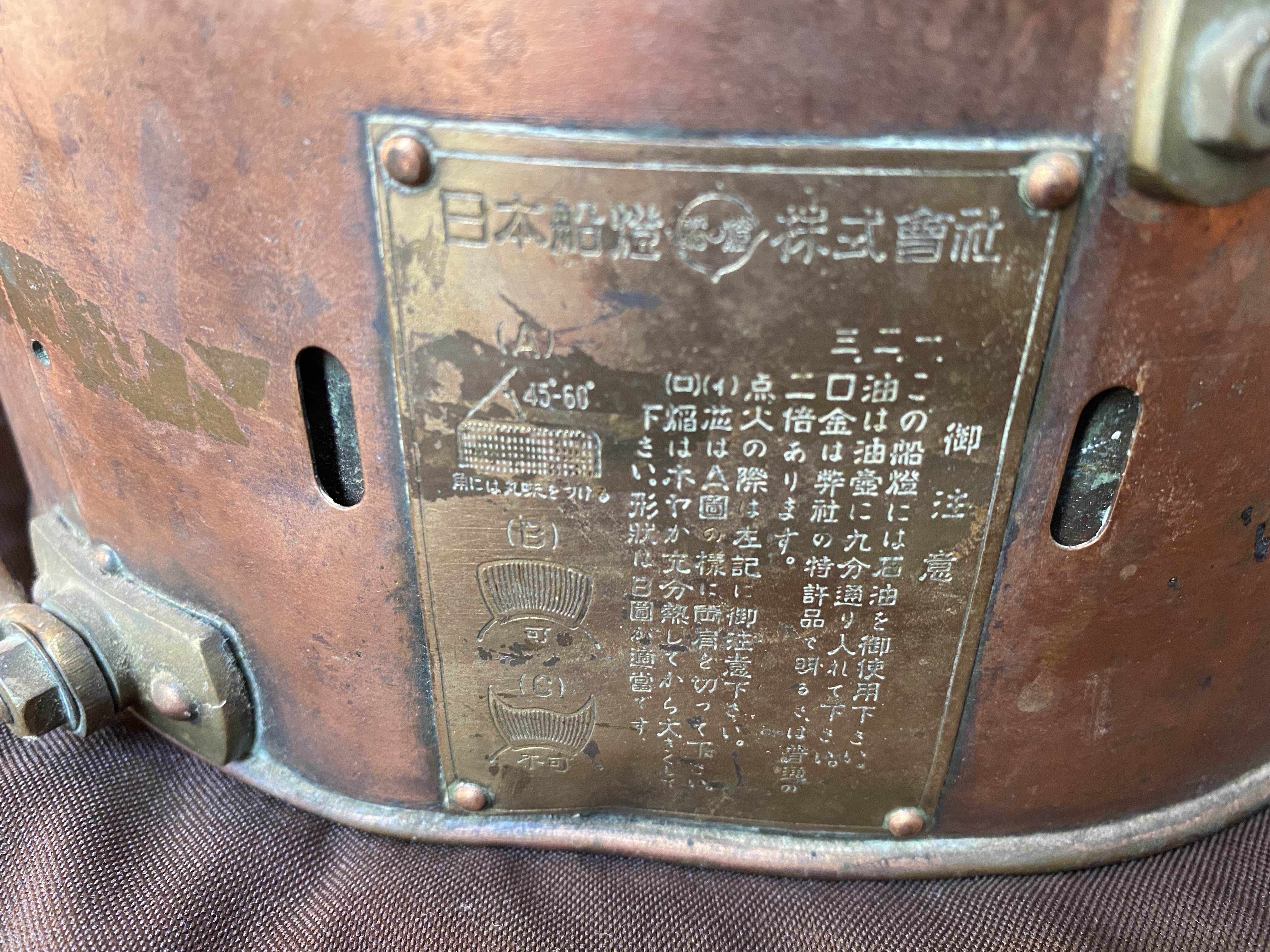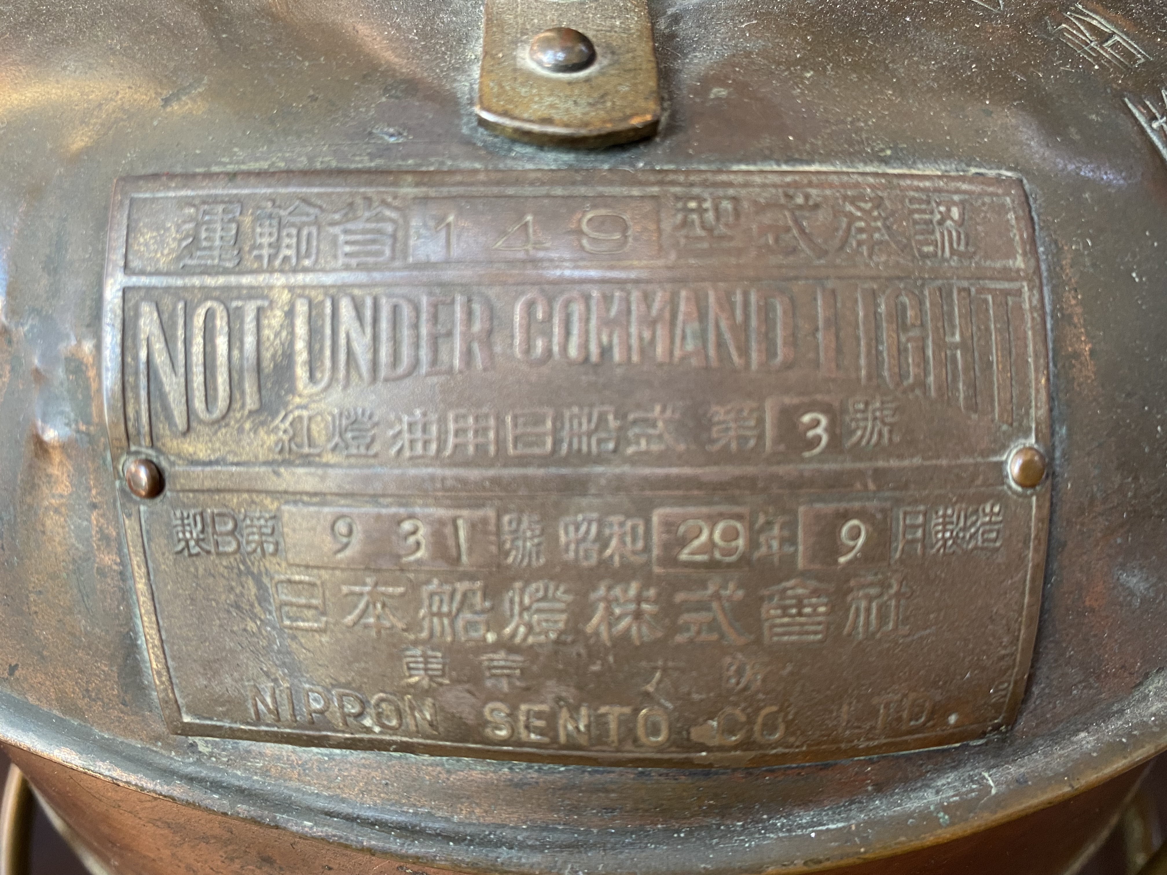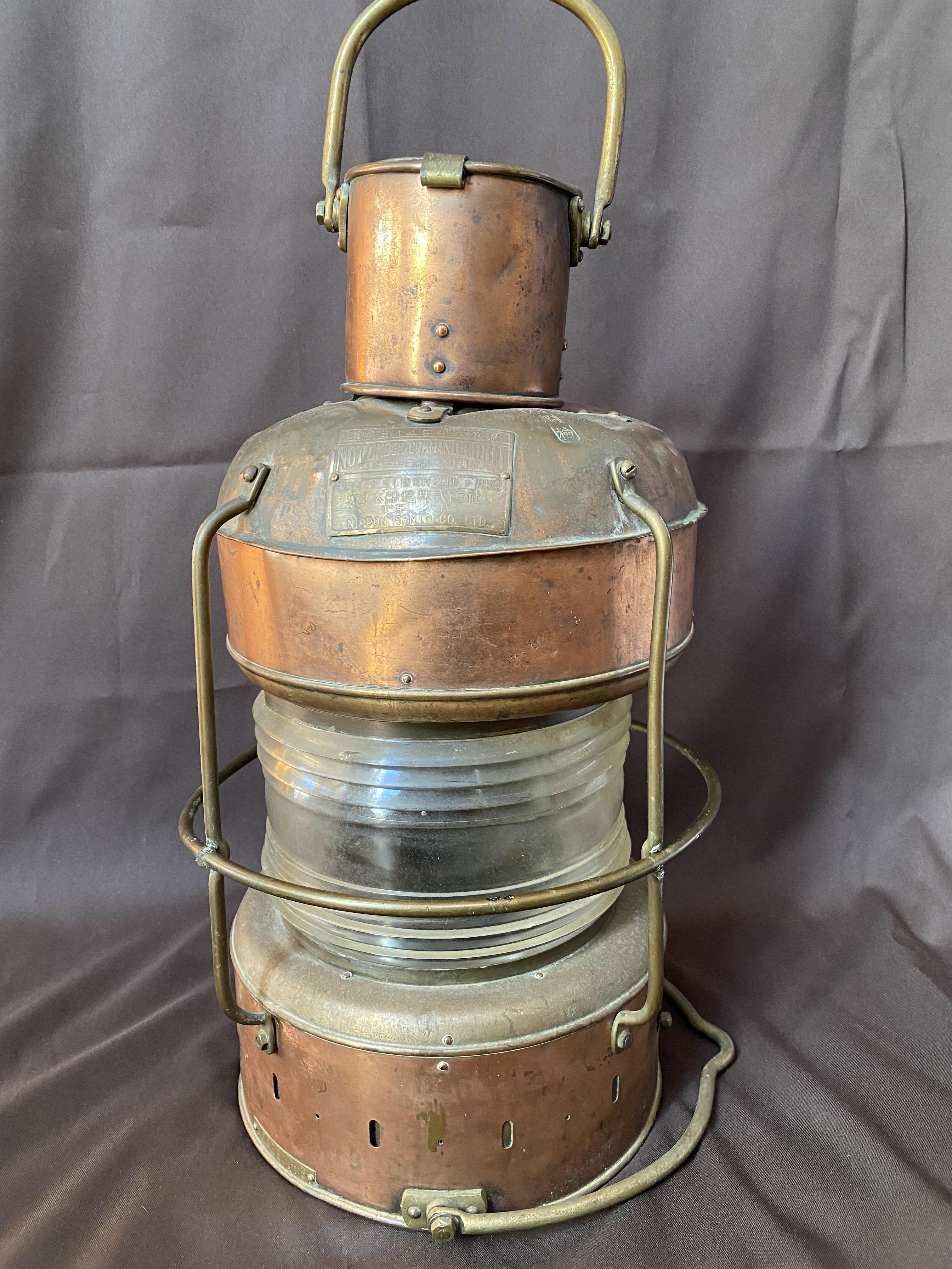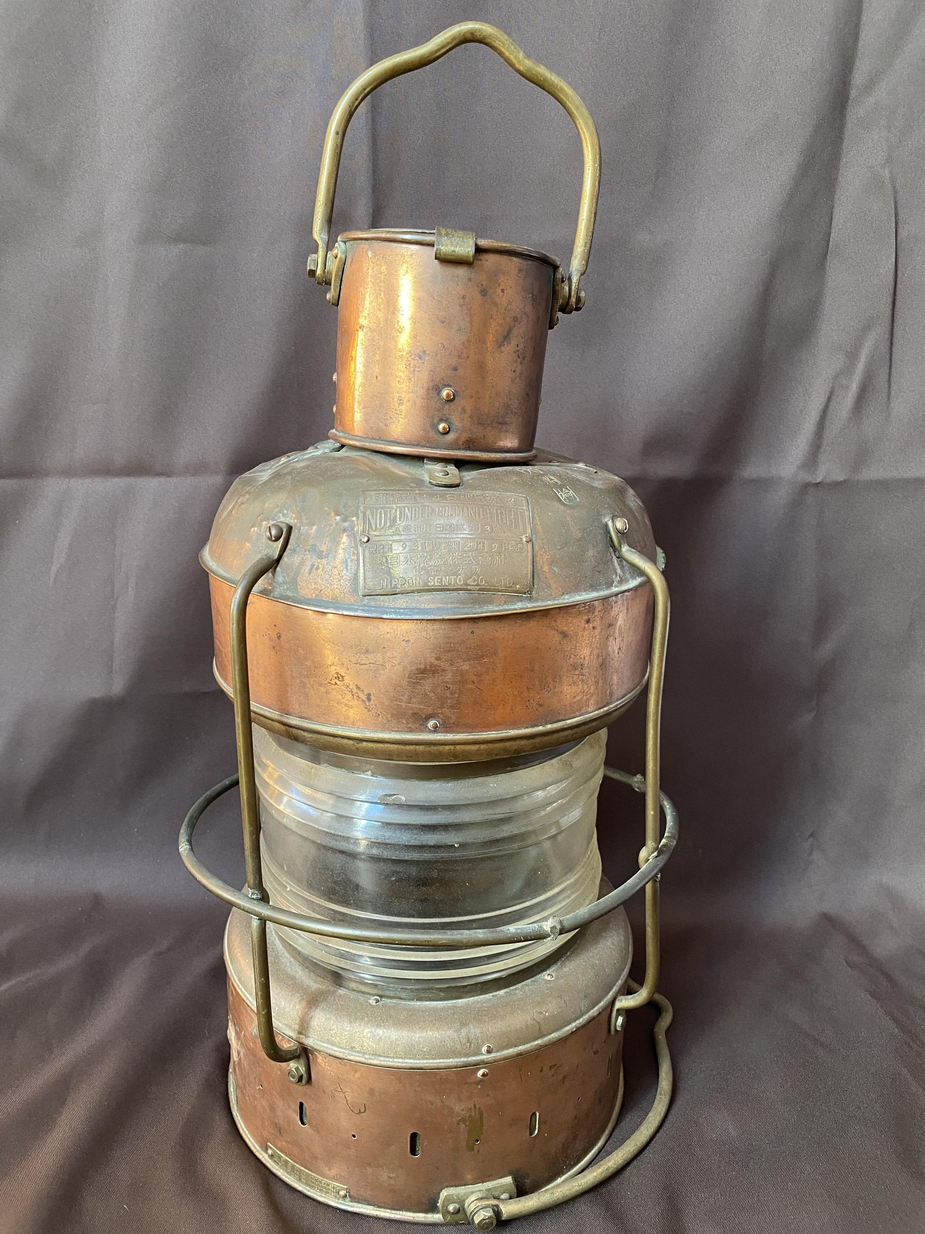 Circa. 1950. This large copper ship's lamp is perfect to convert into a fantastic pendant light; perhaps for a stairwell or just a large room. It has the original Fresnel Lens which will produce a lovely light with the right light globe.The central ring requires some resoldering and the original oil burner is missing. Marked with numerous Japanese characters and in English with " Not Under Command Light" " Nippon Sento Co. Ltd."