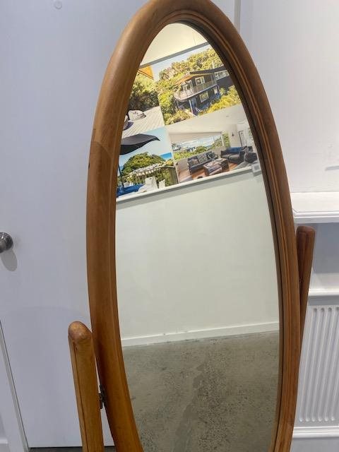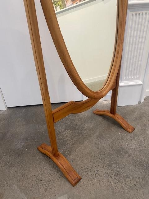 This Cheval mirror has a lightly stained wooden frame and stand and is a perfect addition to a dressing room.