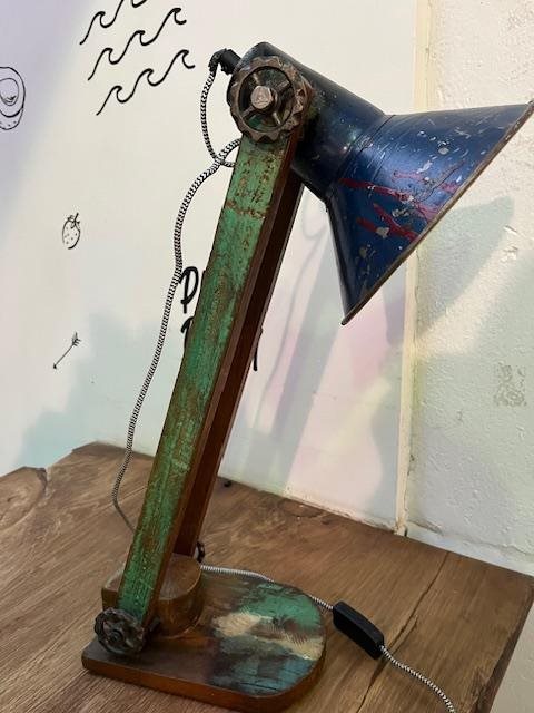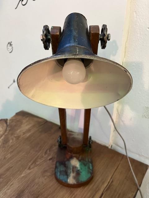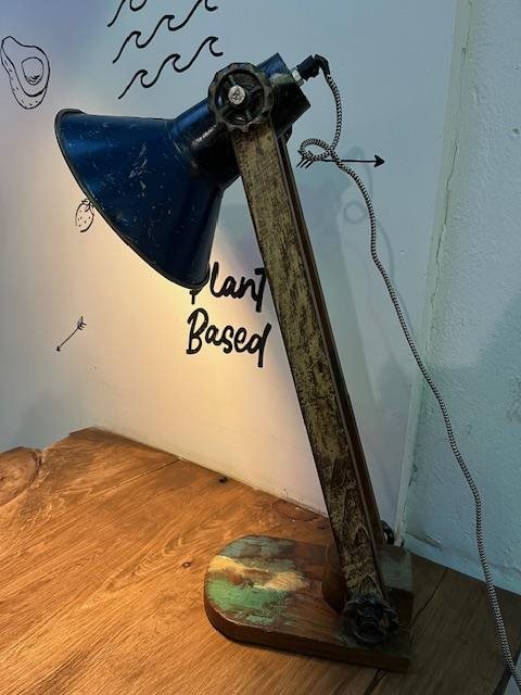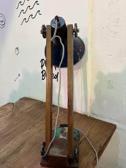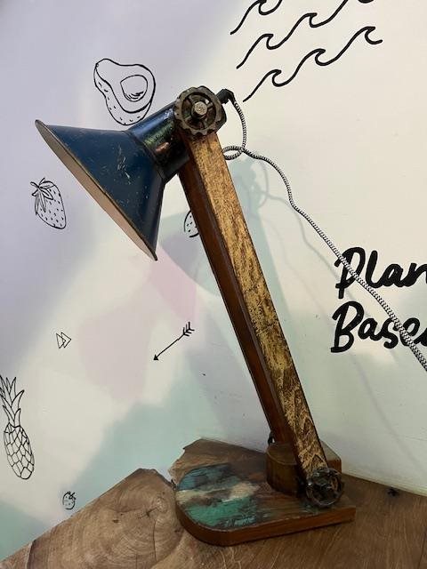 Industrial looking desk lamp. Made of recycled wood with a recycled tin shade.