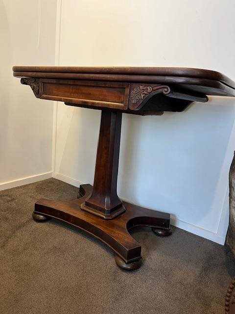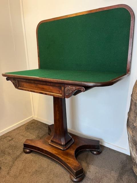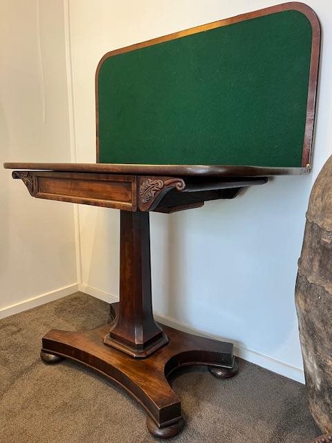 This is a lovely, 200 year old flap top games table in wonderful condition. It has green baize lining to the interior and a square colum supported by quadrupod base with casters. Beautiful chamfered corners with superb carved detail. Storage beneath the rotating table top. Folded, its a beautiful console table with superb mahogany top. Suitable for a hallwayand can then be wheeled out for a game of cards, mahjong or chess!