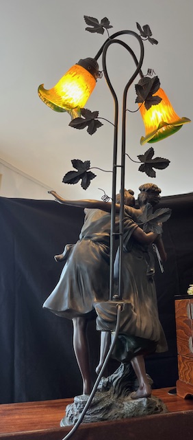 Lovely reproduction of a Victorian Lamp with two Bronze/Spelter like figures and two lamps. The realistic looking spelter/bronze is a resin.