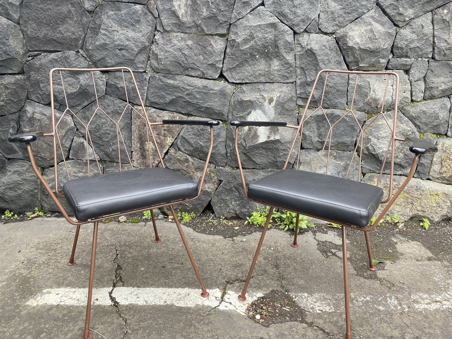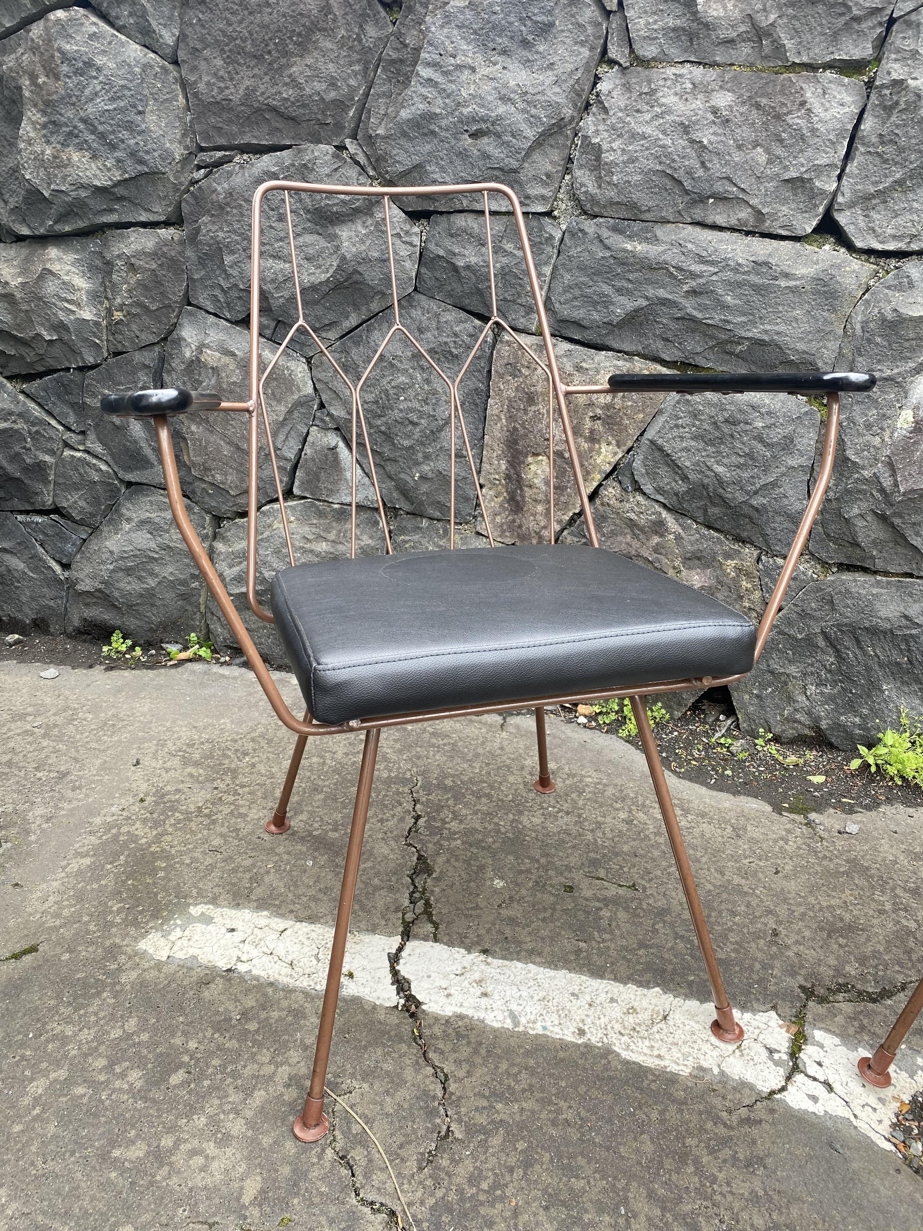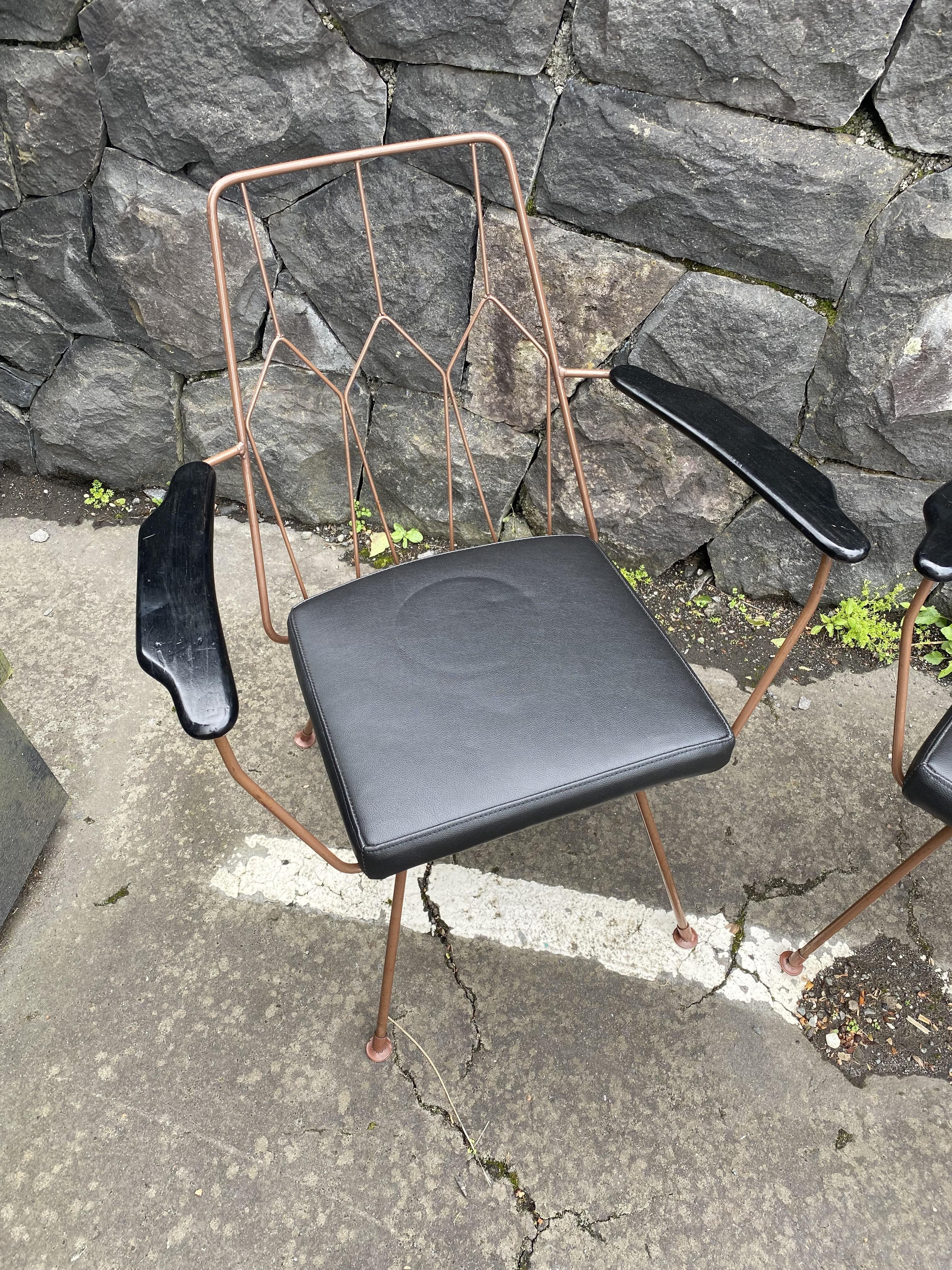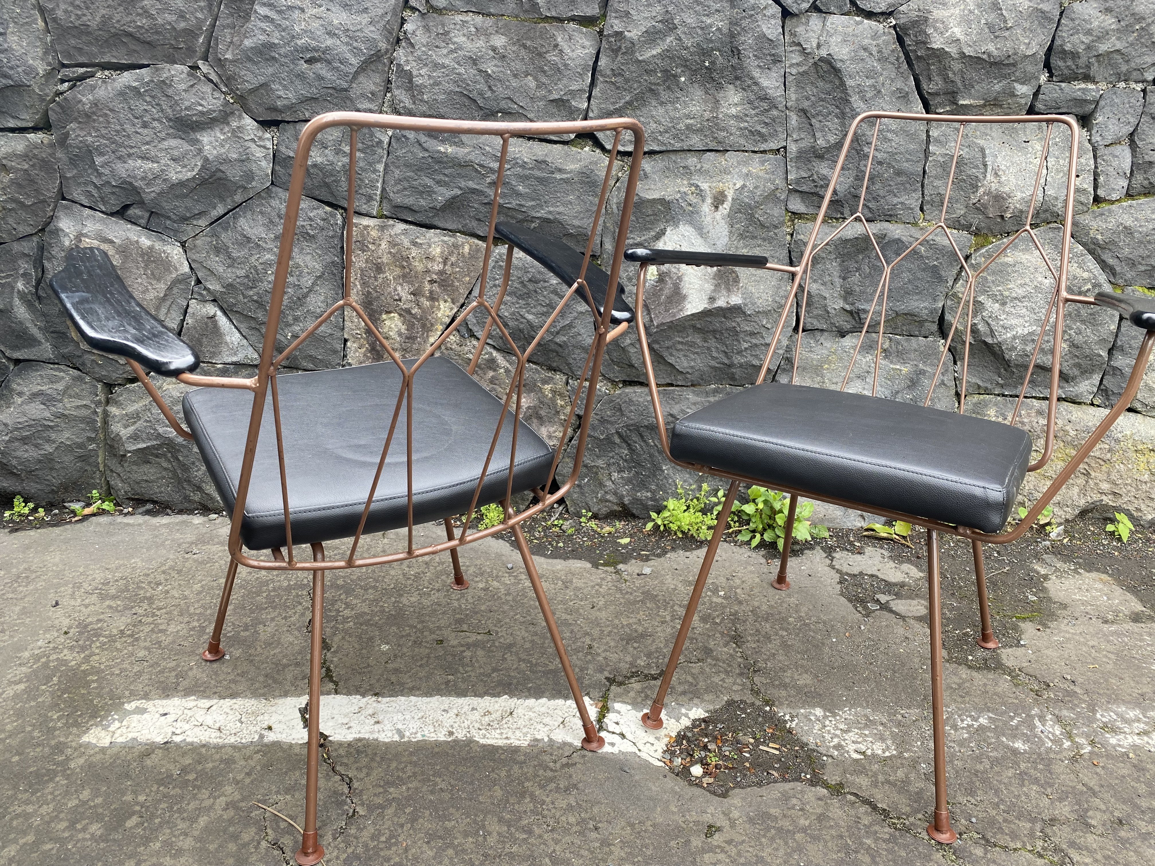 This original pair of mid-century armchairs have been lovingly restored with new black vinyl seats. The wire frame is painted in bronze and the wooden armrests in black.