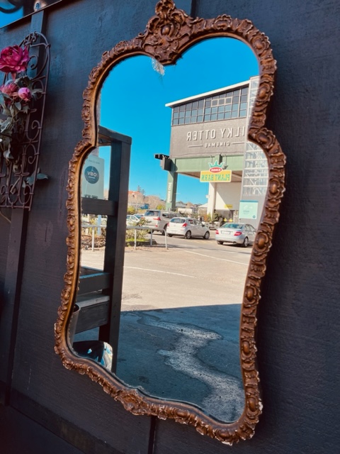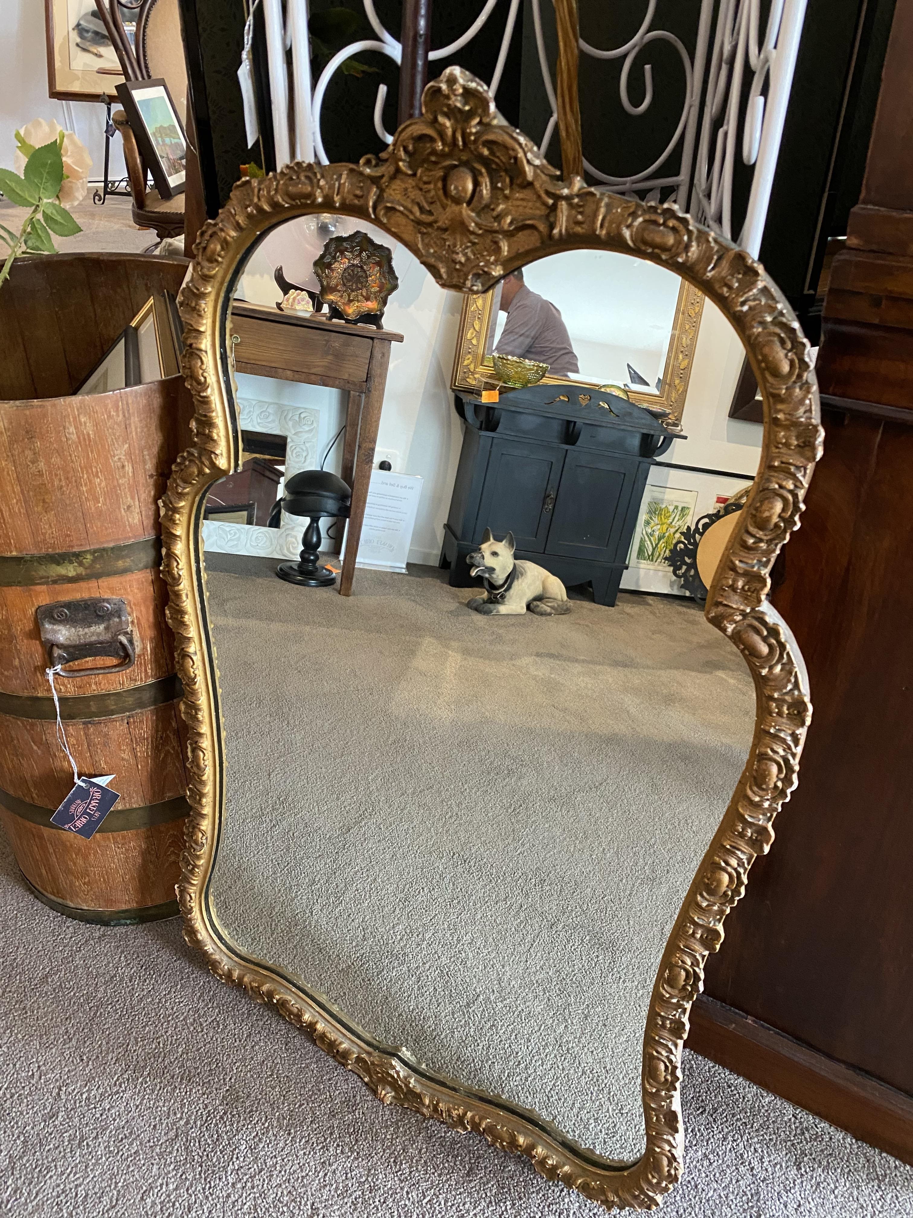Rococo styled gilt mirror in Cathedral shape.