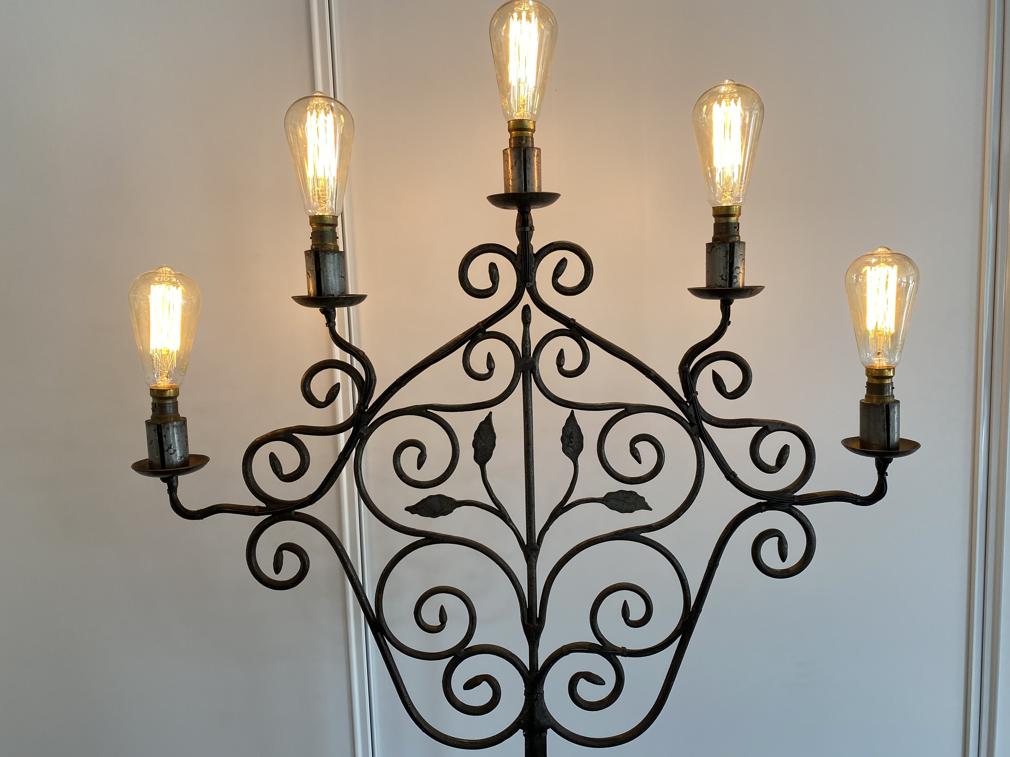 Grand and imposing Art Noveau period lamp. Would have originally had individual shades on each of the five lights however the addition of the vintage filament bulbs have elevated it to a new level of grandeur.