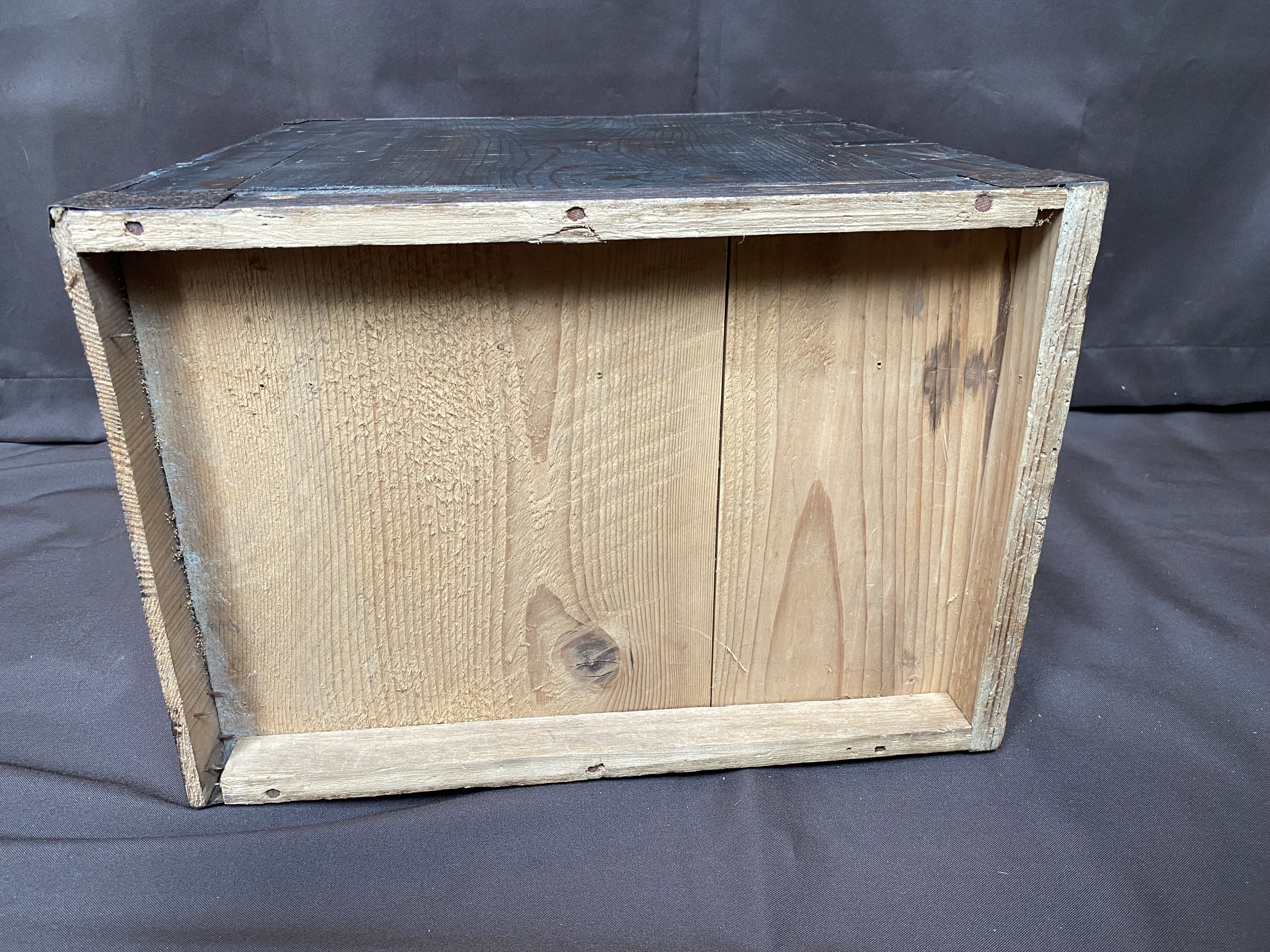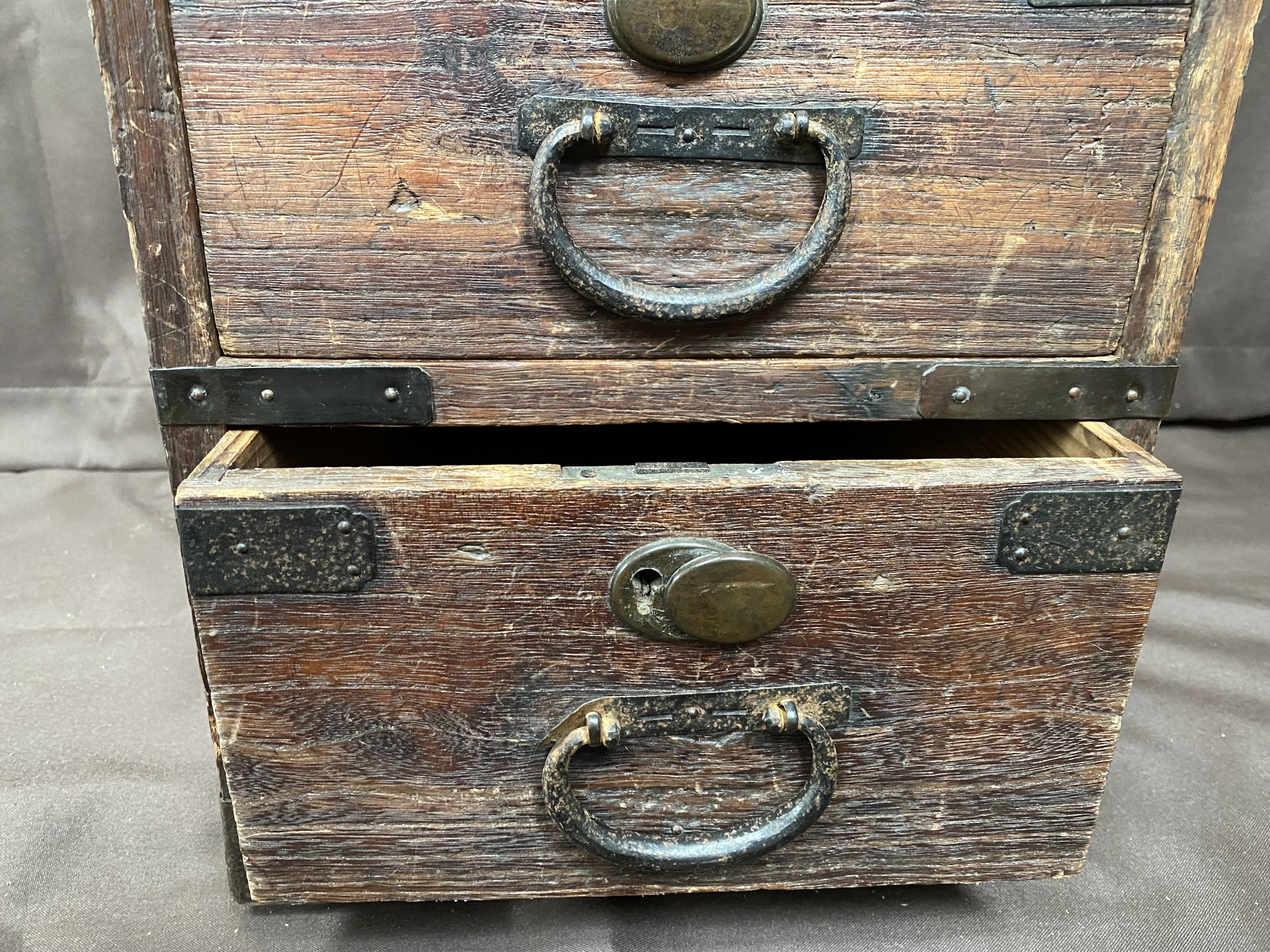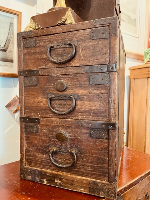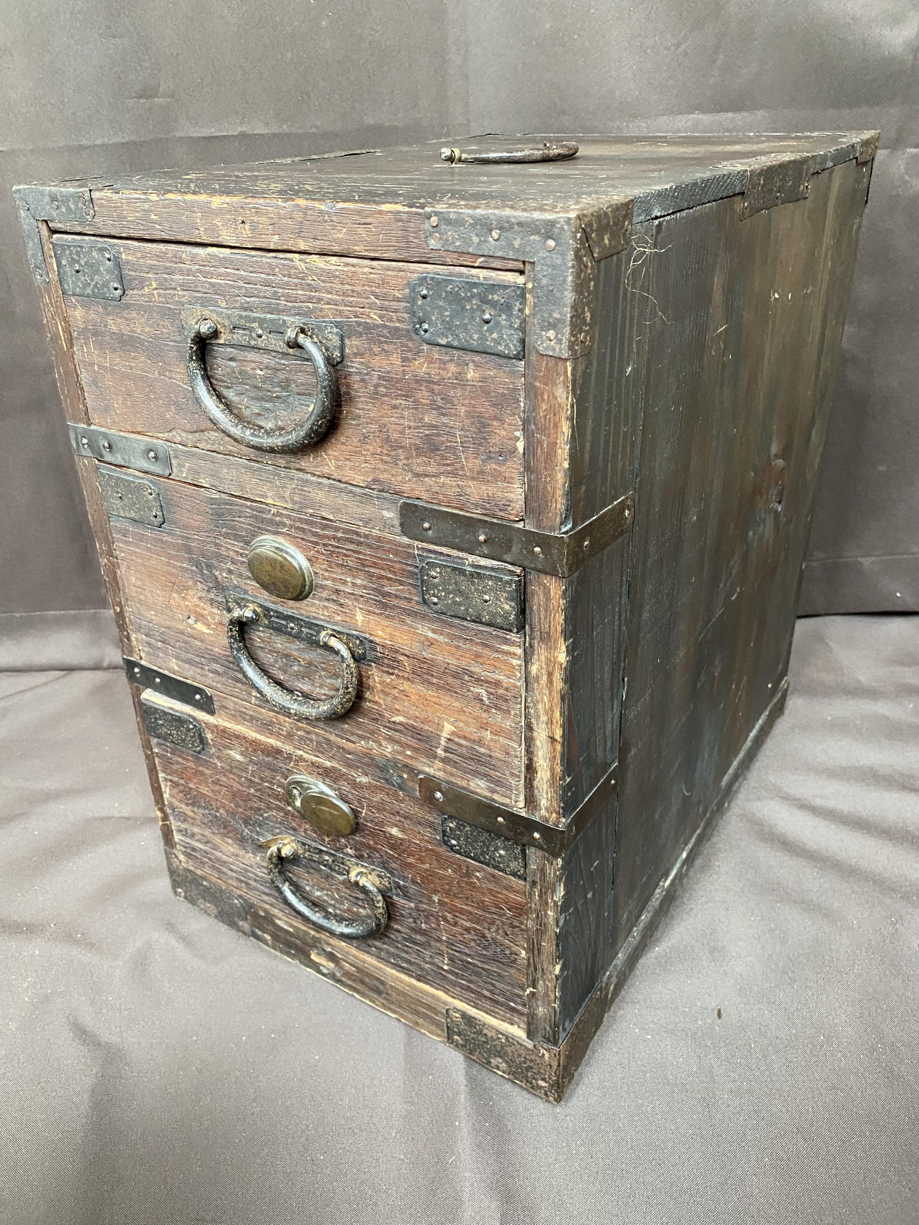 Rustic old Japanese set of drawers with metal banding and corners. Each of the 3 drawers have cast iron handles and