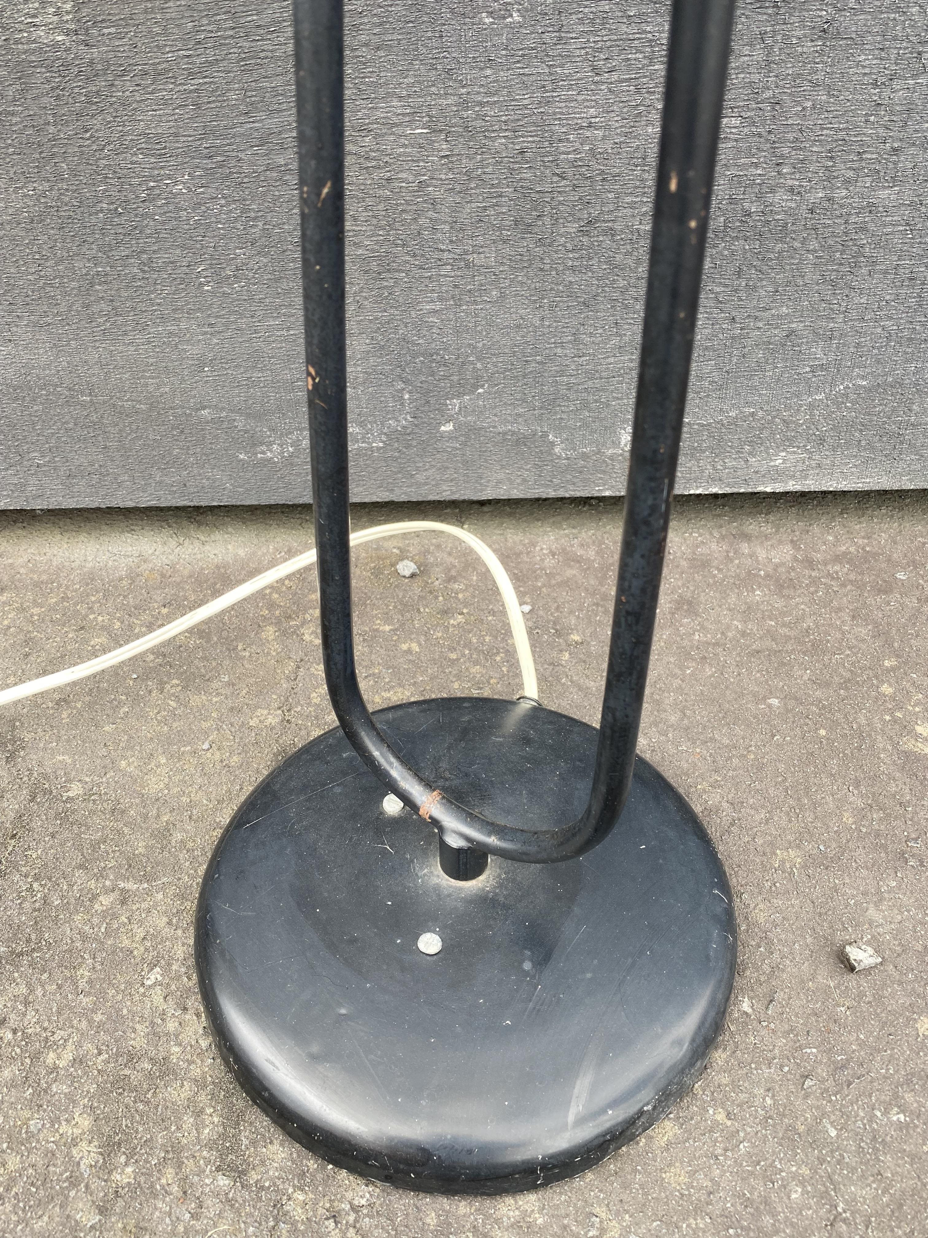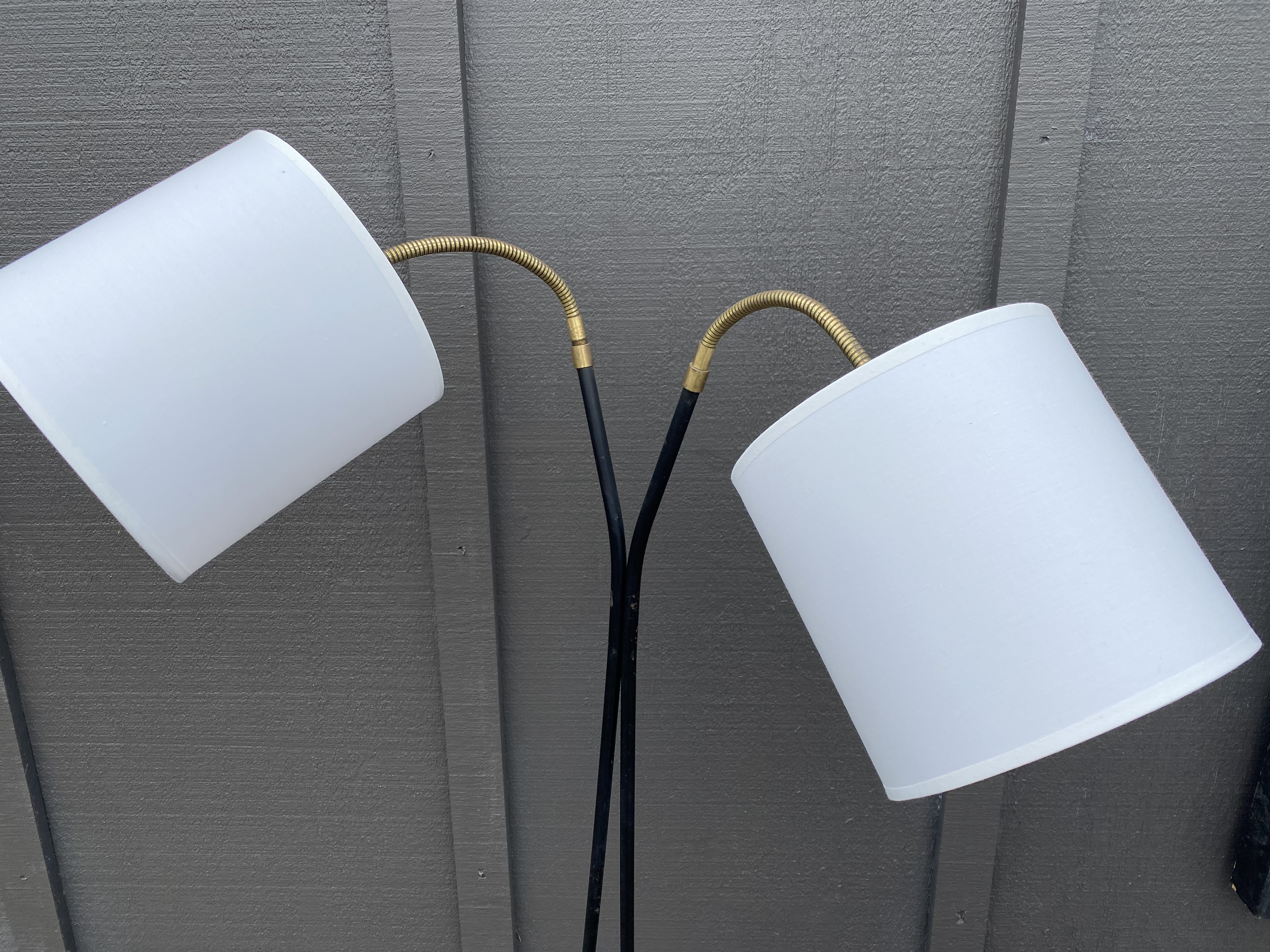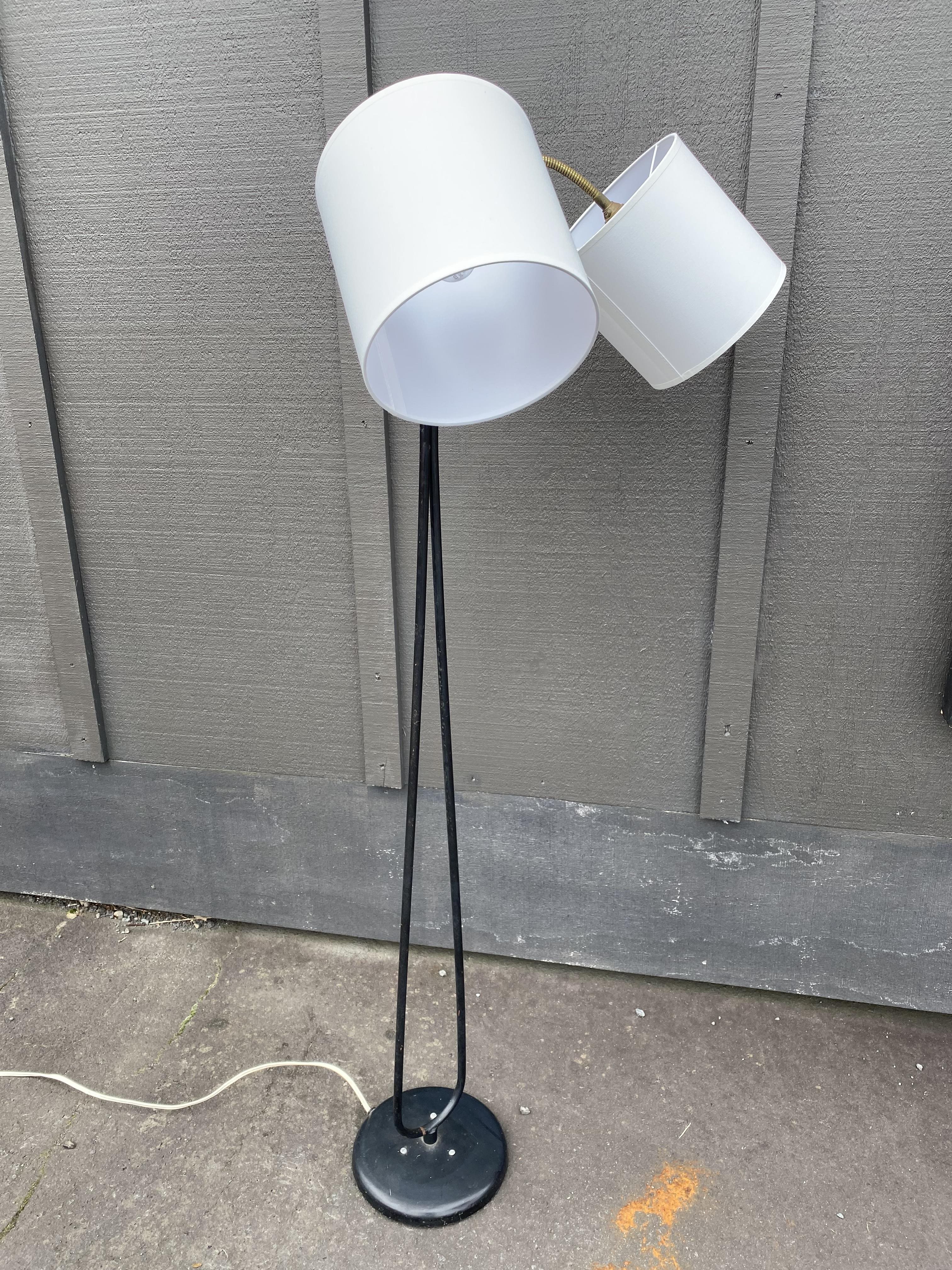 This original standard lamp is probably from the 50's or 60's with its black finished metal stand and articulated brass lights. With a double-head, the white shades are new and could easily be replaced with anyother style, or simply remove altogether and add filament lamps for a different effect.