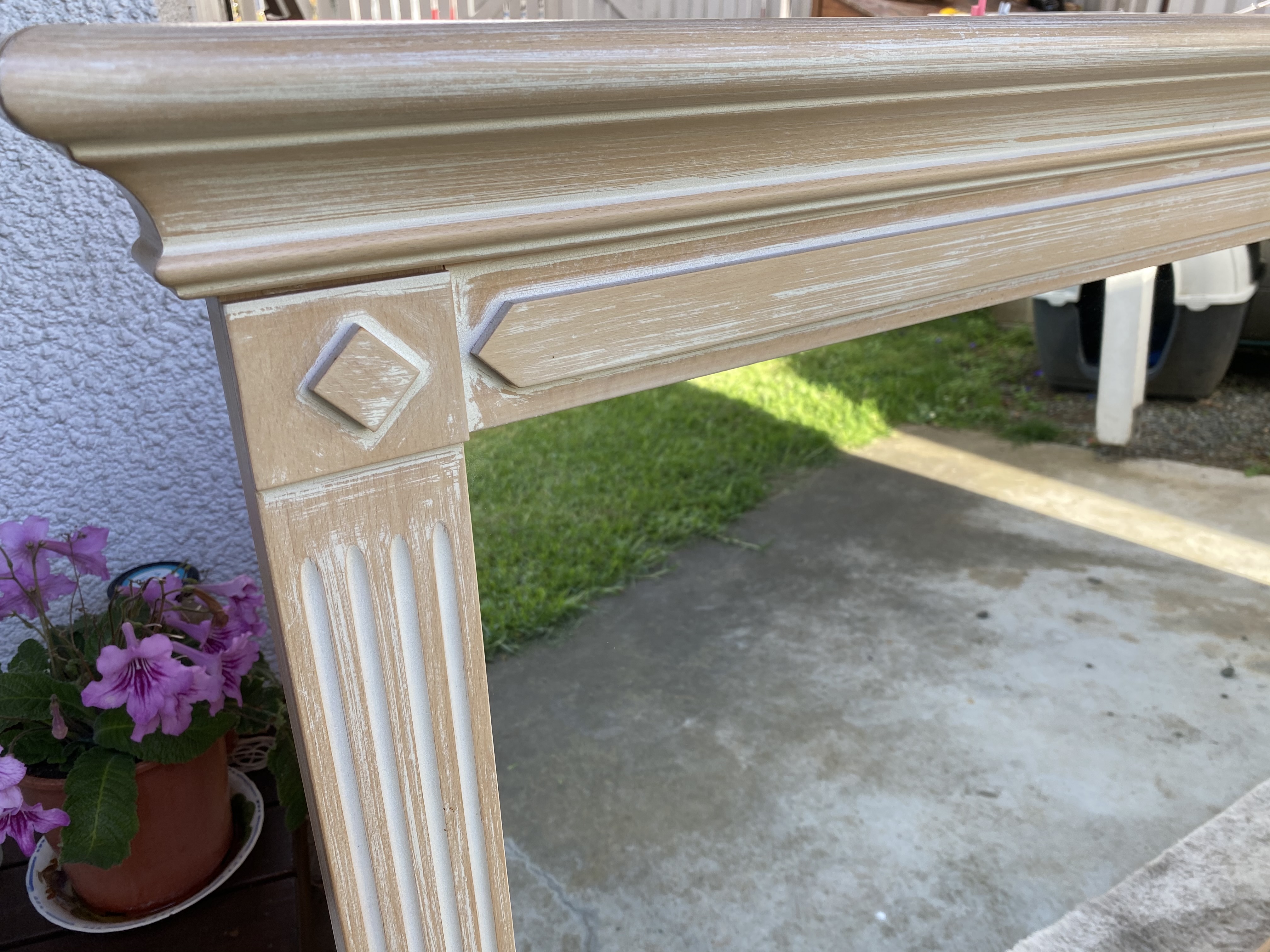 Very large wooden framed mirror in the Empire style with a wooden fame in the form of two columns supporting a pediment or entablature.