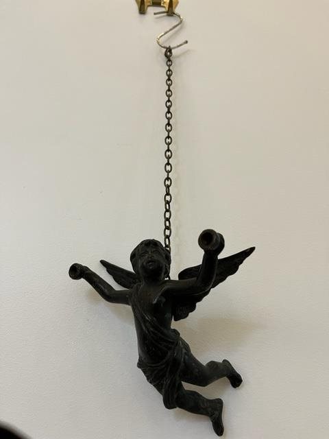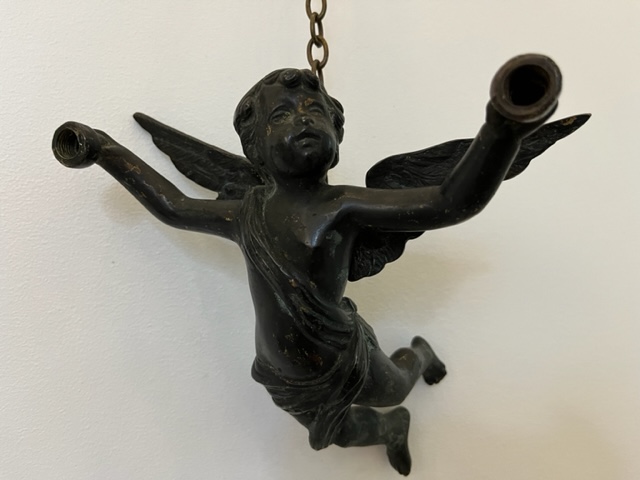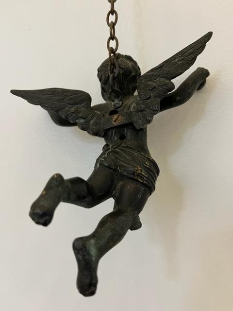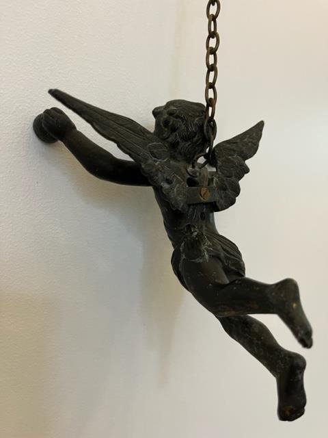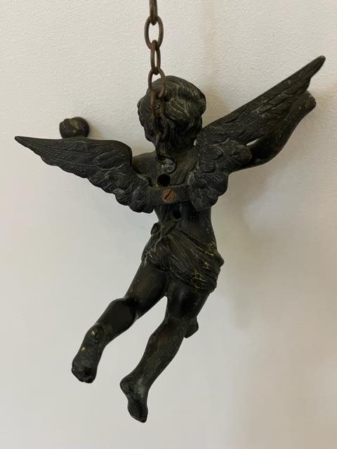 Made of bronze, this light fitting depicts a flying cherub holding two lamps.