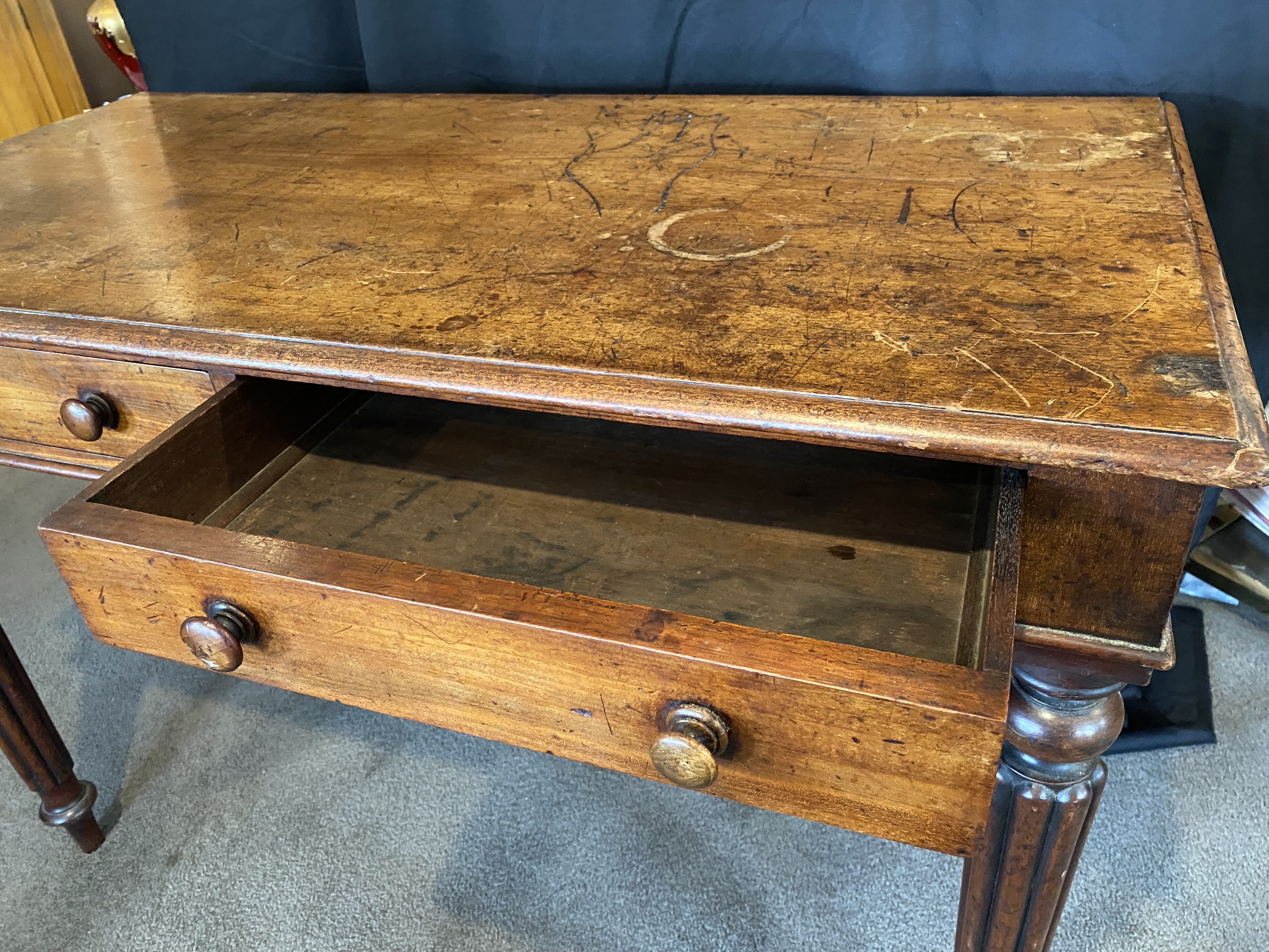 A lovely Victorian mahogany side or Library table, with two frieze drawers, raised on tapering reeded legs.