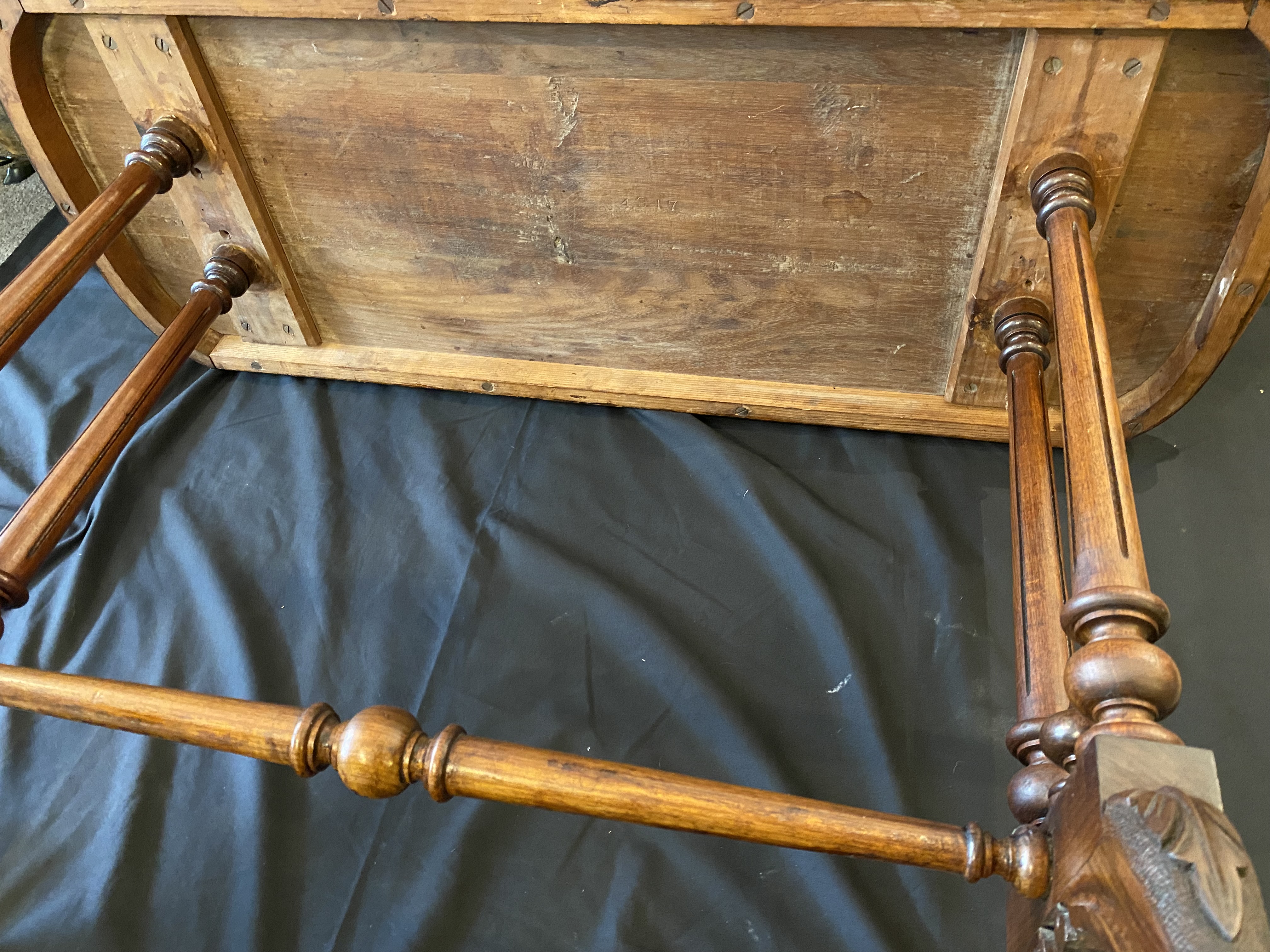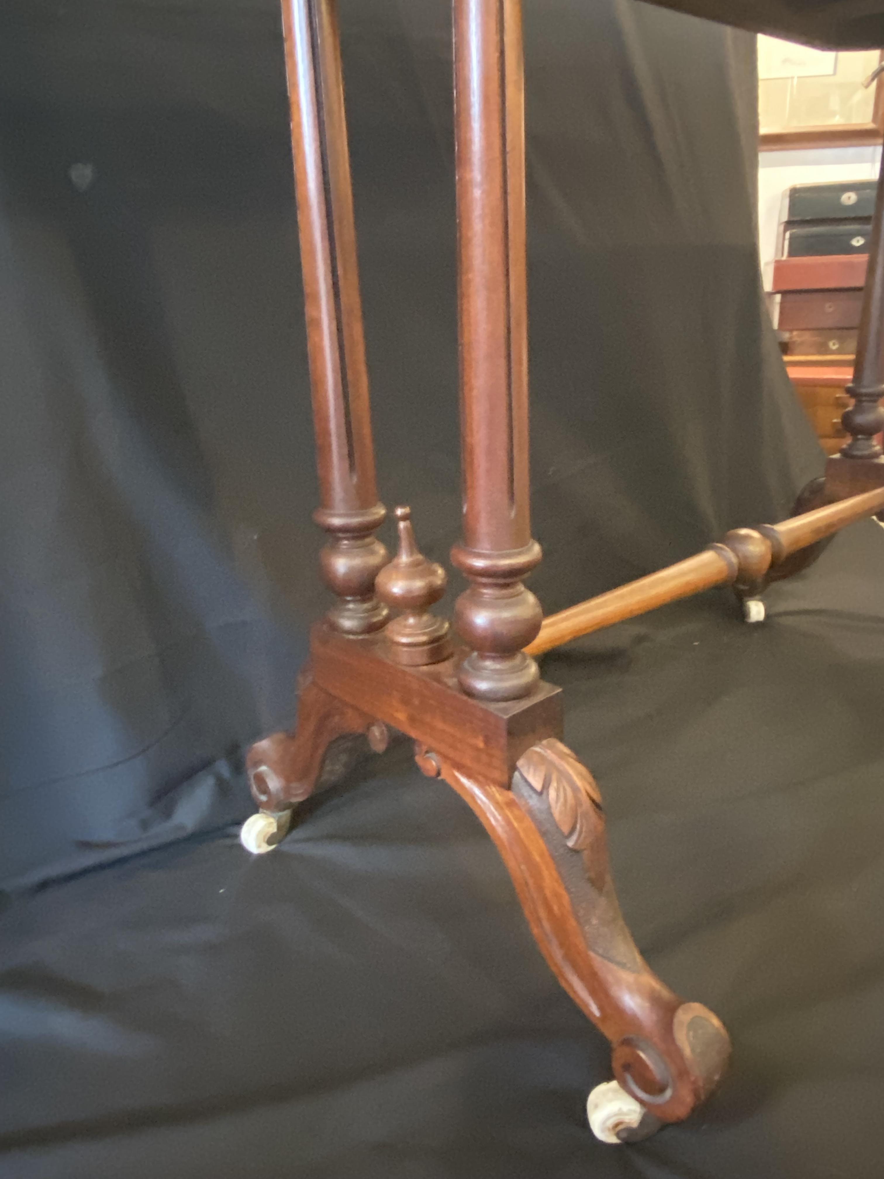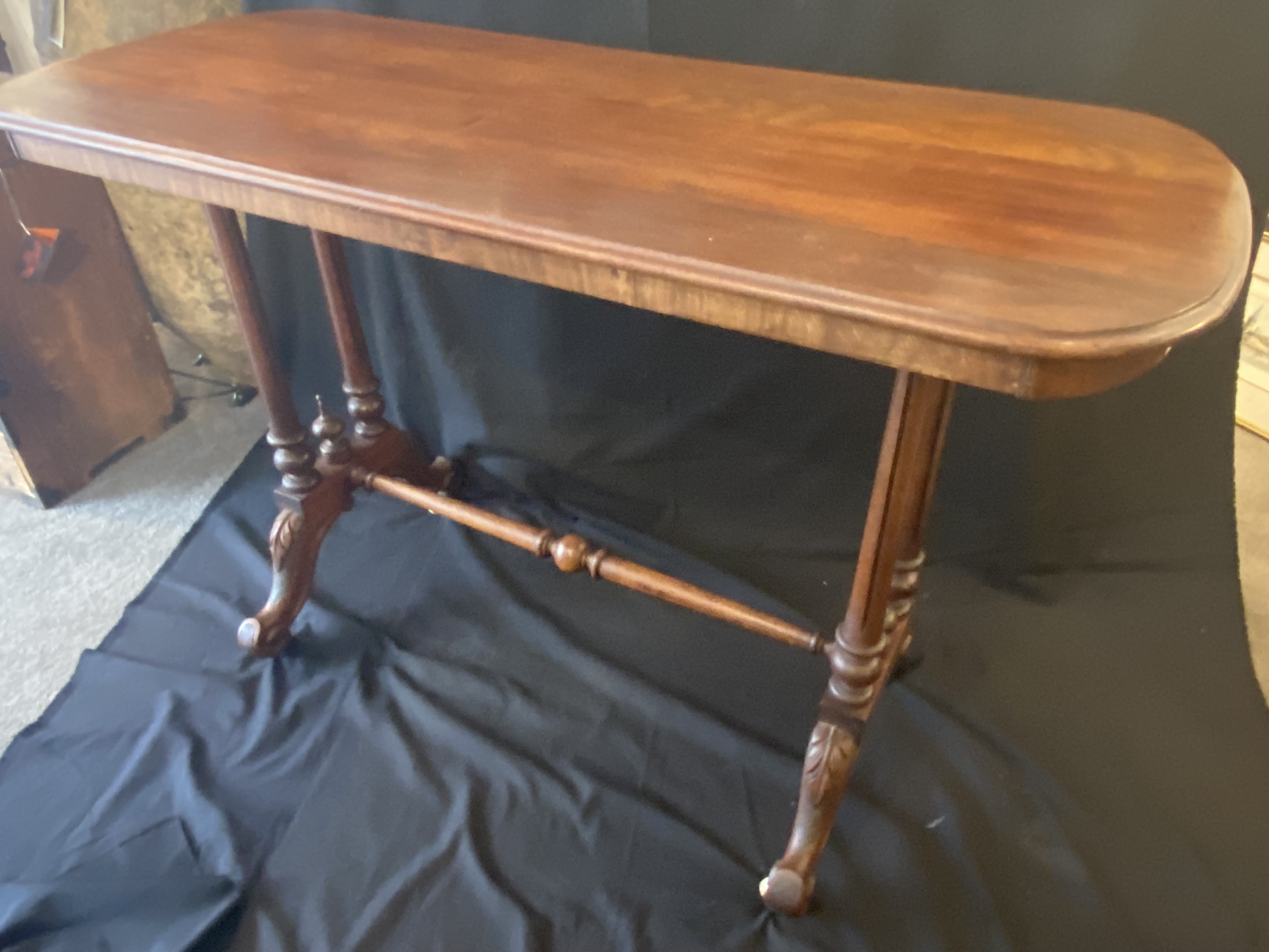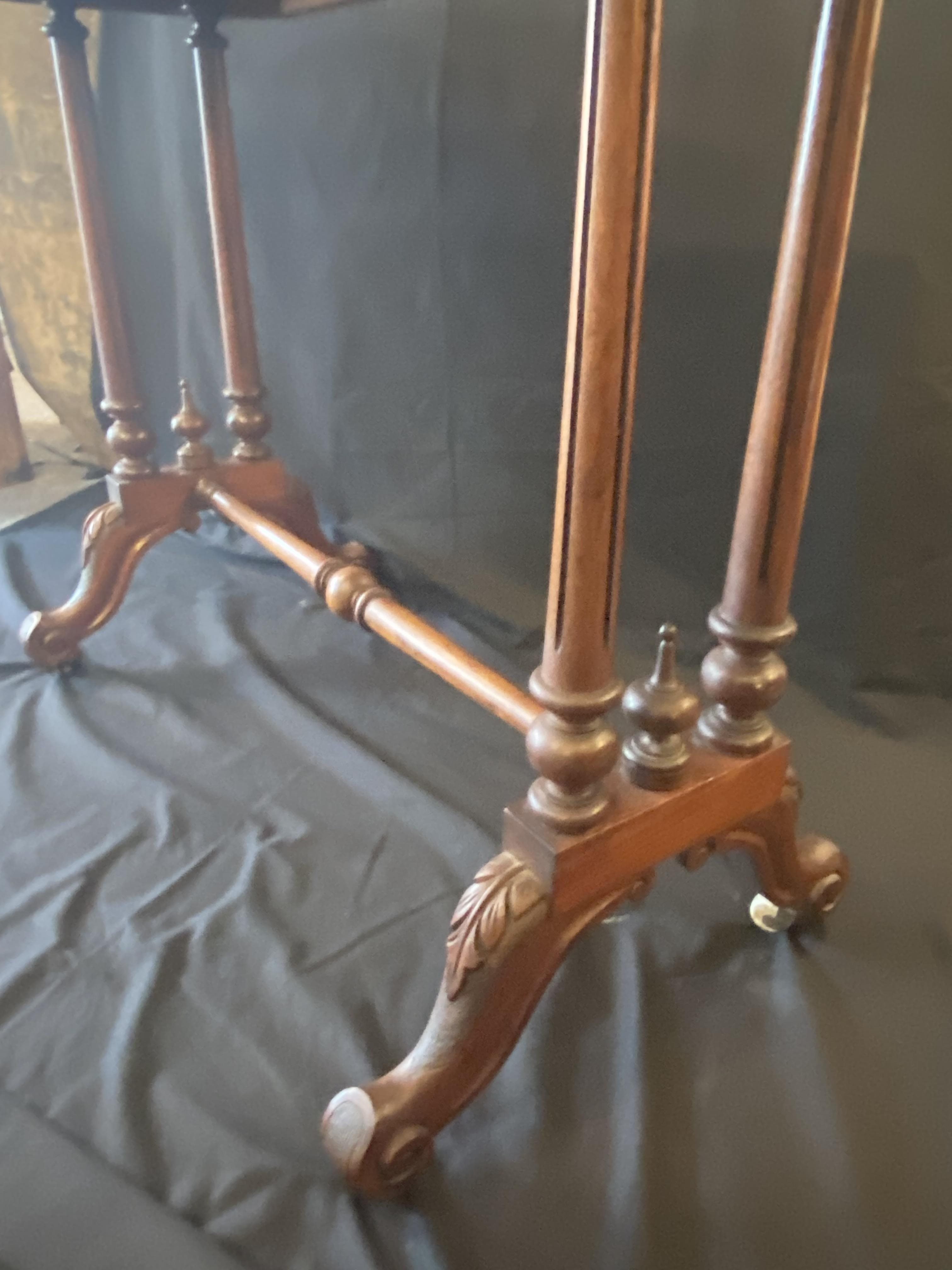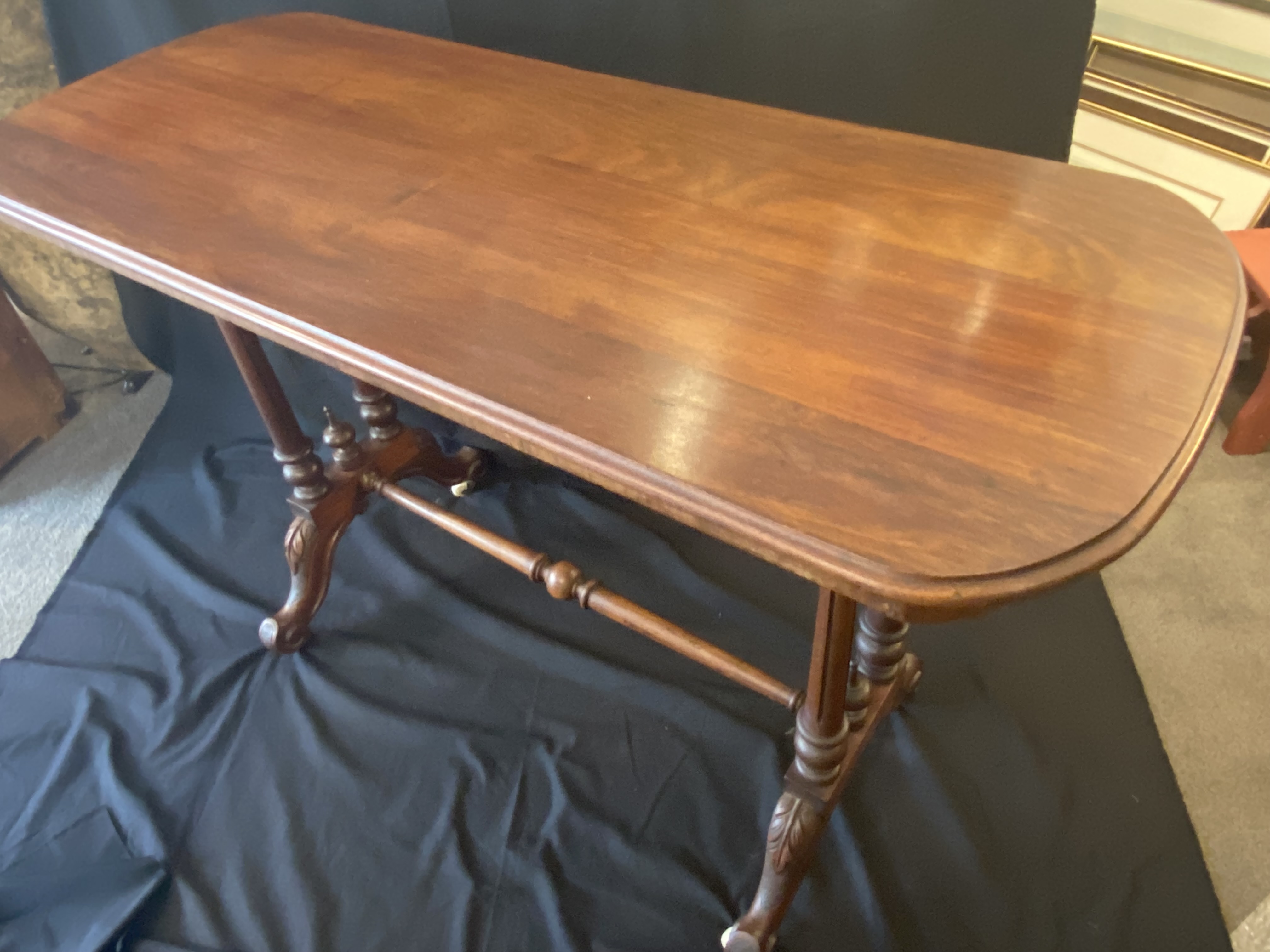 A Victorian walnut side table, with double turned and fluted columns on stretchered base, scroll legs, finials and original white porcelain castors. In good polish. Length 1060 mm Width 440 mm Height 710 mm