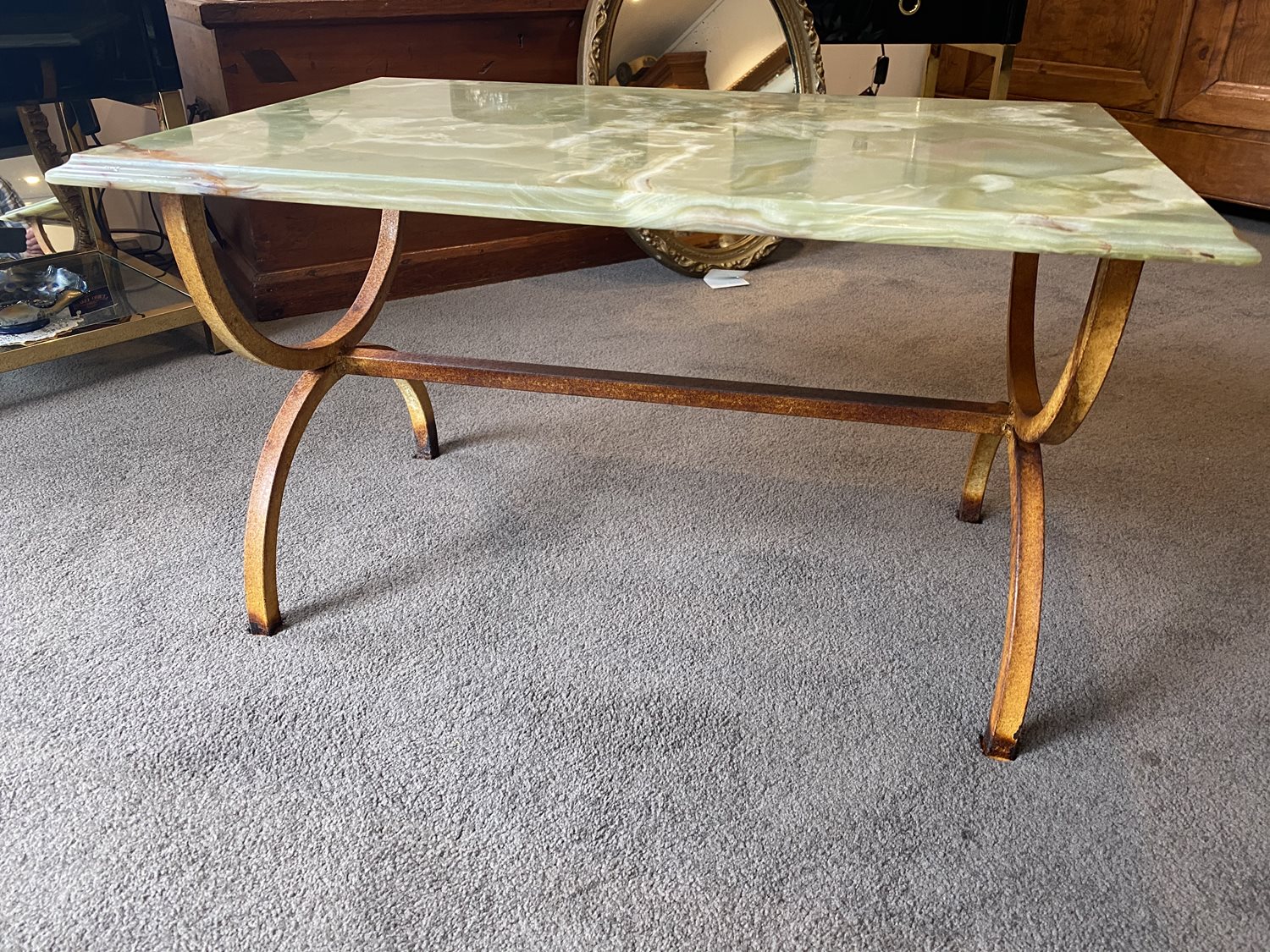 The light green marble top has beautiful clouding and some veining including a iron coloured mineral in one corner.