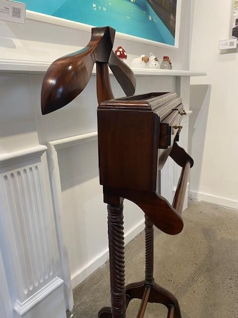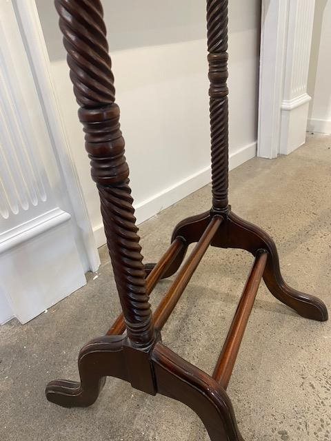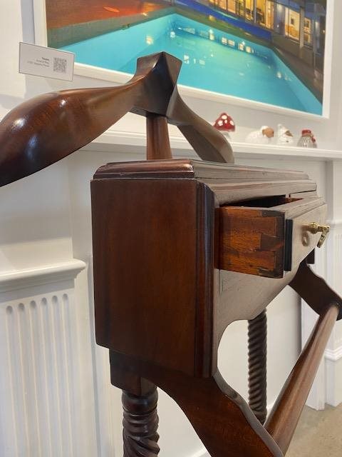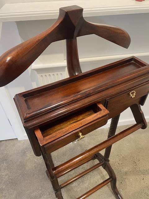 Beautifully crafted wooden Valet Stand for your coat and trousers. Includes tray and two drawers for other accoutraments or to just keep your essentials such as watch, wallet and car keys, in the one place. A great gift for the person who has, (almost), everything. Also, its simply a beautiful piece of furniture with it's polished wood and barley twist legs.