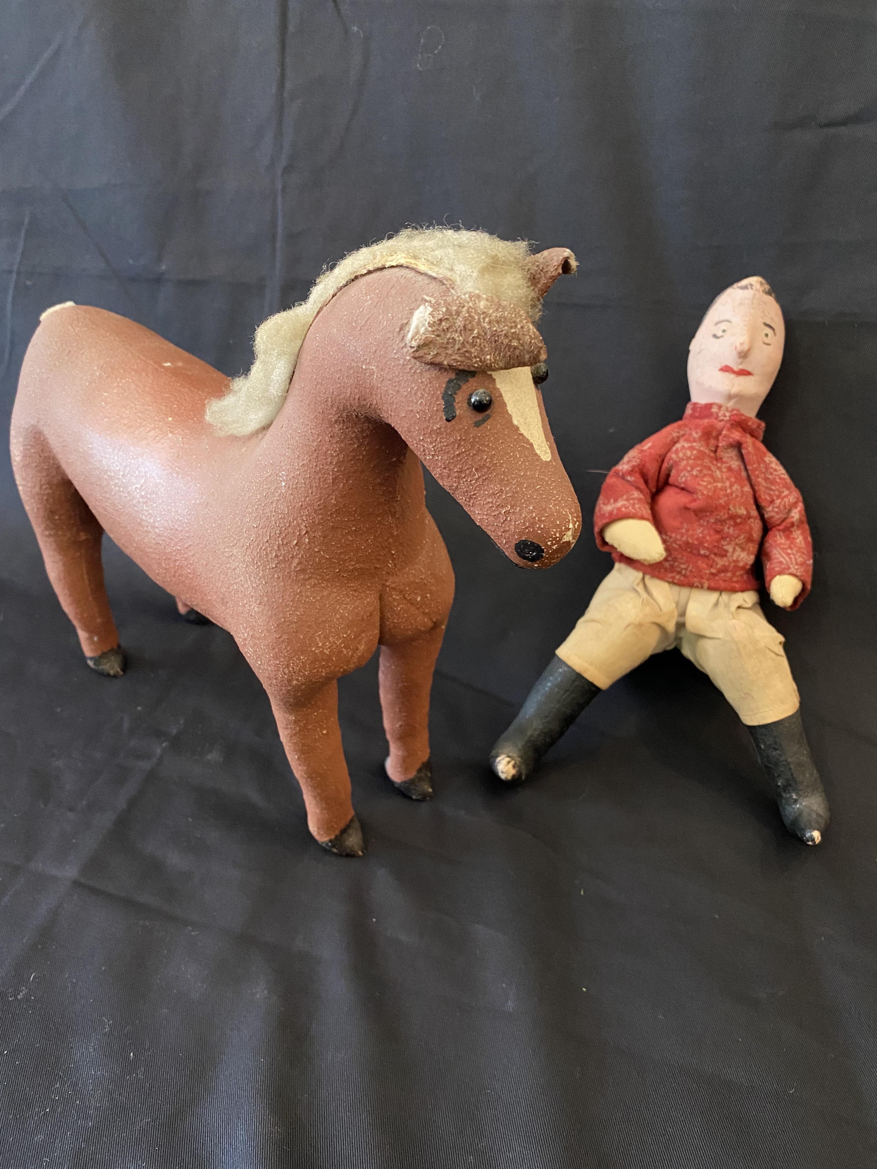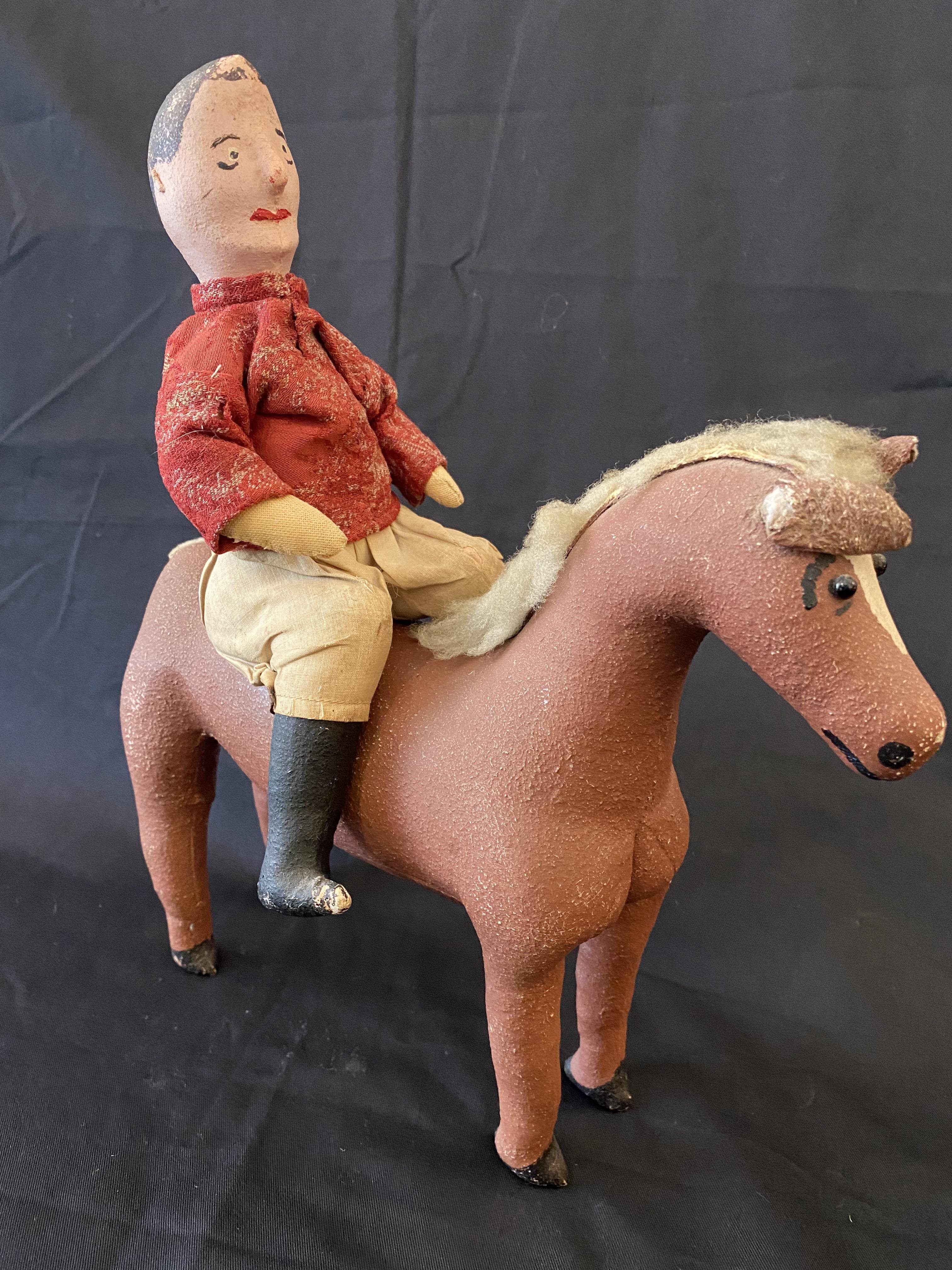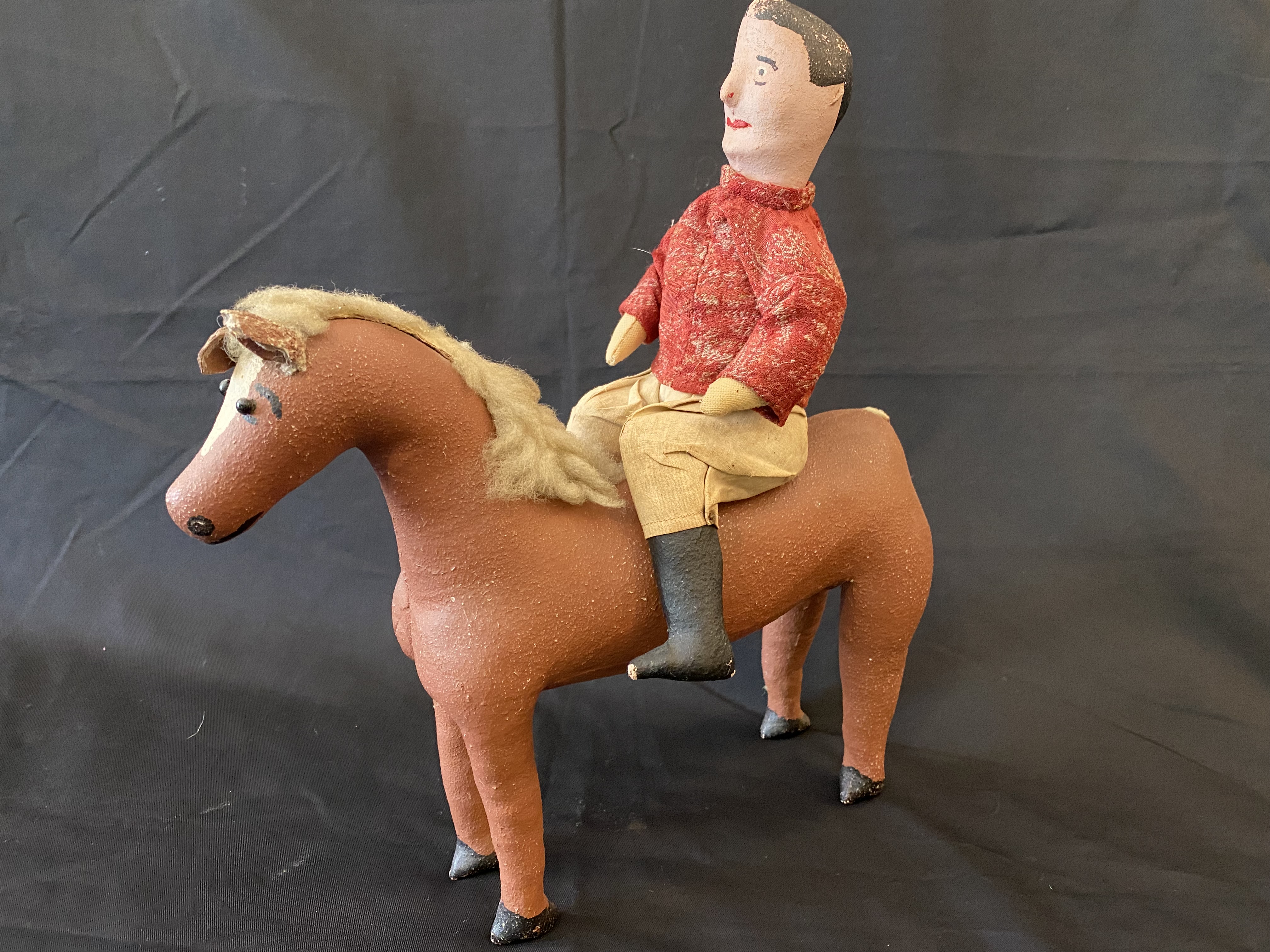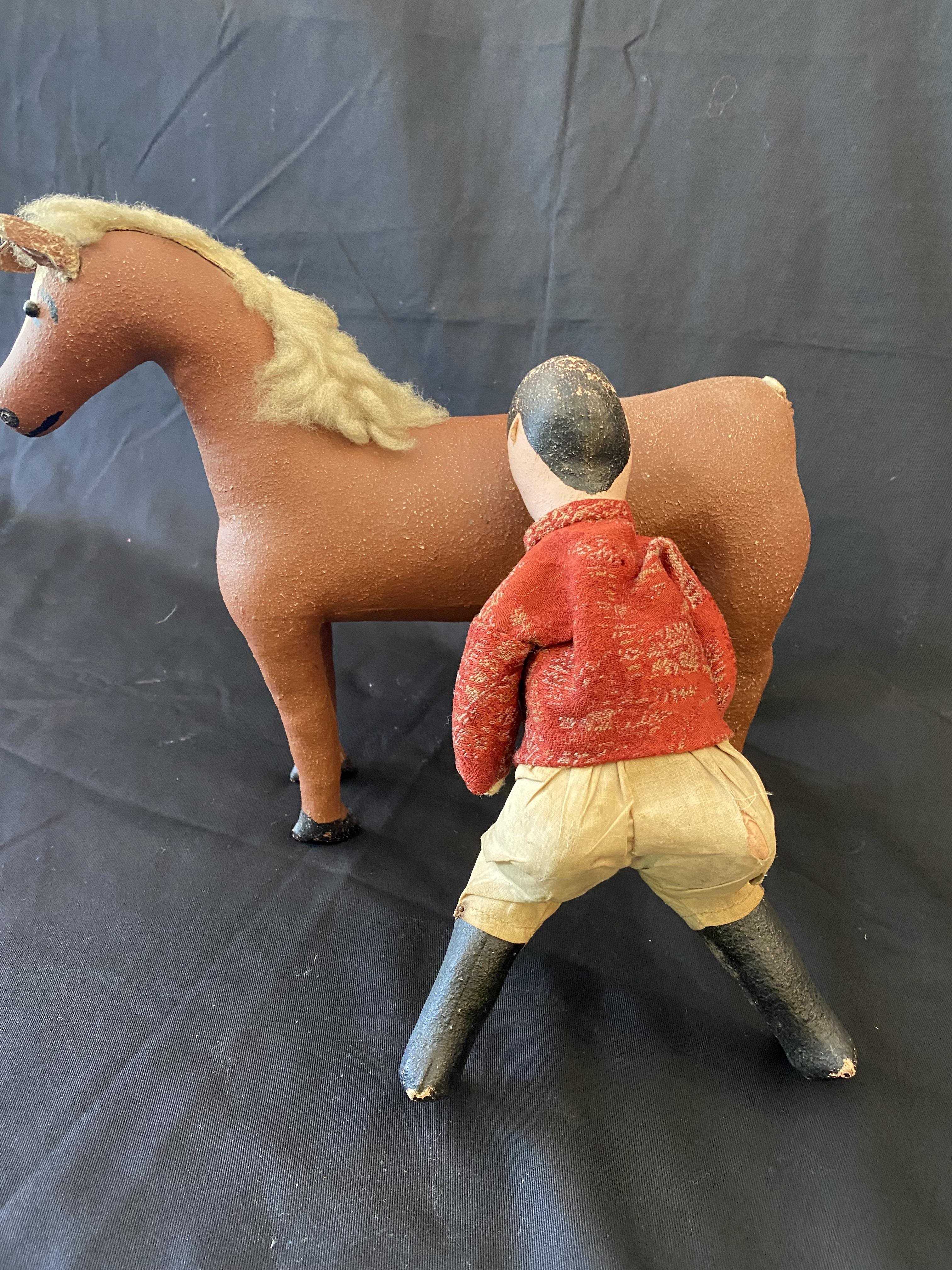 This naive horse and rider are wonderful. Probably incomplete, (I imagine the rider would have originally had a hat or helmet and the horse a tail!), and showing some signs of its age it is nonetheless a unique and one-off piece. He's probably a jockey judging by his colourful shirt, black boots and jodhpers. Origin and materials are unknown but we know that no one else will have one:)
