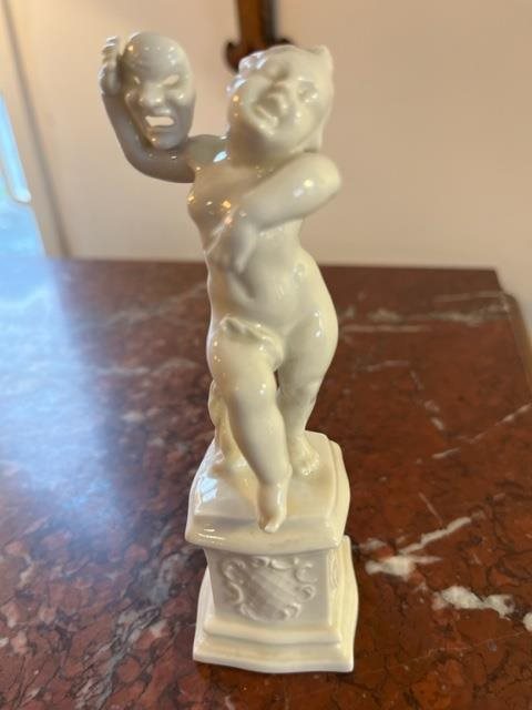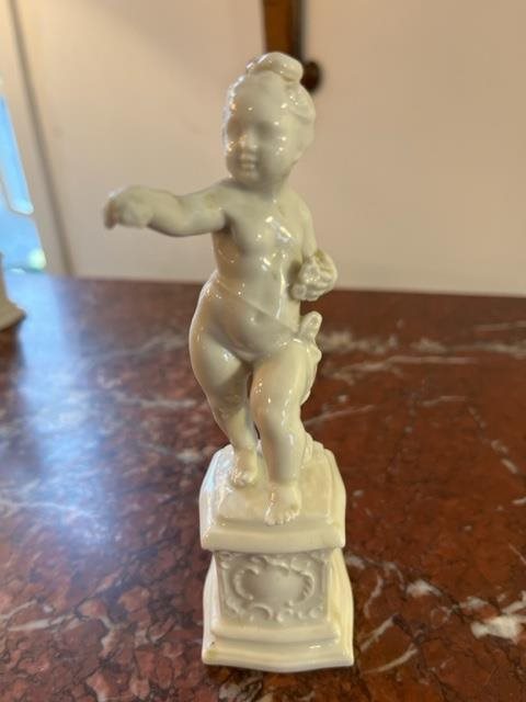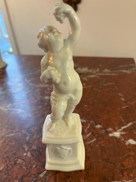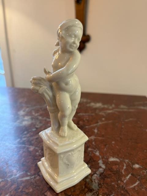 These 4 delightful figures of Putto or Cherubs are in a milky porcelain, each standing on their own plinth and representing different activities; one is eating grapes,(Gluttony?), another with a sheaf of wheat,(Enterprise?), the third with a mask, (Deceit?)). There is a small break on the wheat sheaf.
